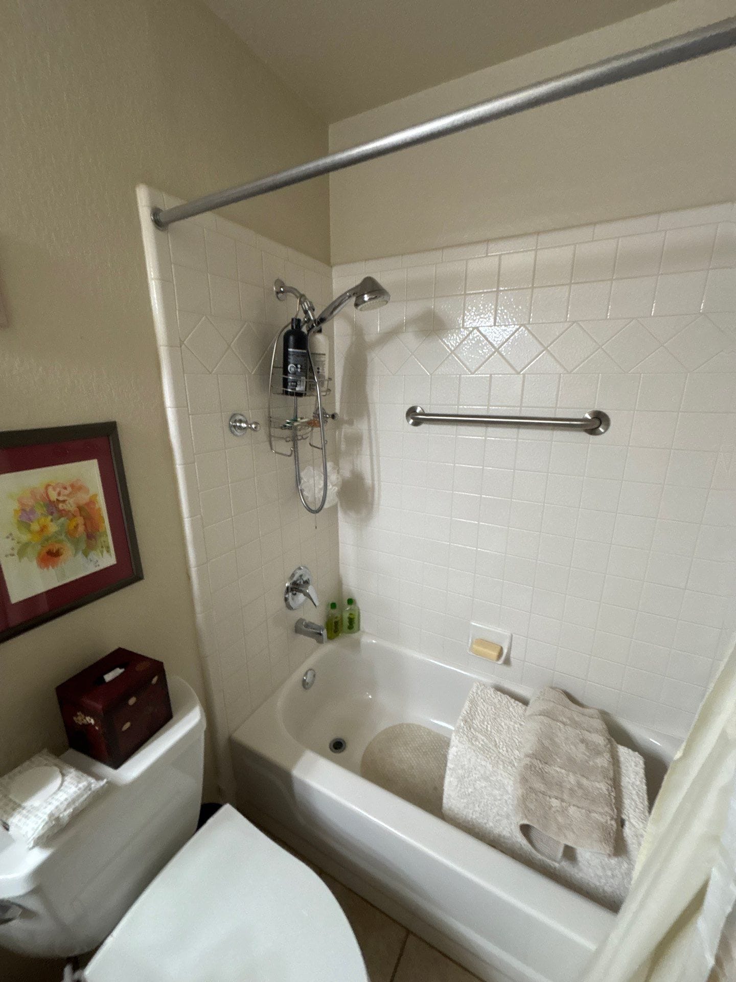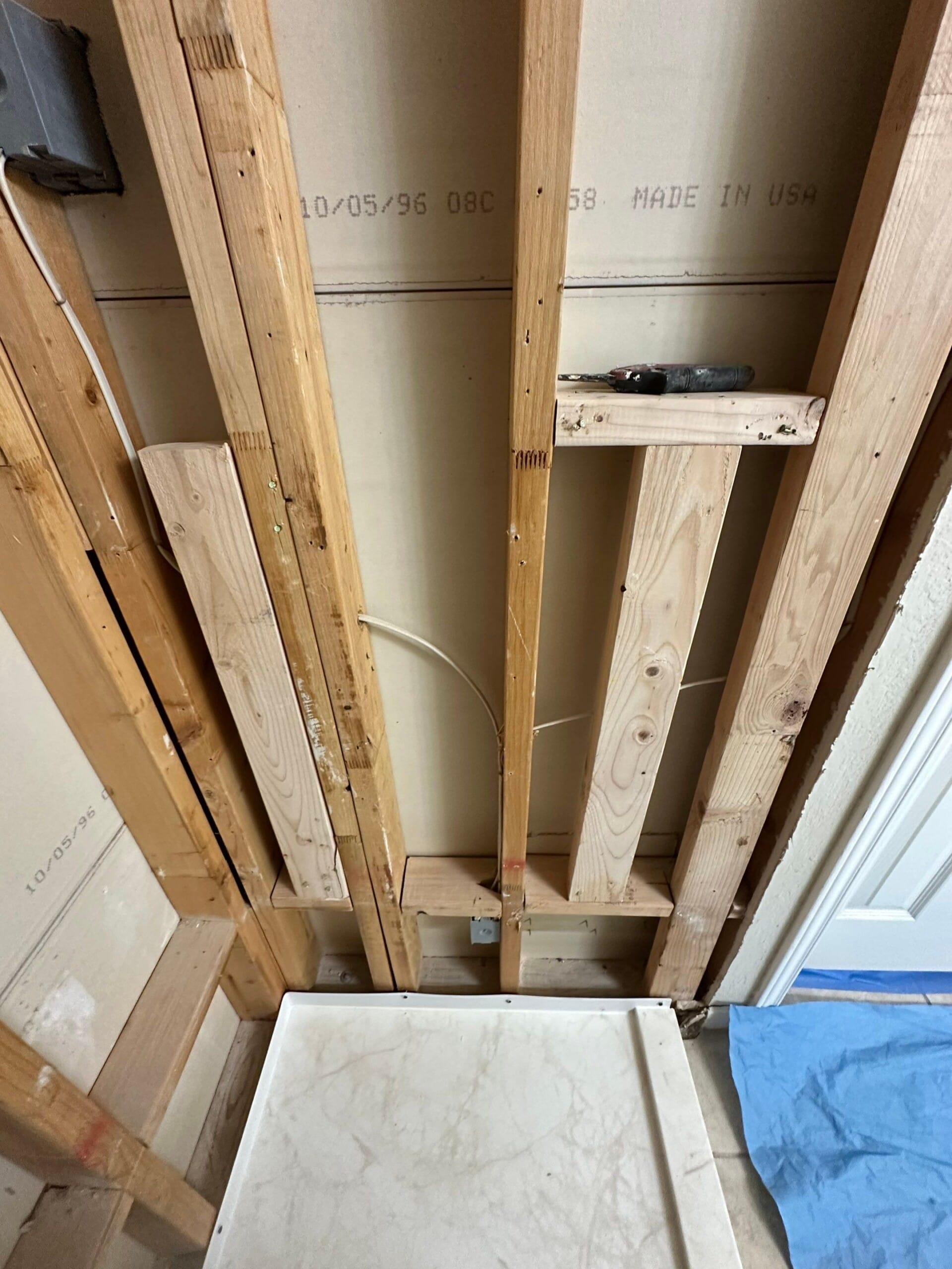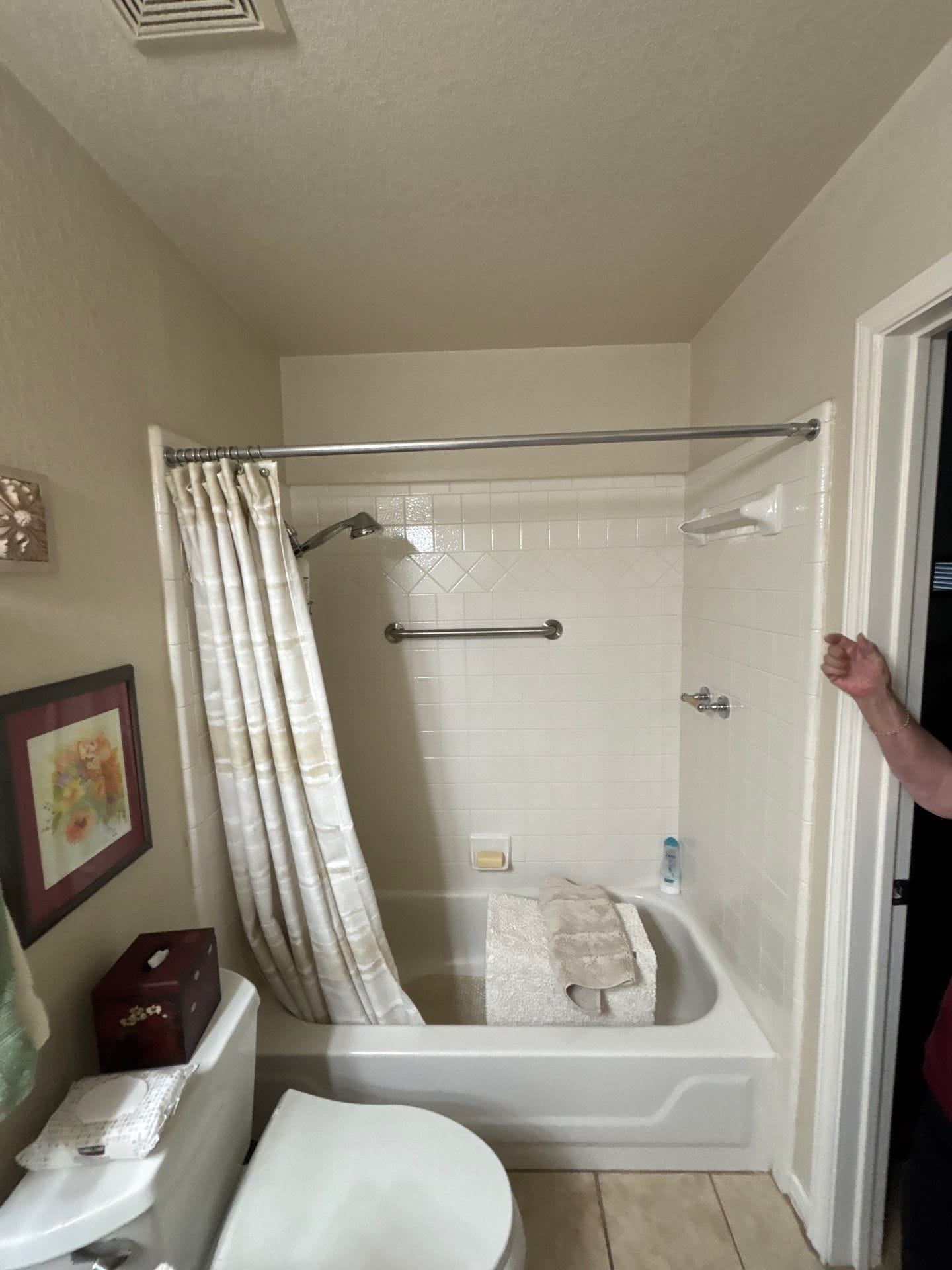 Installation involved a full removal of the existing tub and tile, with demolition down to the studs, moisture check, and plumbing updates included. The crew installed a reinforced, non-slip, thermal-insulated shower base and waterproof Shower Shield wall backer before mounting the composite walls. Features included a fold-down teak bench, two chrome grab bars with reinforced support, a corner shelf, and a handheld showerhead on a vertical slide. All seams were sealed with antimicrobial silicone for durability. The worksite was cleaned and cleared within two days.