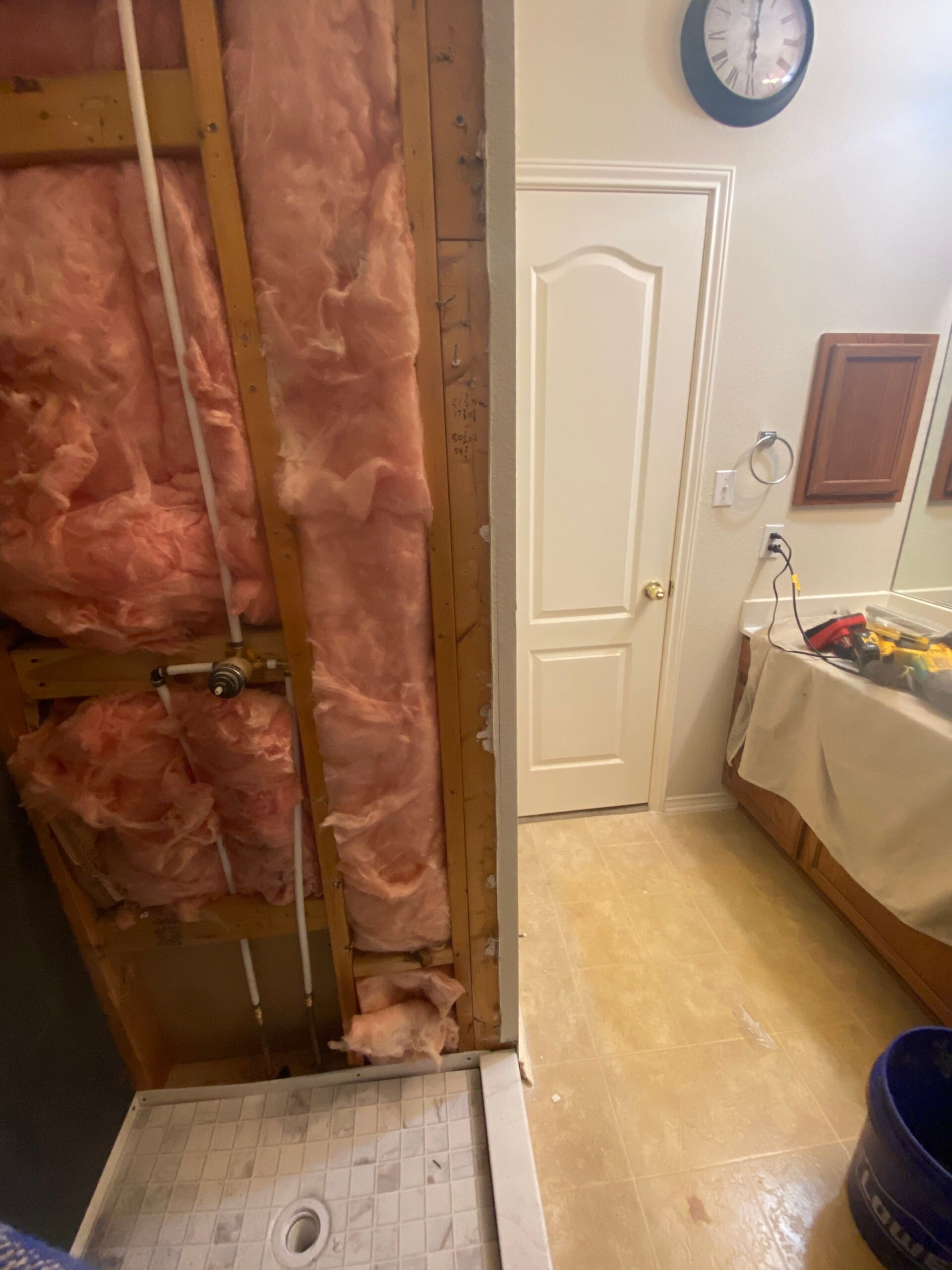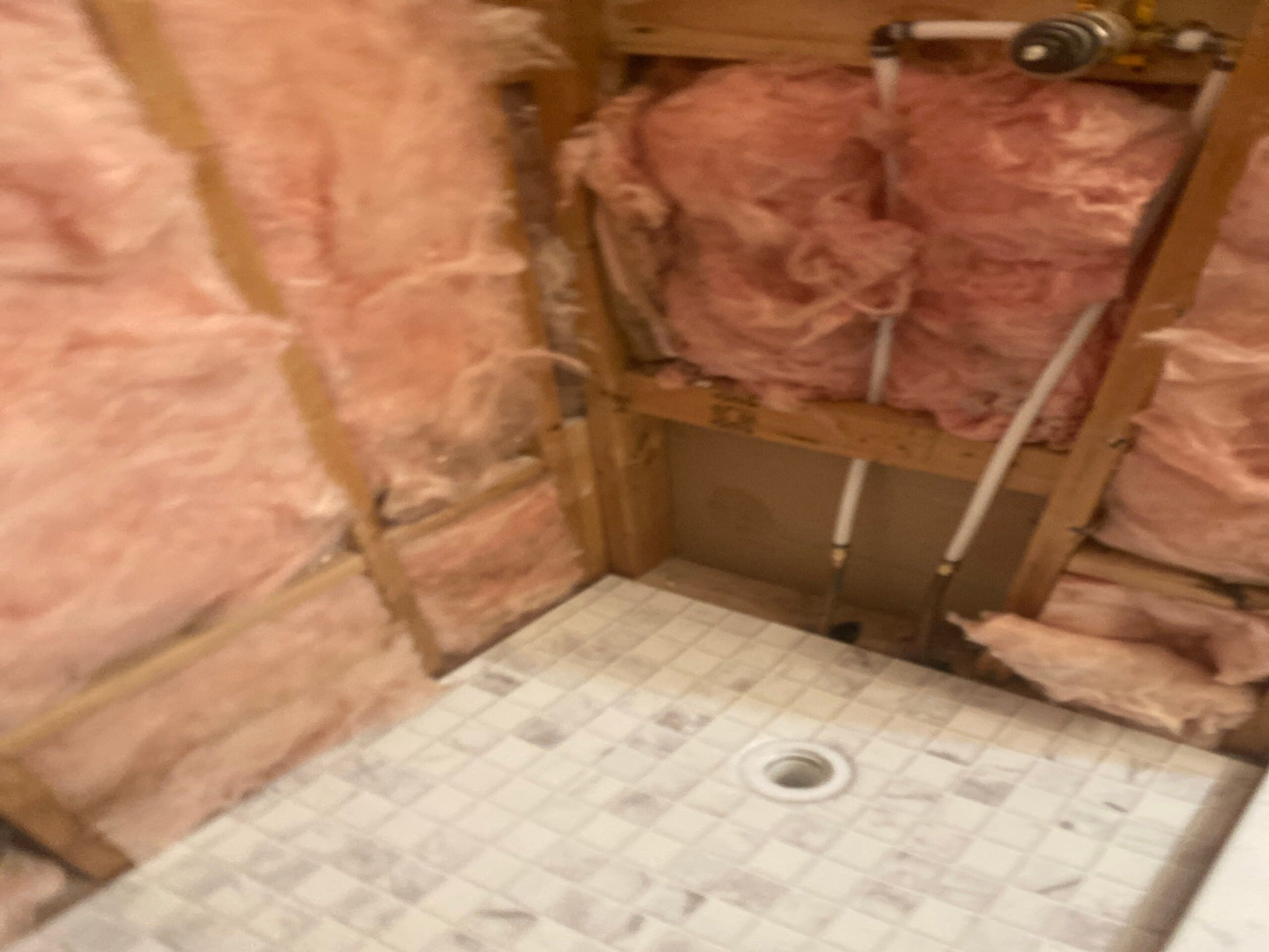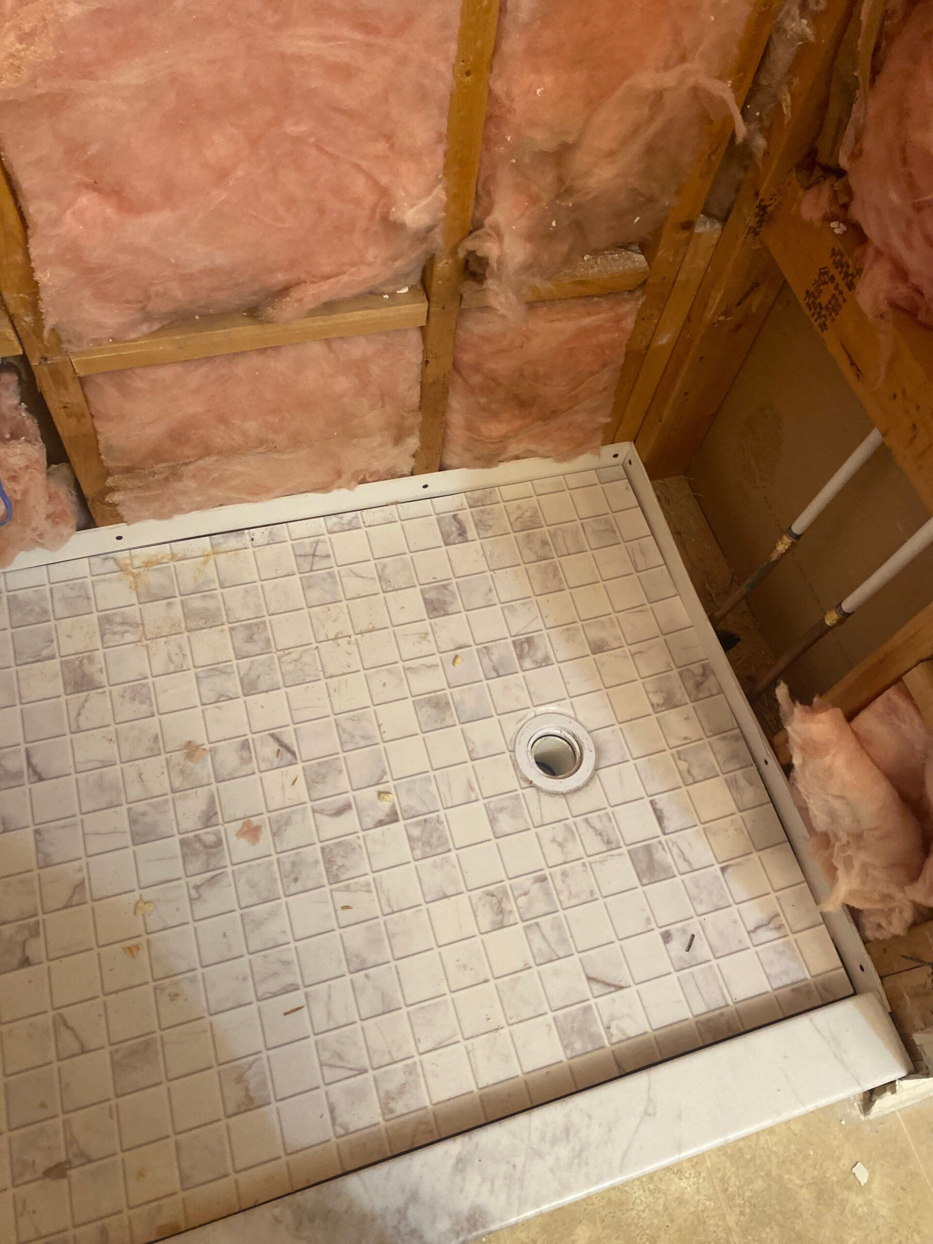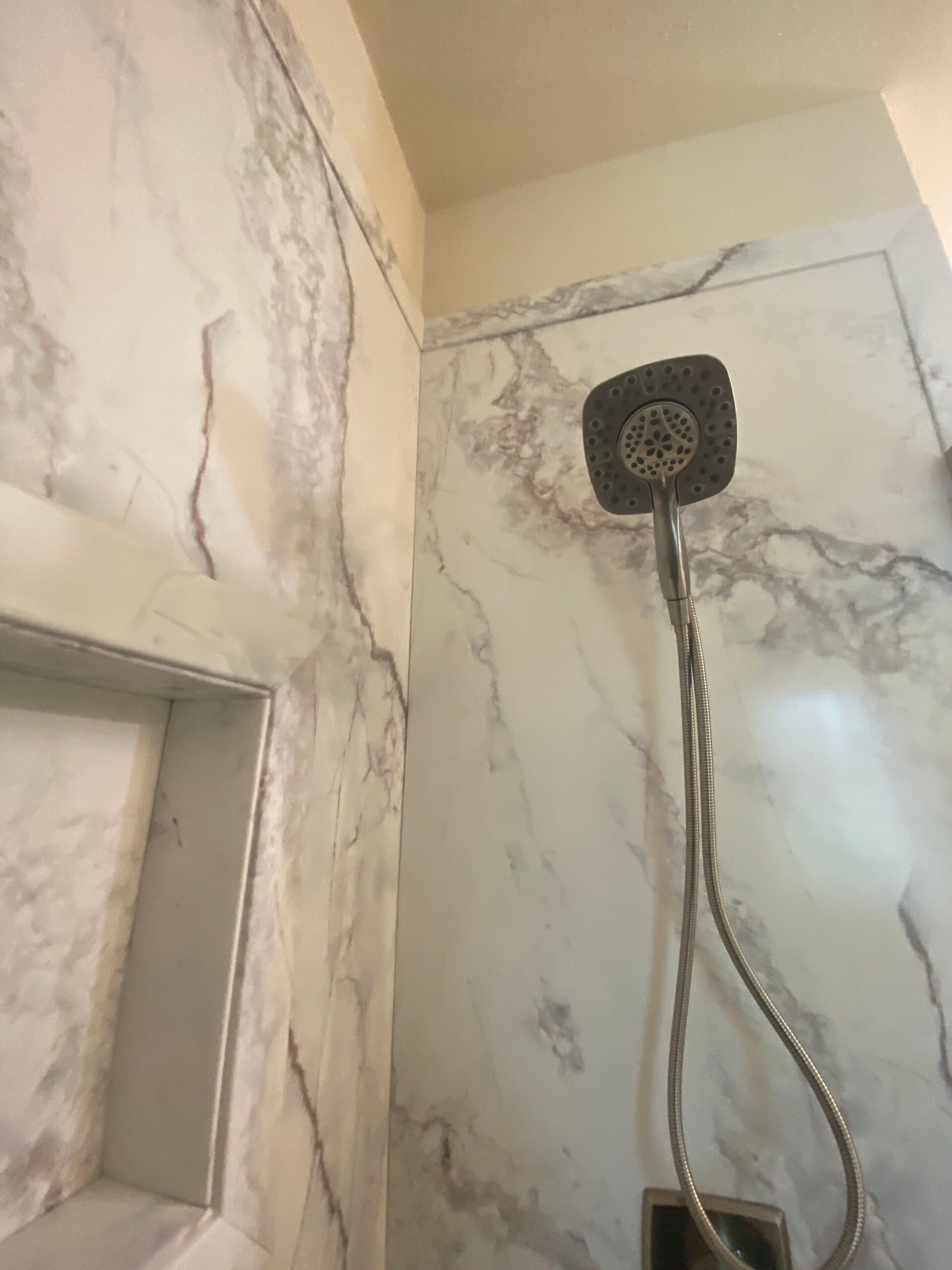 Installation was performed by certified, background-checked installers trained directly under company protocols. Full tear-out to studs was followed by framing inspection, replacement of damaged substrate, and new PEX plumbing. The full project timeline for both bathrooms was estimated at five to six days, with the shower area fully rebuilt using Smart Choice materials.