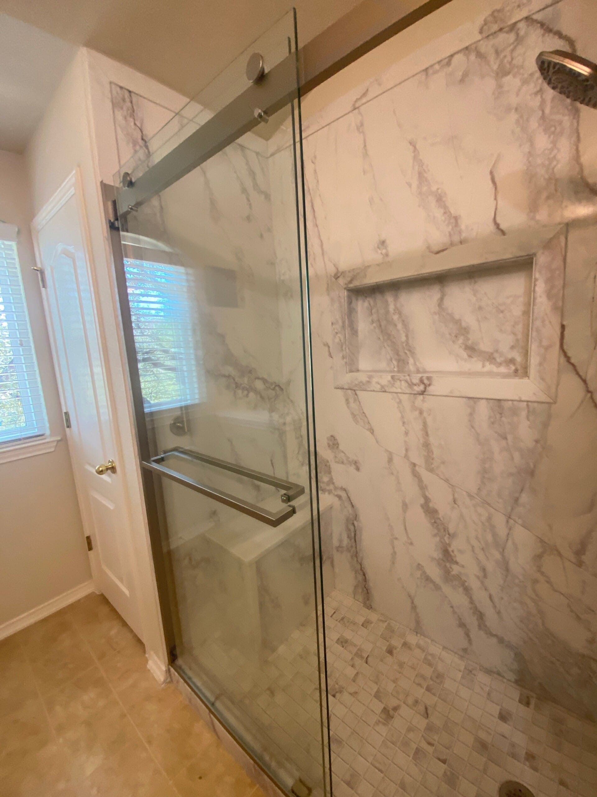 Selected features include marble-style wall panels in a white tone with subtle grey veining, consistent with Azura Bay or White Pearl aesthetics. The walls are grout-free composite and paired with a square mosaic tile shower floor. Fixtures were finished in brushed nickel to maintain a clean, cohesive appearance. A handheld showerhead was mounted with matching trim. A single safety bar was integrated across the door glass, while the customer planned to add their own teak bench separately.