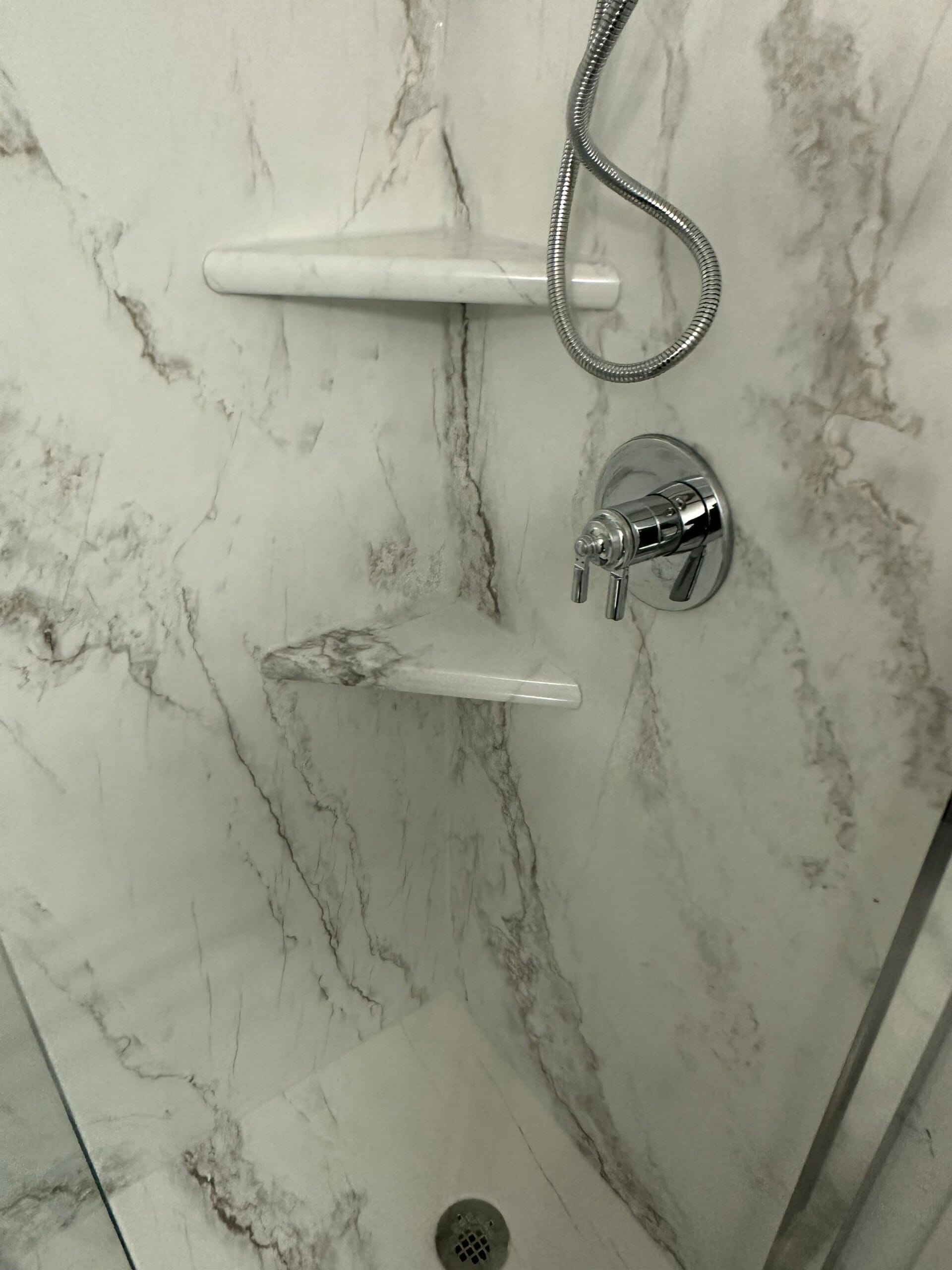 Installation involved removing existing materials down to the studs to inspect for underlying issues before applying a thermal-insulated base and exclusive backer board. The completed design features a marble-patterned wall system, a sliding glass bypass door with a chrome frame, and integrated corner shelving. A handheld shower system on a slide bar and matching chrome fixtures were installed to enhance functionality. The process ensured a completely waterproof environment using quad-locking corners and antimicrobial silicone, with a typical completion timeline of two days.