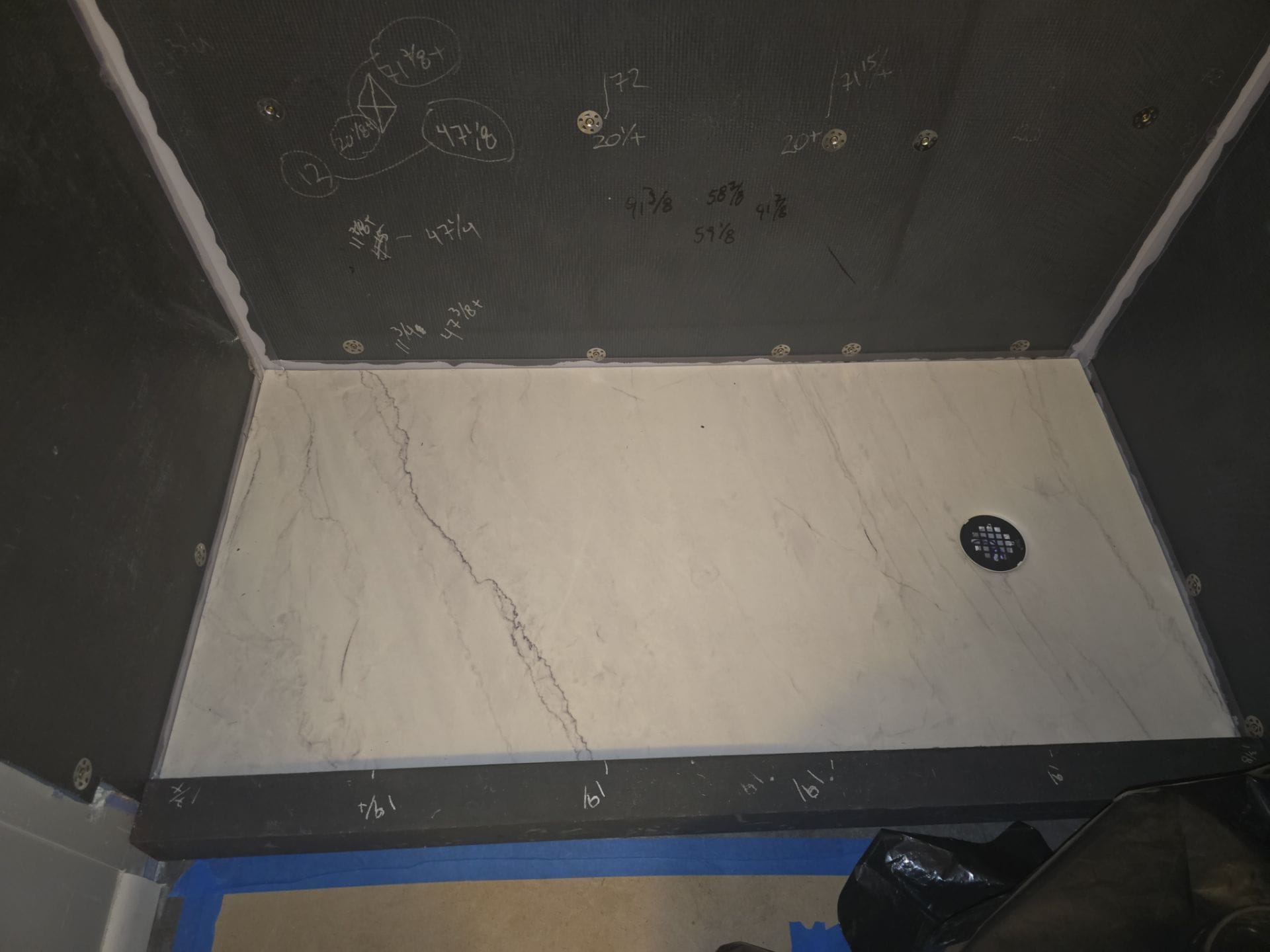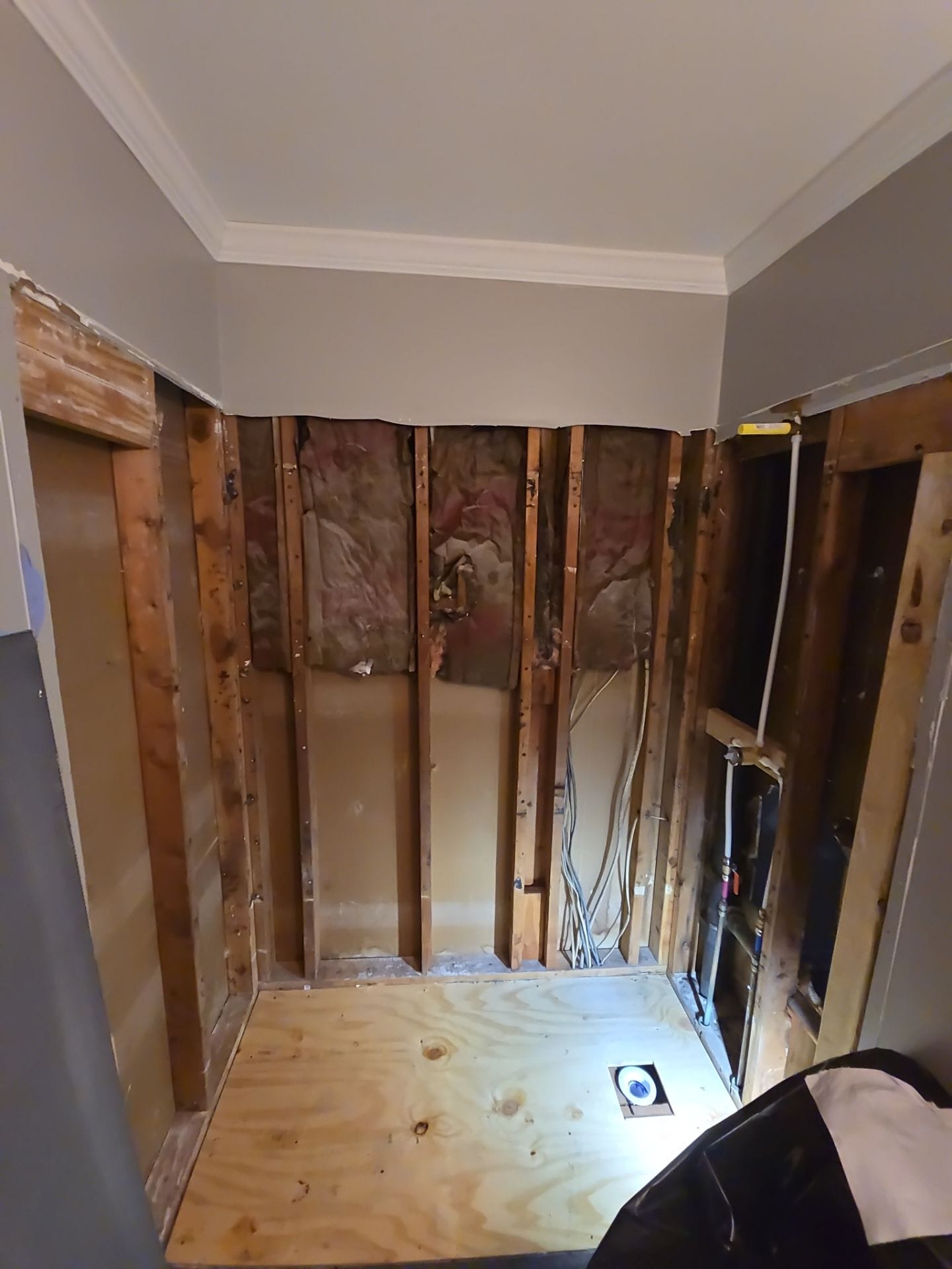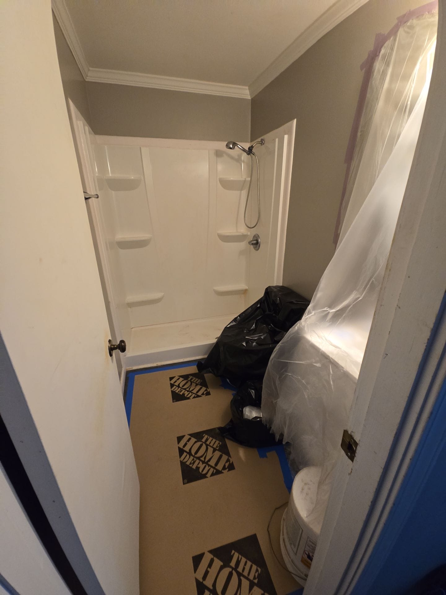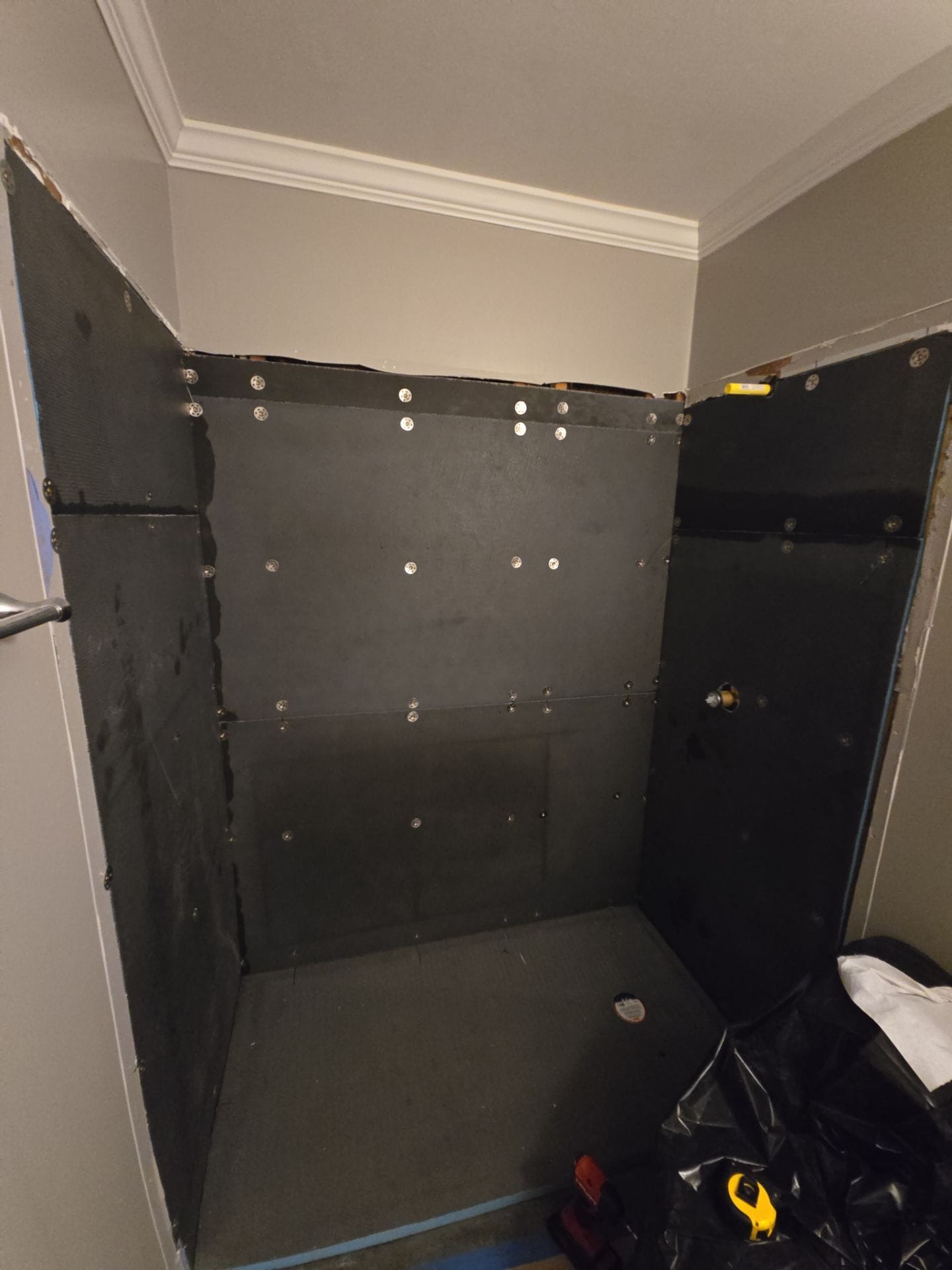 They walked the customer through the installation process, which began with a full demolition of the existing surround down to the studs. Technicians inspected the wall framing for any signs of moisture or mold, completing all necessary repairs before installing a new waterproof foundation. Wall panels were cut and sealed in place, forming a seamless wrap around the shower area with built-in shelving for everyday convenience. A modern chrome handheld showerhead was installed, and a matching shower rod was added to support a future curtain or enclosure of choice. The project was completed with careful attention to cleanliness, with all work contained and site protection measures followed throughout.