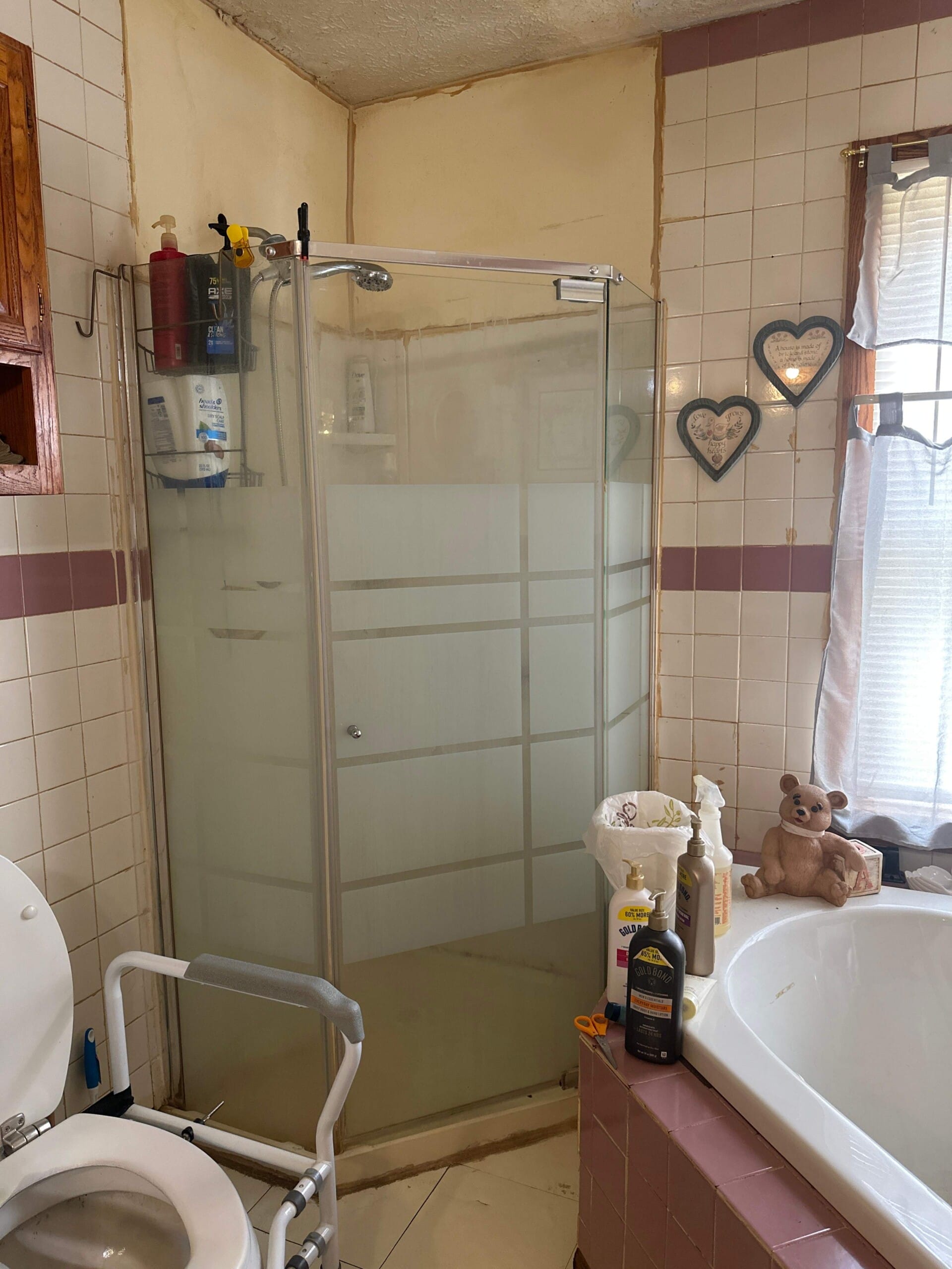 Installation began with the full removal of the framed glass enclosure and surrounding paneling. The team removed all damaged backer material, made necessary surface repairs, and installed a new waterproof foundation using a seamless base and multi-layer composite wall panels. Accessories, including corner shelves and the handheld shower fixture, were placed to maximize functionality without crowding the space. No structural changes were required, and the installation was completed efficiently with proper sealing around window and corner transitions.