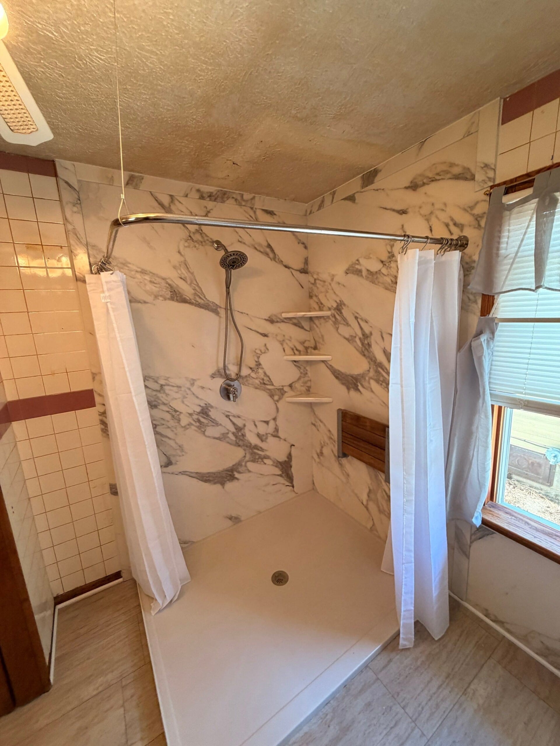 The Five Star Bath Solutions representative introduced a new corner-based walk-in shower design using a light marble-look composite wall system. The customer opted for a curved shower rod with a dual-curtain setup instead of a glass door to simplify access and make future cleaning easier. A handheld shower head in a brushed nickel finish was paired with molded corner shelving and a low-threshold shower base for ease of entry. The aesthetic upgrade modernized the space without altering the existing layout, preserving the window placement and tilework outside the wet area.