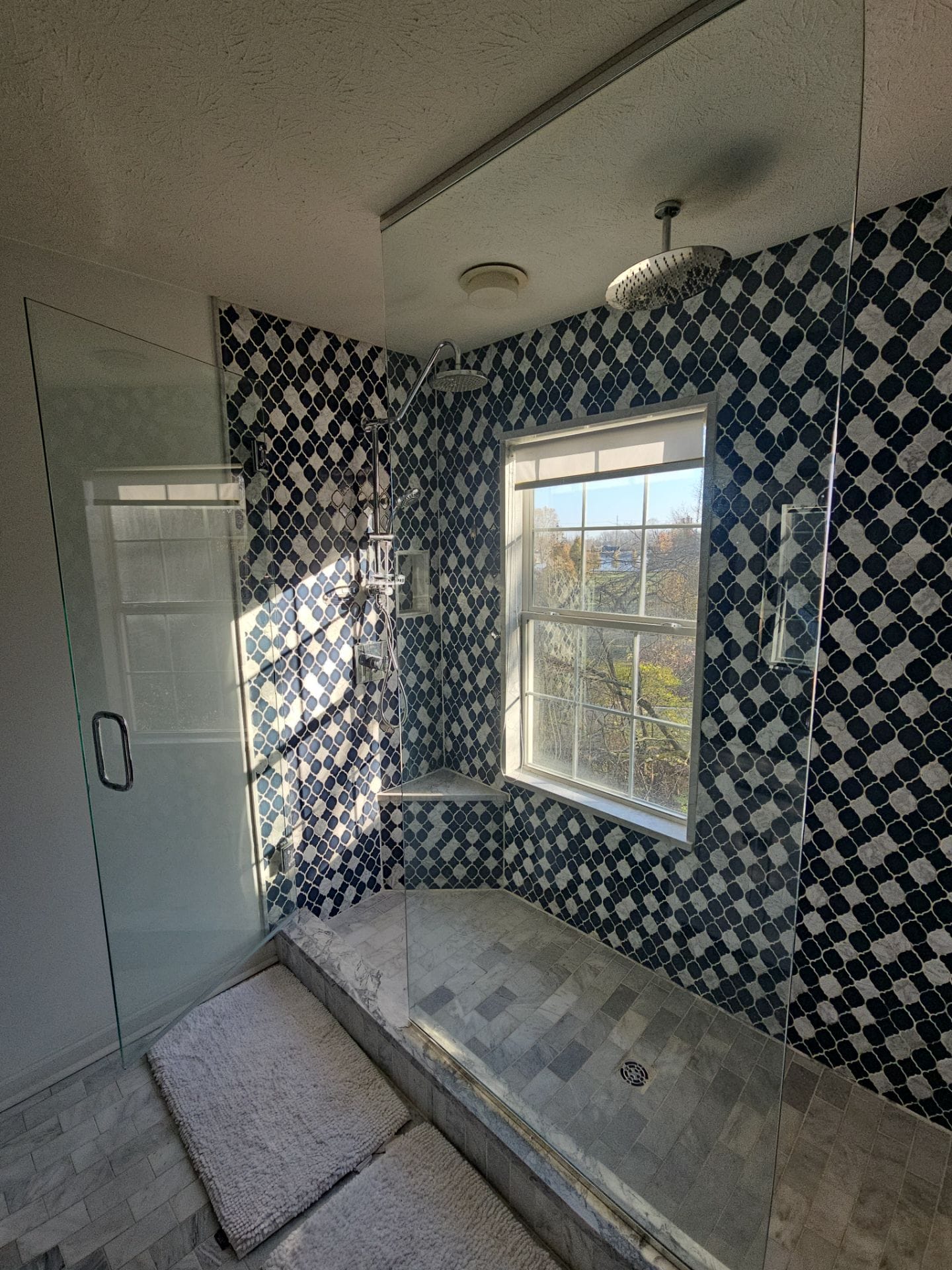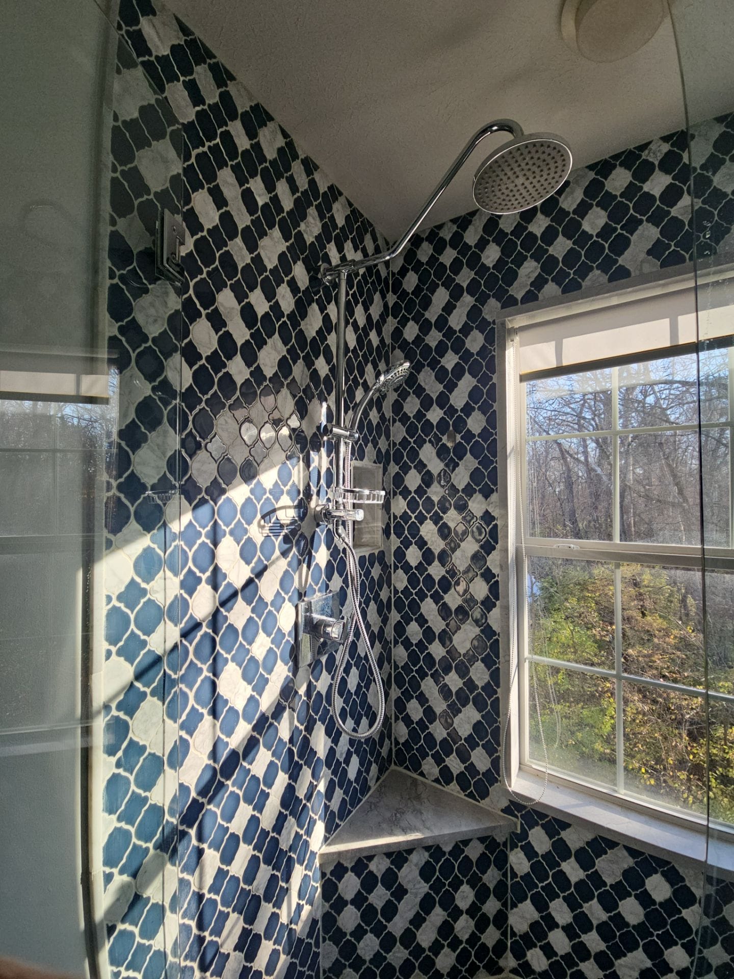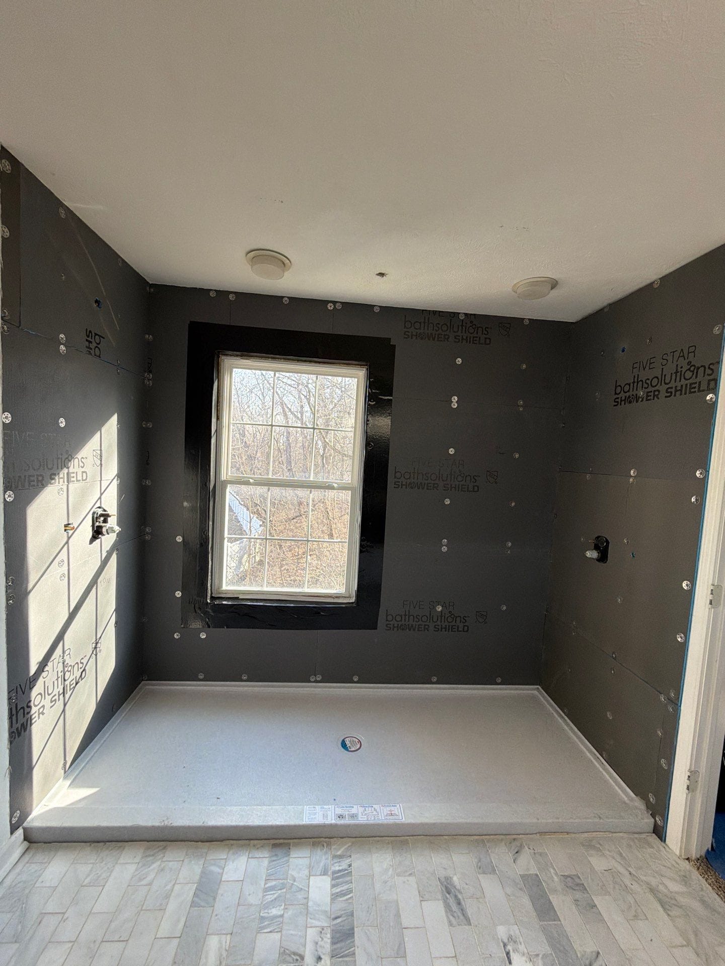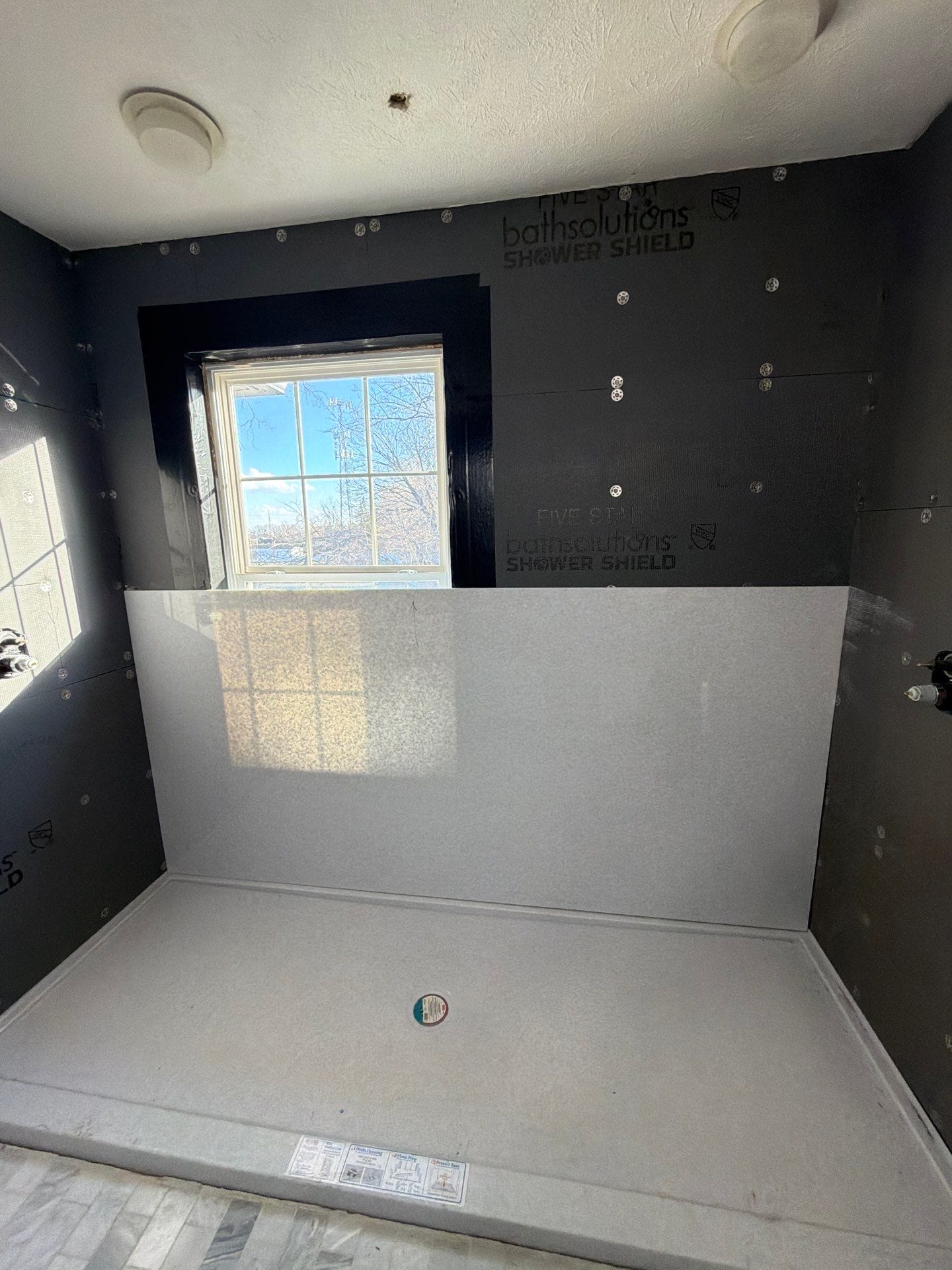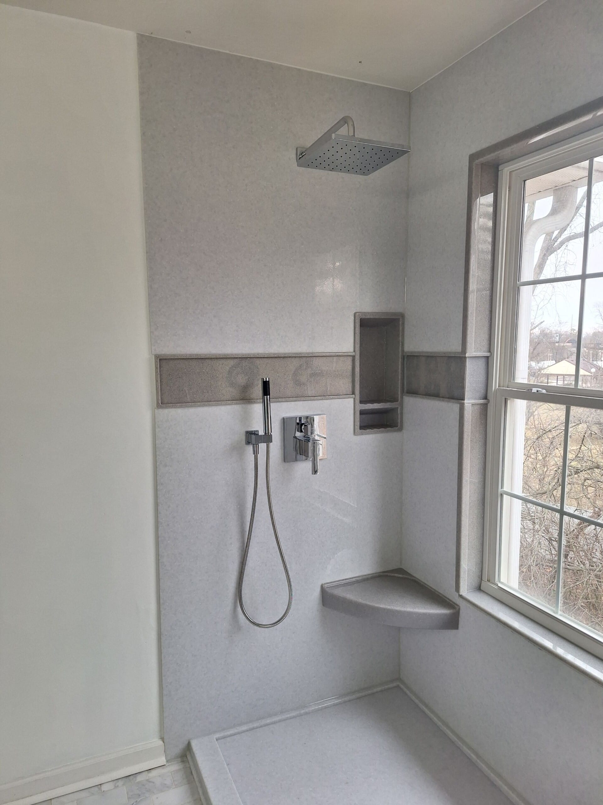 Installation began with full demolition of the existing fiberglass unit down to the studs, followed by structural inspection and preparation of the wet area. Any compromised materials were addressed before installing a waterproof backer board system and a solid shower base. Composite wall panels were cut precisely to fit around the window opening and extend to the ceiling for full height protection. Two reinforced corner shelves and recessed wall niches were integrated for storage. Plumbing fixtures were updated and mounted securely, and all joints were sealed with antimicrobial silicone to create a watertight enclosure. The installation was completed by a trained and certified crew specializing exclusively in bathroom remodels.