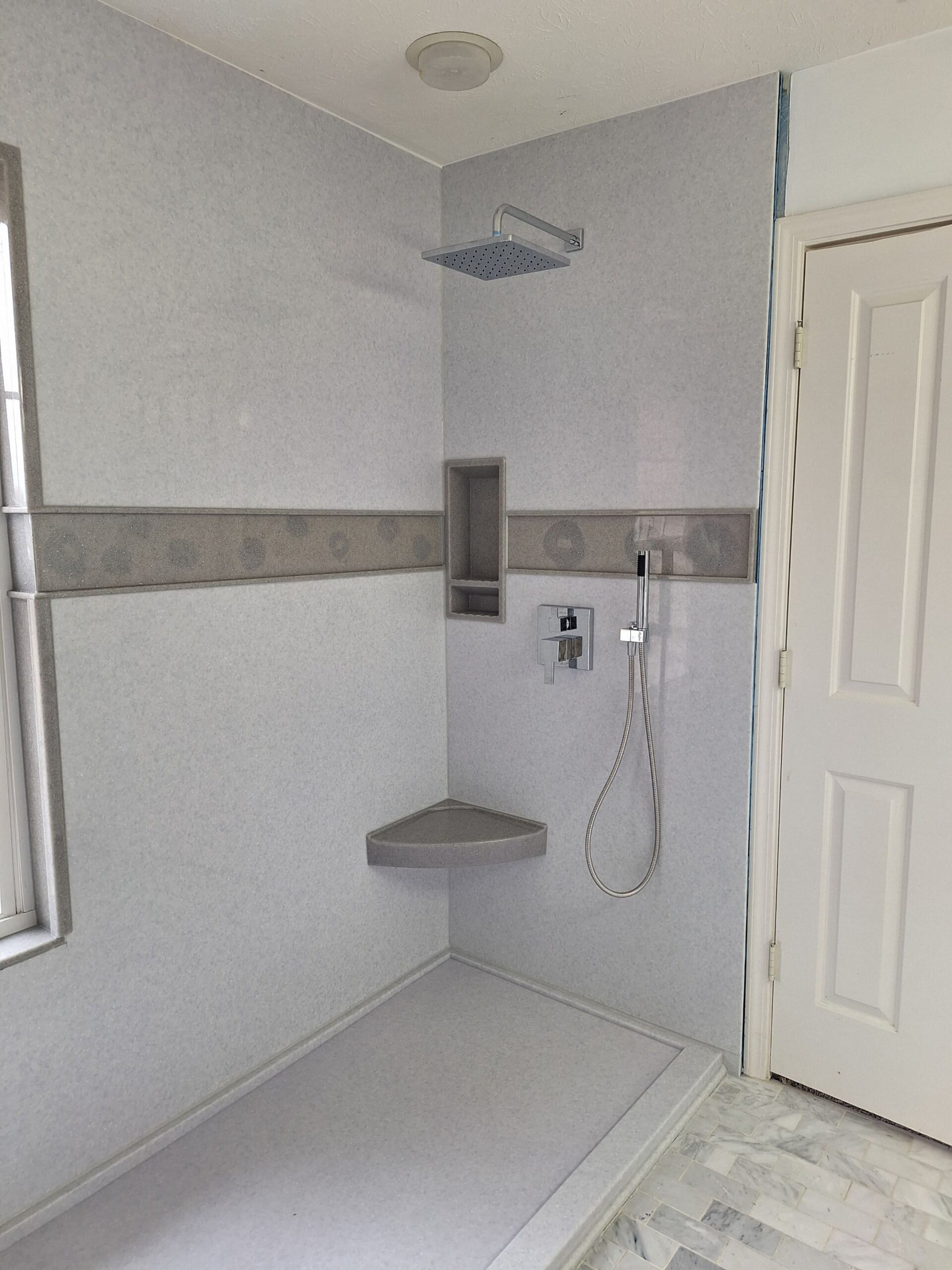 The Five Star Bath Solutions representative presented the exclusive Smart Choice composite wall system designed to provide a grout free, non porous, and waterproof solution. The selected finish features a light stone appearance with a subtle horizontal accent band that runs continuously through the niche area. Chrome fixtures were installed, including a standard wall mounted shower head and a handheld attachment rather than a rainfall configuration. The representative emphasized the company’s bathroom focused specialization, fully insured and bonded installation standards, and long standing national presence supported by local ownership.