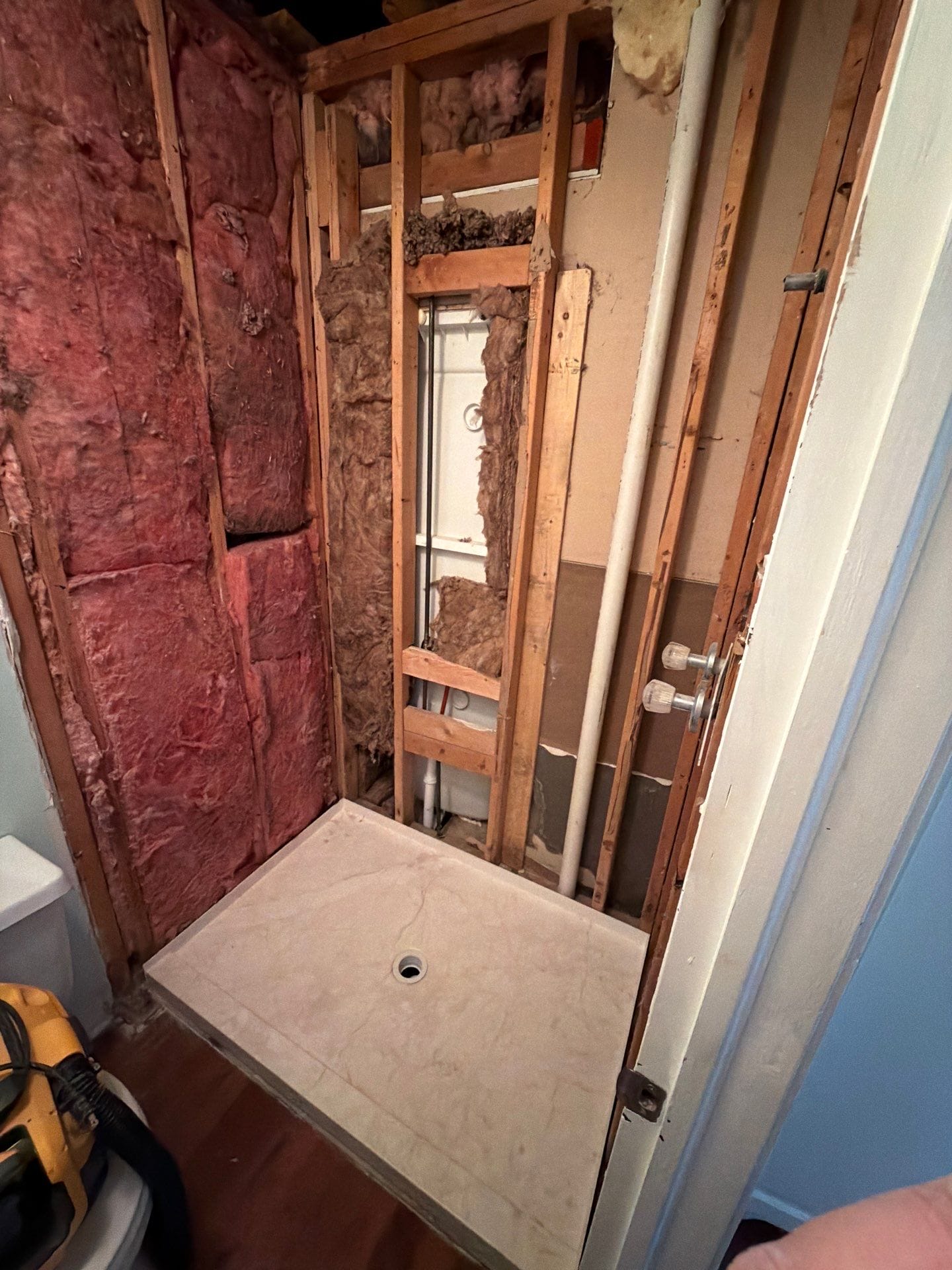 Installation began with full removal of the previous shower surround down to the studs to allow for inspection of framing and plumbing. A fully synthetic waterproof backer board system was installed prior to fitting the new solid shower base. Composite wall panels were measured and cut to accommodate the ceiling angle and existing layout, extending fully around the enclosure for a seamless appearance. Plumbing fixtures were updated and secured, and all seams were sealed with antimicrobial silicone to ensure a watertight finish. The glass door was installed with precision alignment to provide smooth operation and effective water containment. The project was completed within a one to two day installation window.