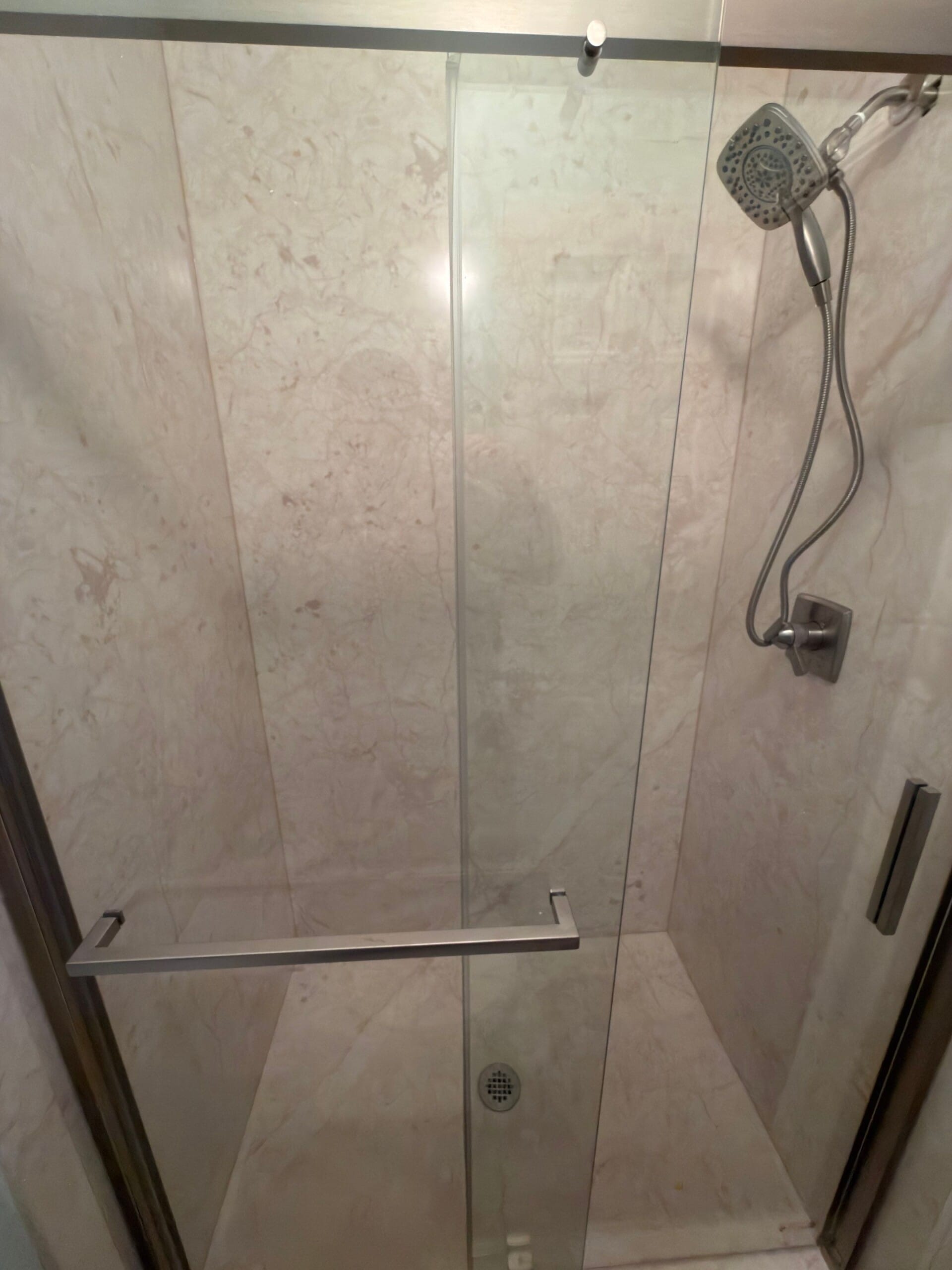 The Five Star Bath Solutions representative presented the Smart Choice composite wall system, highlighting its grout free, non porous, antimicrobial surface designed to replicate natural stone without maintenance concerns. The selected wall finish features a soft, light marble pattern with subtle veining that enhances brightness within the space. Brushed nickel fixtures were installed, including a wall mounted shower head with handheld functionality. A clear hinged glass door with matching brushed nickel hardware replaced the curtain rod, providing a streamlined and modern enclosure. The representative reinforced the company’s locally operated structure, professional standards, and commitment to long term durability.