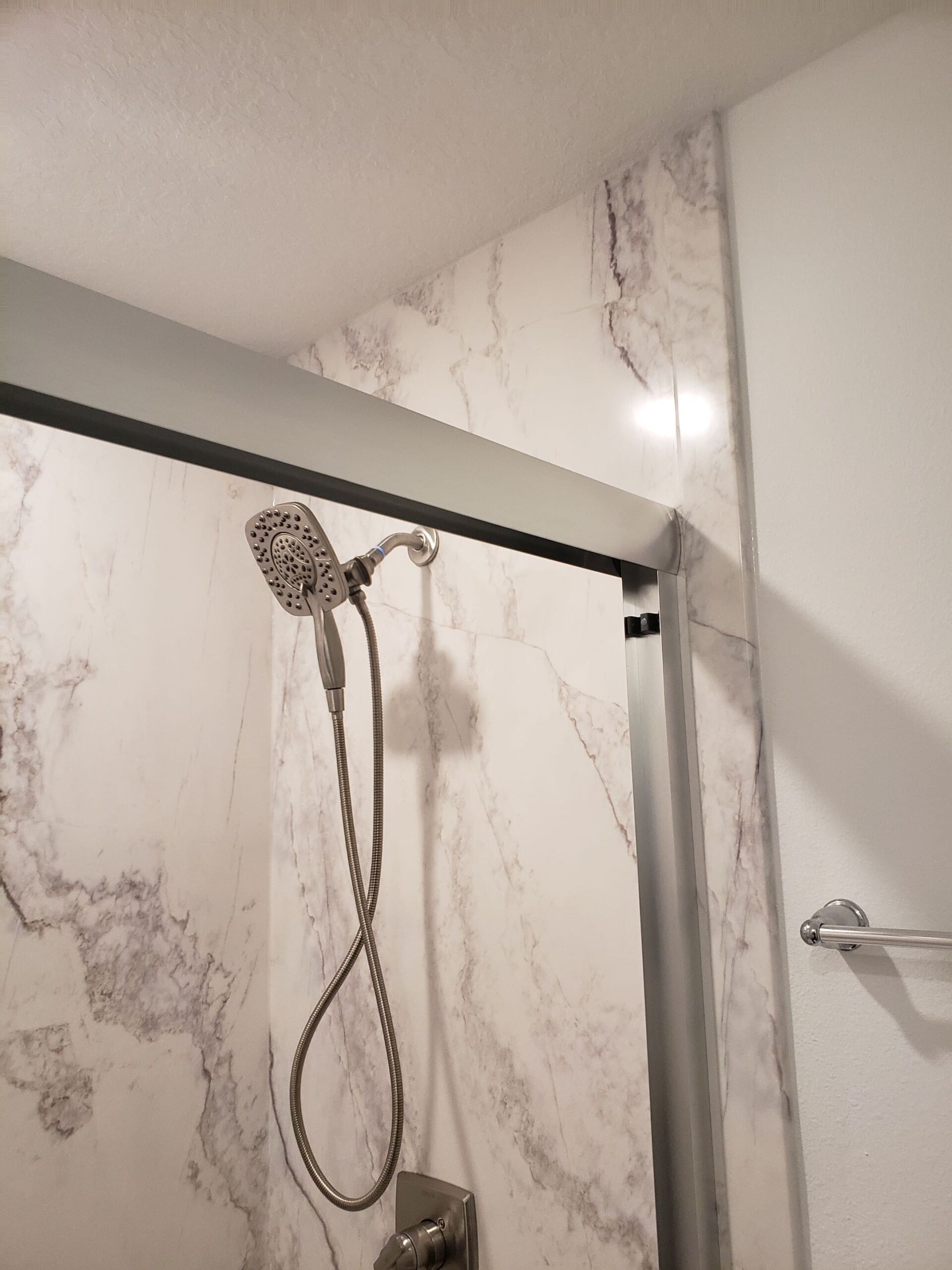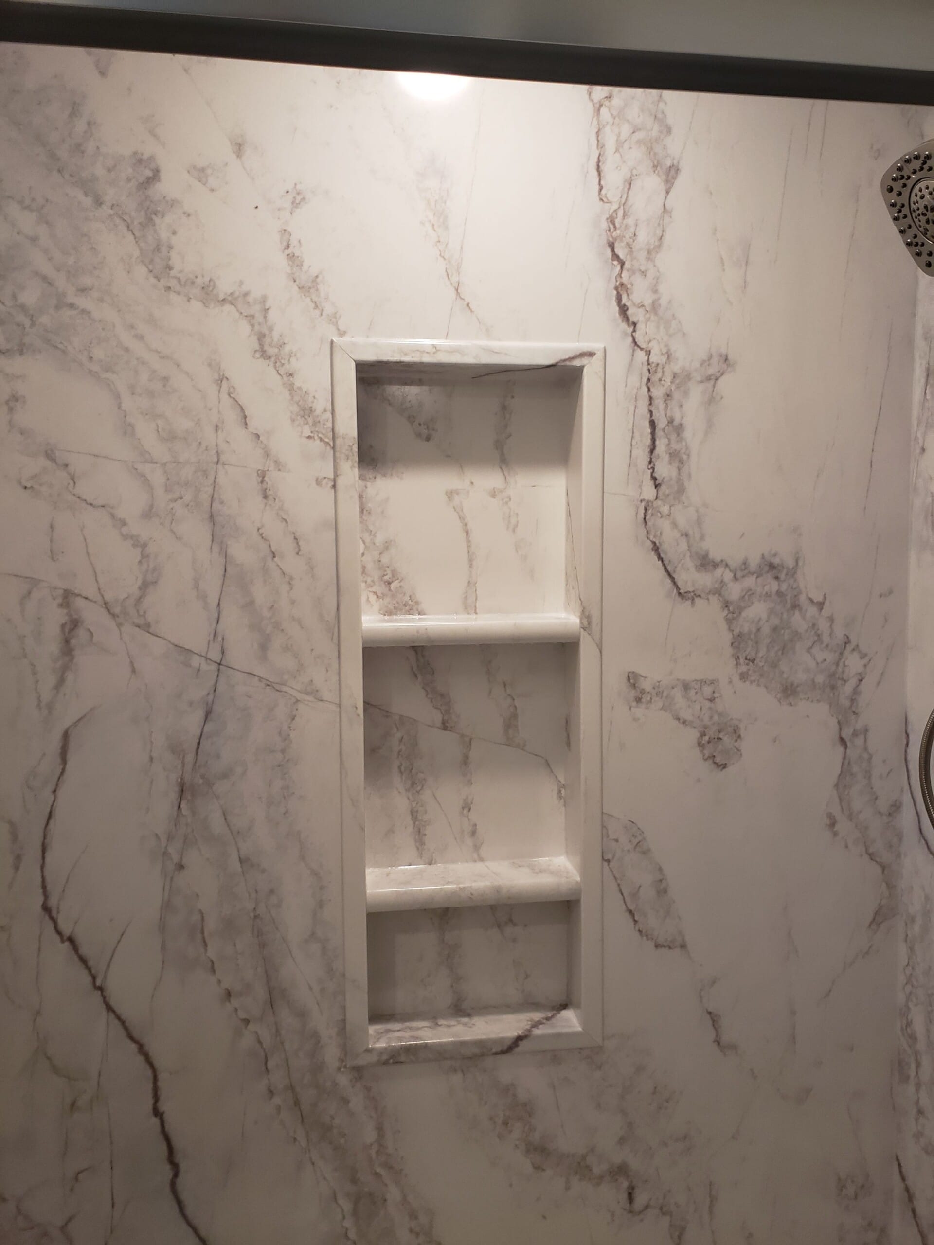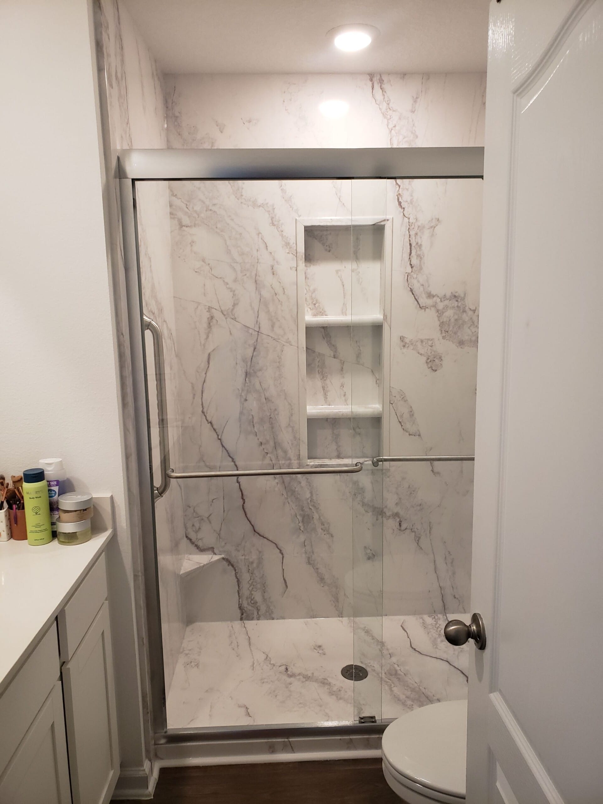 * Custom walk-in shower system with marble-patterned composite walls
