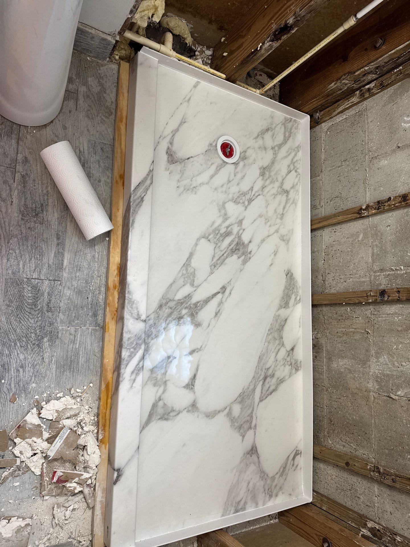 The panels used were made of PVC composite with antimicrobial properties, resistant to mold and mildew. All wet area substrates were upgraded with closed-cell inorganic HydroBlock backer boards, sealed with antimicrobial silicone to ensure complete moisture control. The custom walk-in shower pan was built with a closed-cell foam core for structural integrity and slip resistance. Updated plumbing lines were routed using PEX materials, and a chrome-finished handheld shower with wand was installed for flexible use.
