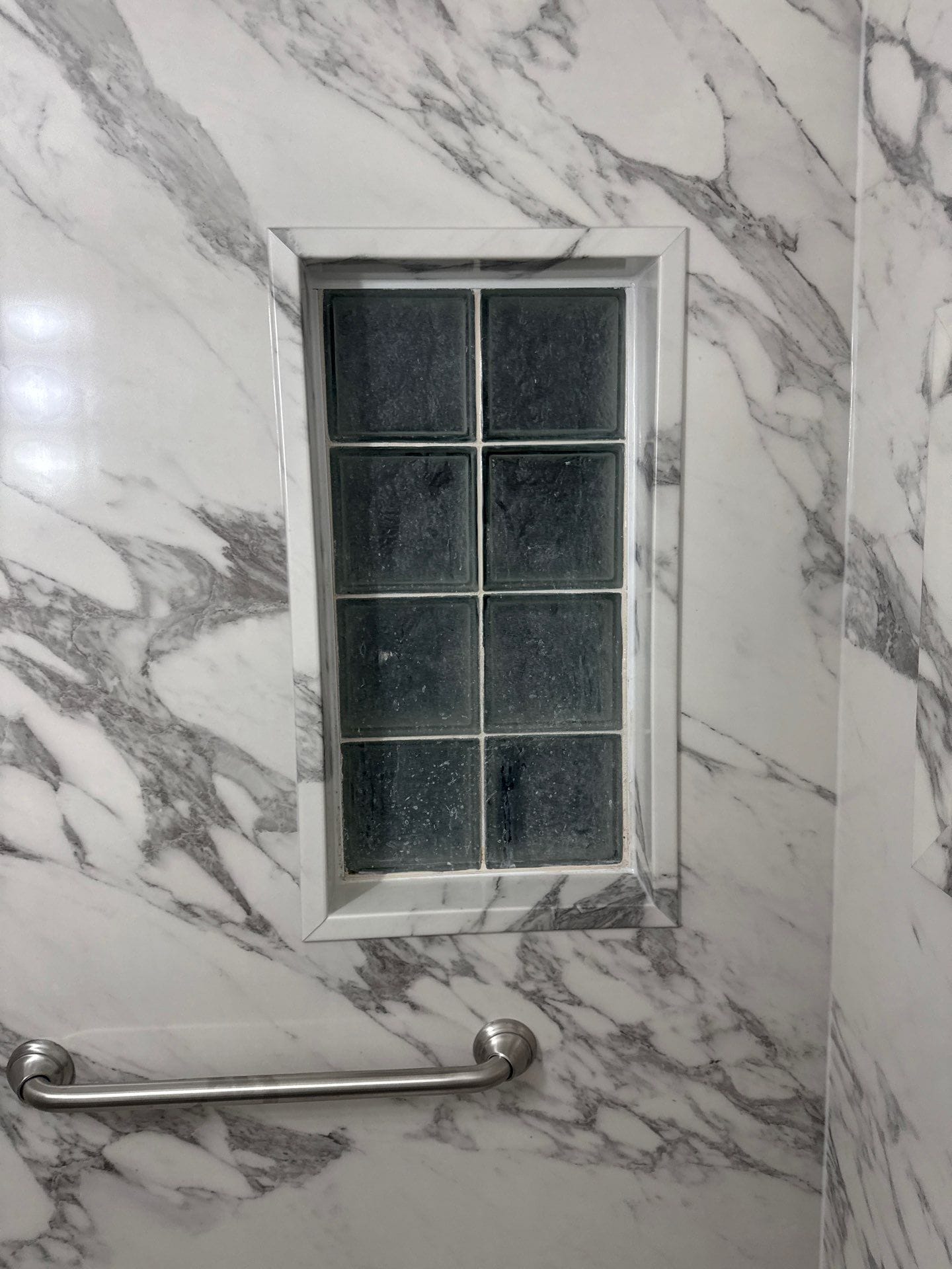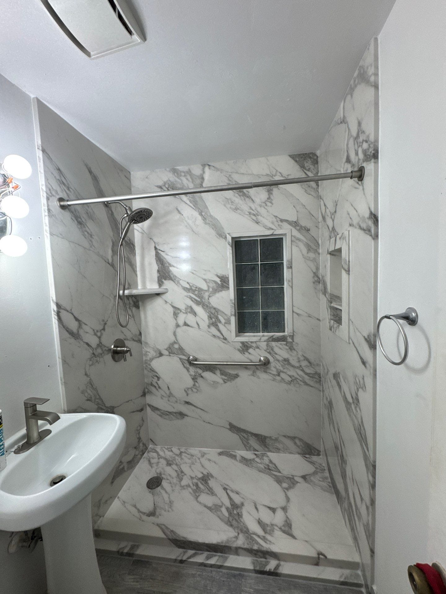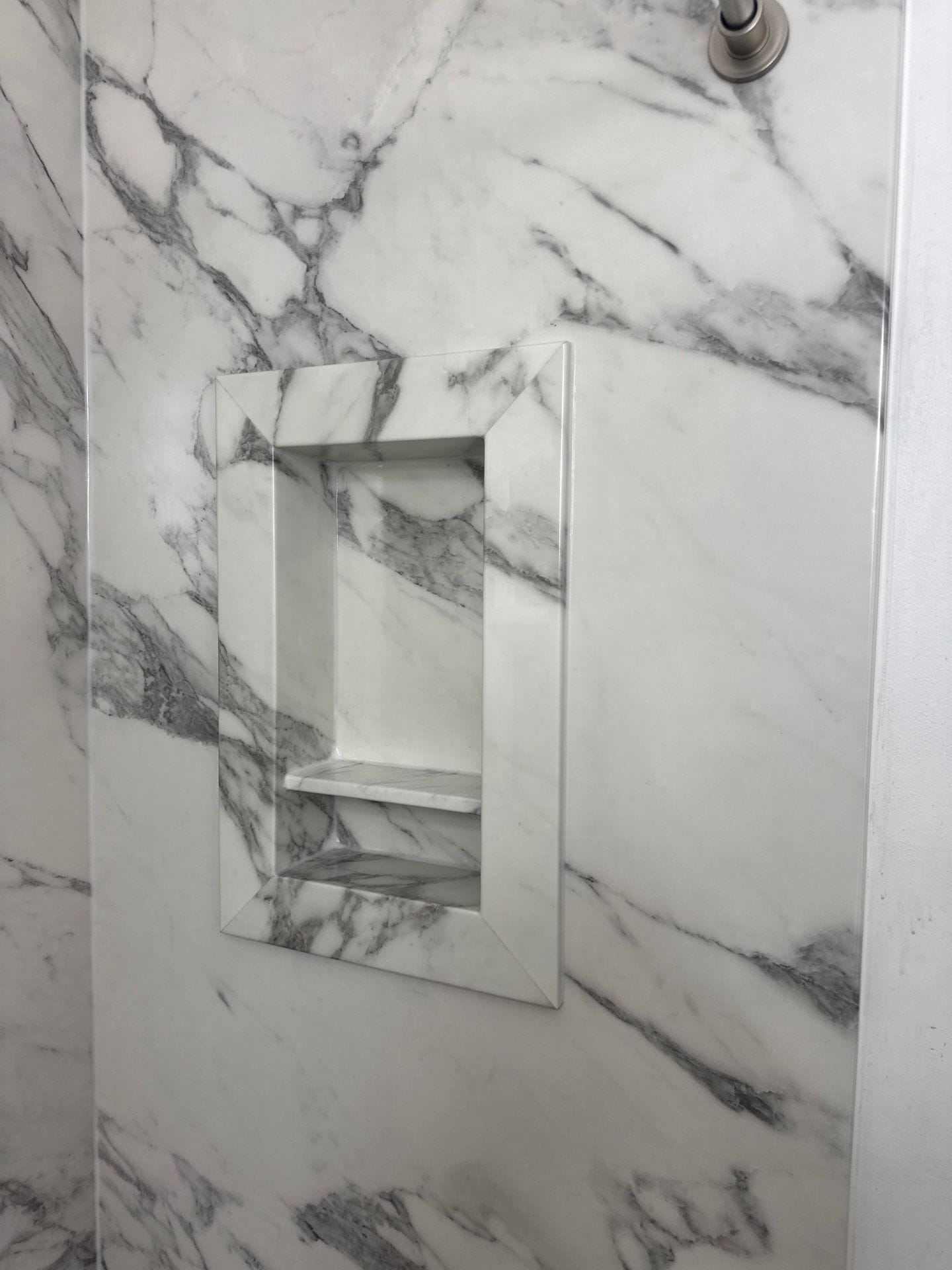 In the master bath, the remodel preserved the existing bathtub while replacing the previous light gray stone-look tile with high-gloss Calacatta-style composite panels, wrapping the space in large white marble veining. The original accent band and niche shelving were removed and replaced with integrated features matching the new panels. In the hallway bath, the old tub and tile were removed and replaced with a walk-in shower that used the same marble composite system, giving both bathrooms a unified visual finish. A built-in recessed niche and a corner shelf were included in the shower, along with a horizontal grab bar under the window for added safety.