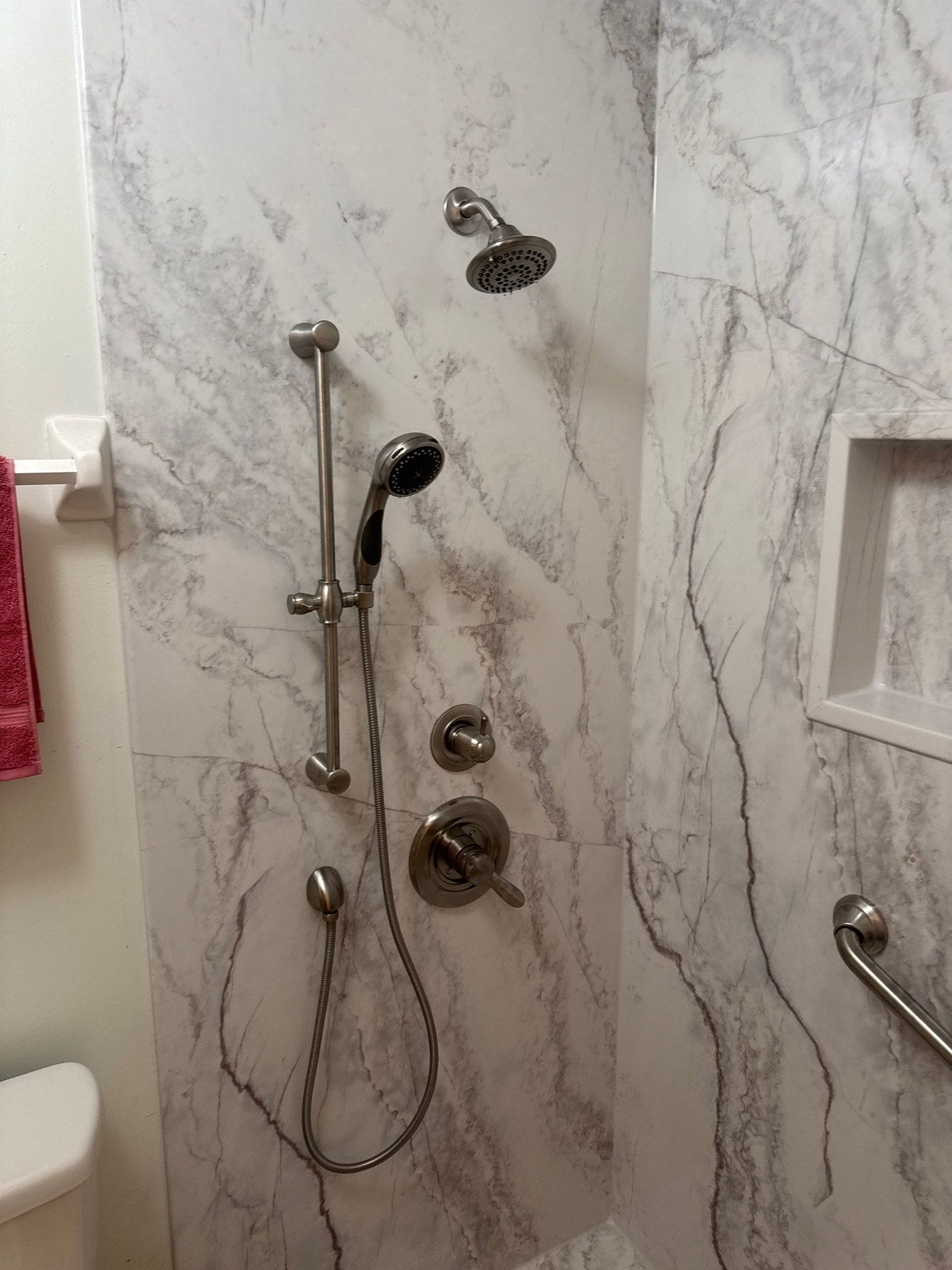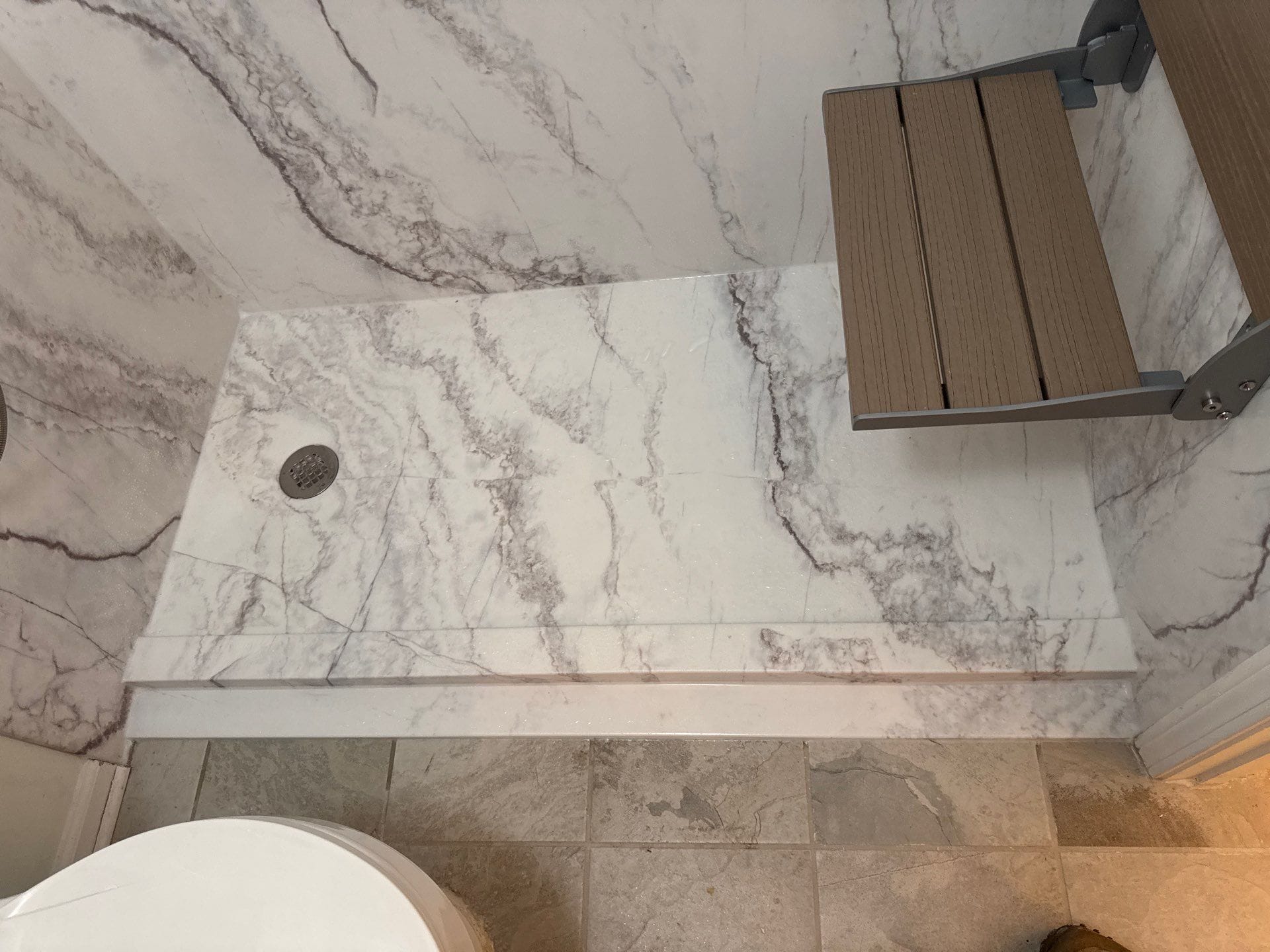 The Five Star Bath Solutions representative presented a grout-free composite wall system designed to replicate natural marble while providing a non-porous and waterproof surface. The selected finish features a white background with soft grey veining that extends across the walls and ceiling panel for a seamless look. A brushed nickel shower system was installed, including a fixed showerhead and a handheld spray mounted on a vertical slide bar. A rectangular recessed niche was integrated into the back wall for streamlined storage. Safety and comfort features include a reinforced horizontal grab bar and a fold-down teak bench with a supportive metal frame. The low-threshold shower base complements the wall pattern and enhances ease of entry.