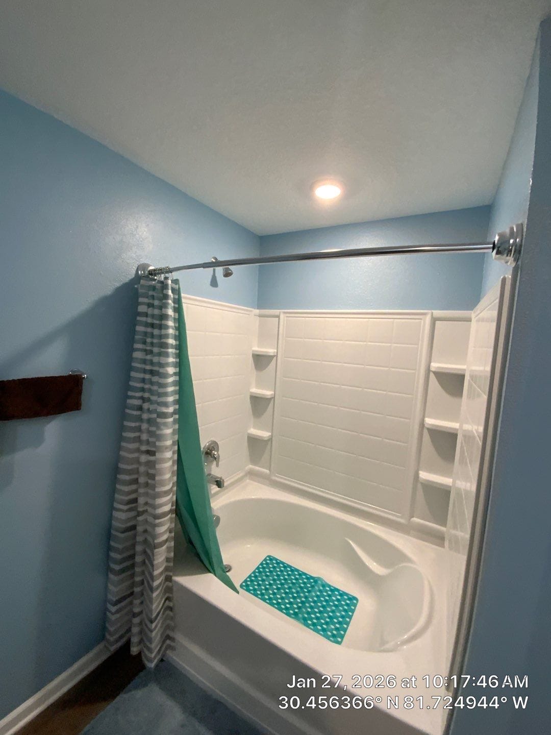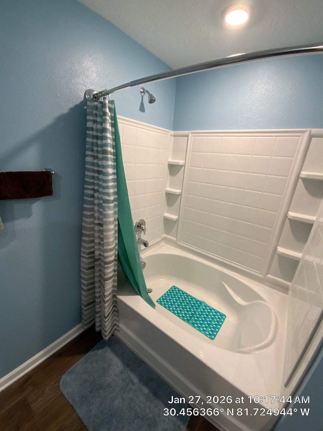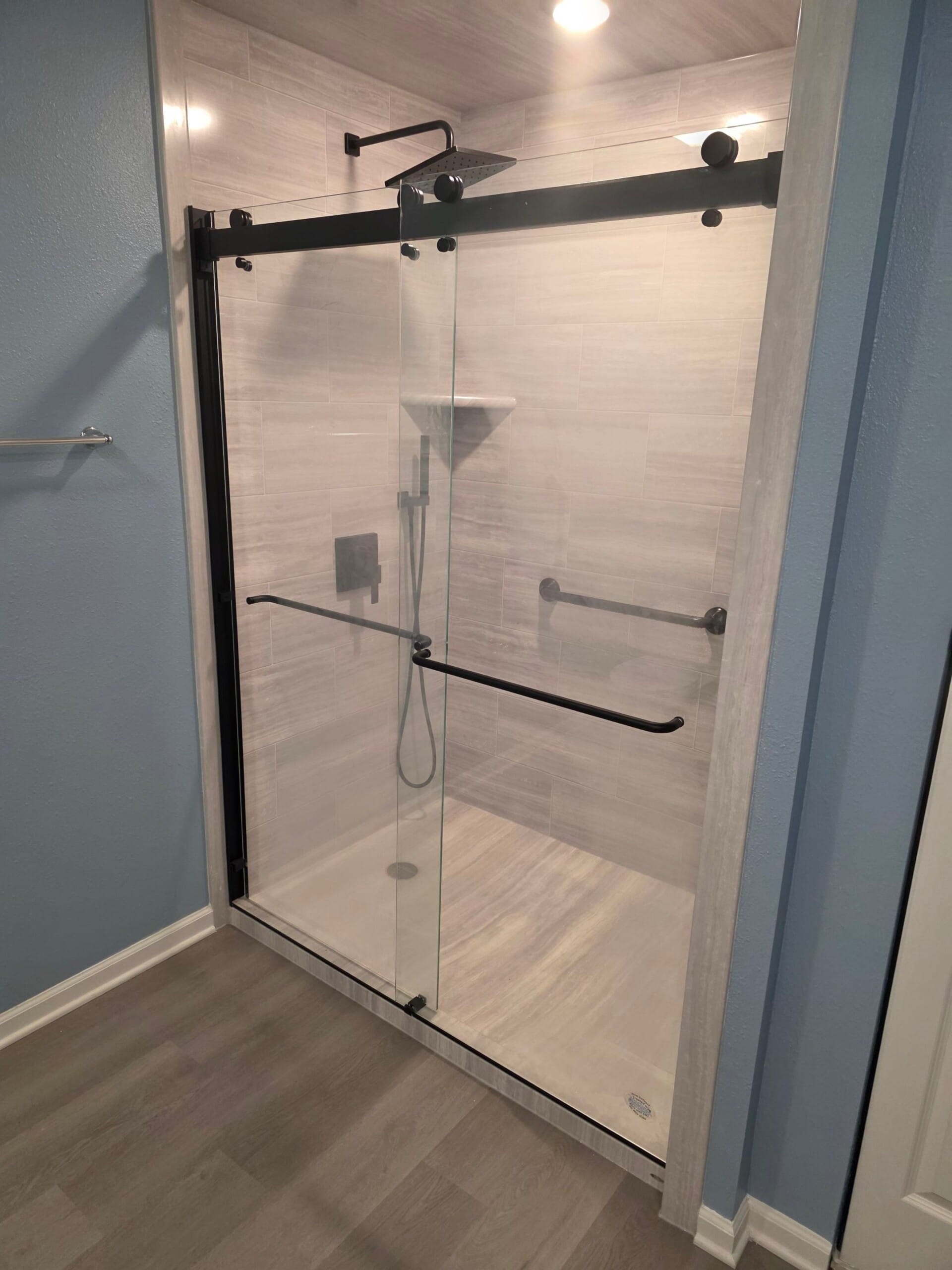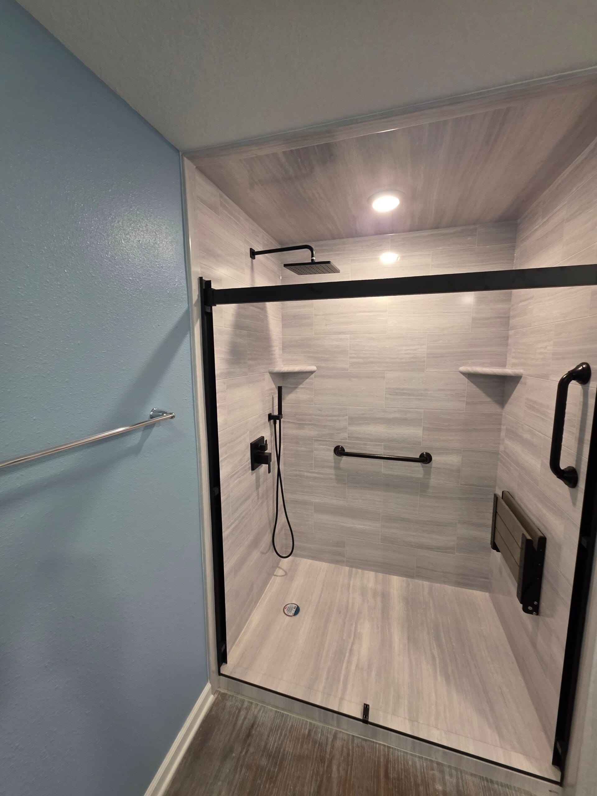 The Five Star Bath Solutions representative presented a grout-free composite wall system in a light, neutral tone with a subtle horizontal pattern, designed for durability and low maintenance. The updated shower includes matte black fixtures, featuring a square rainfall showerhead paired with a handheld wand. A sliding glass door system with black hardware was installed to provide a clean and structured enclosure. Integrated corner shelves and a horizontal grab bar were included to enhance functionality while maintaining a minimal and organized look. The use of non-porous materials and a cohesive design supports long-term ease of care.