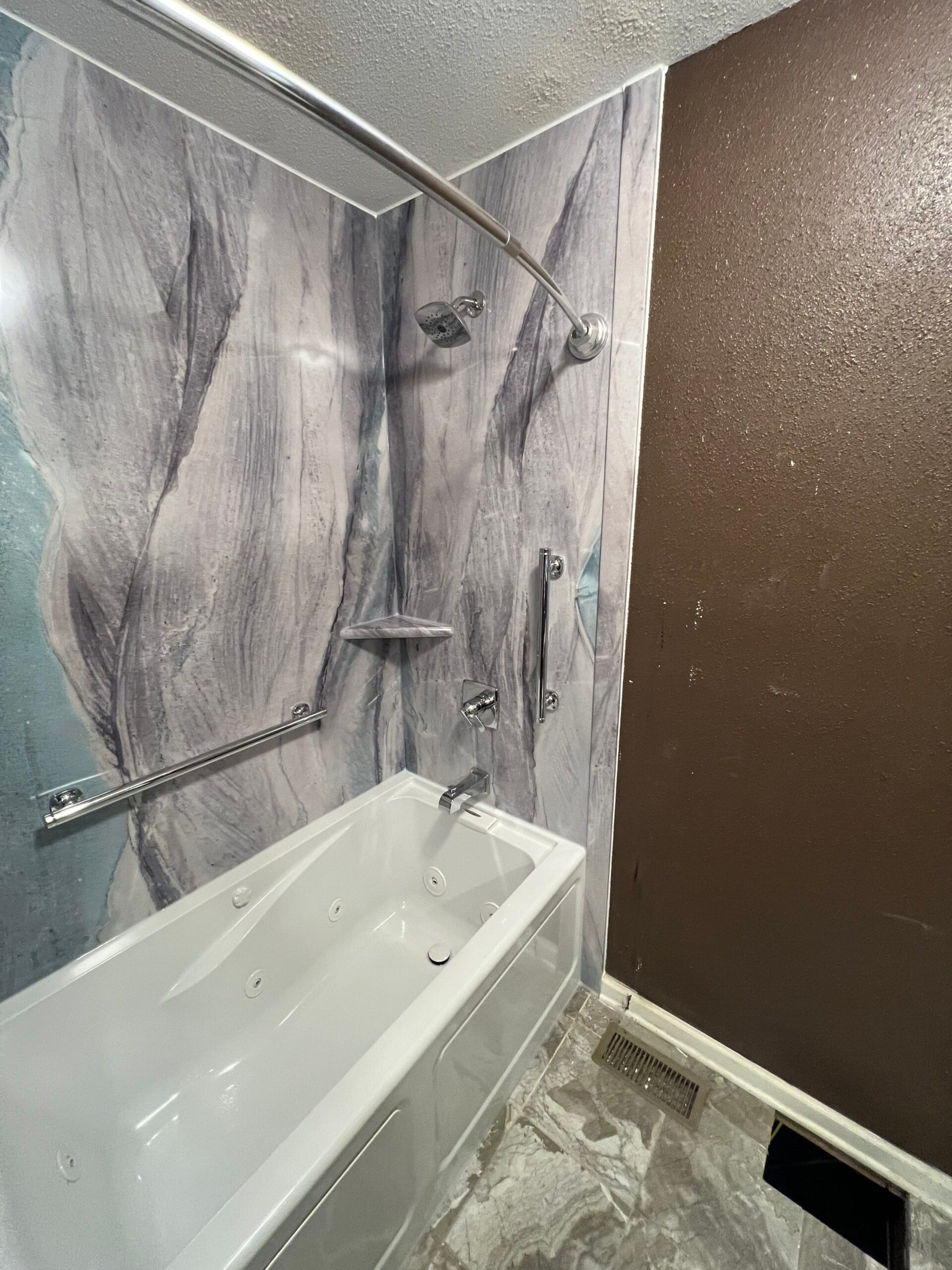 Installation involved complete demolition down to the studs, removal of all existing tub and wall components, and inspection of the framing and plumbing. A new tub was installed along with pearl-toned composite panels that extended to the ceiling, featuring a soft veining pattern that added depth while maintaining a clean appearance. Two corner shelves were secured in the same finish, and a brushed nickel shower system was added along with a curved curtain rod for improved space. Antimicrobial silicone was used at all seams to ensure long-term waterproofing. The process included debris removal and a final walkthrough, with no dumpster placed onsite. The standard upstairs remodel was completed in under two days, while the downstairs custom shower was projected to require additional fabrication lead time.