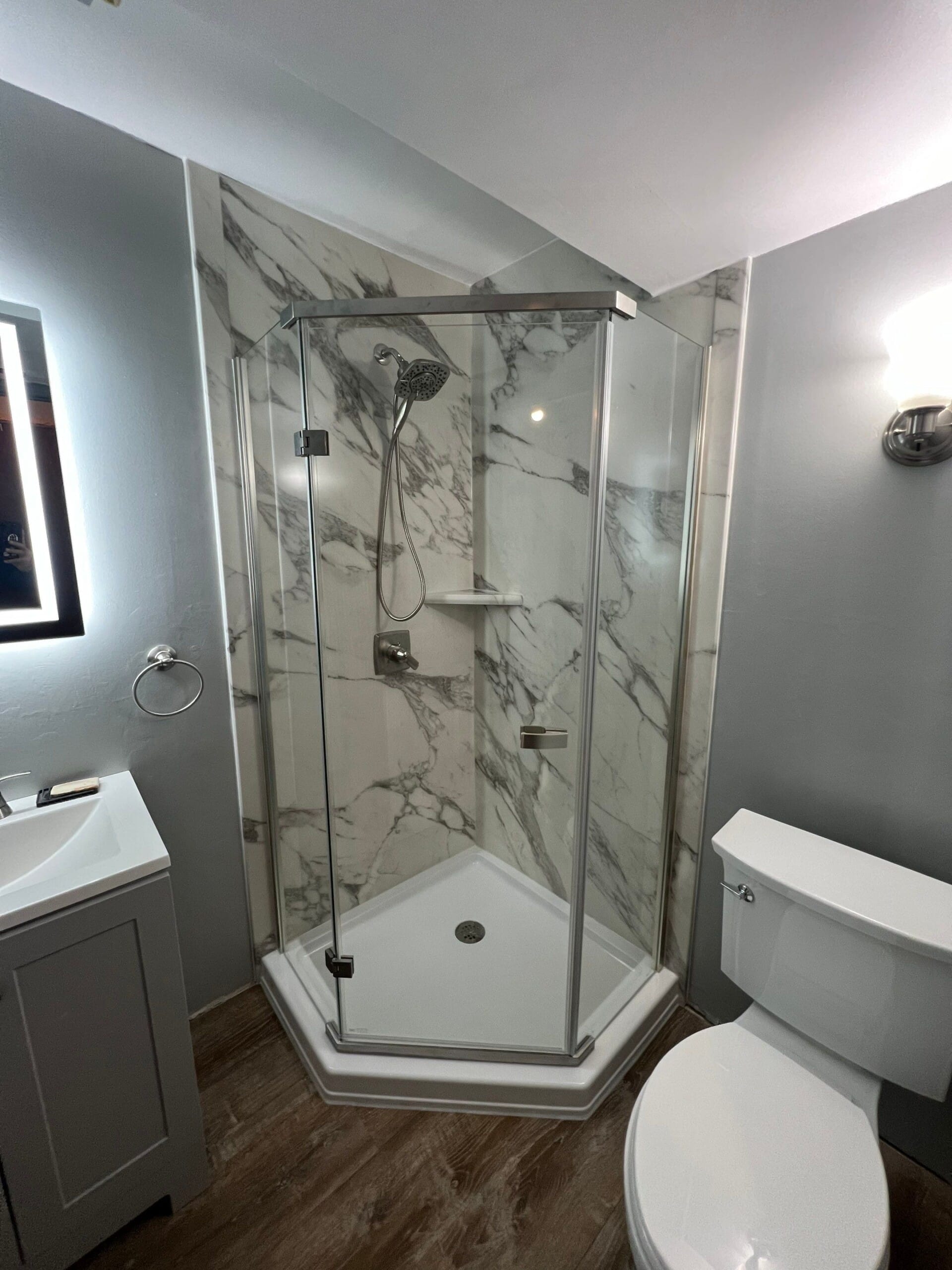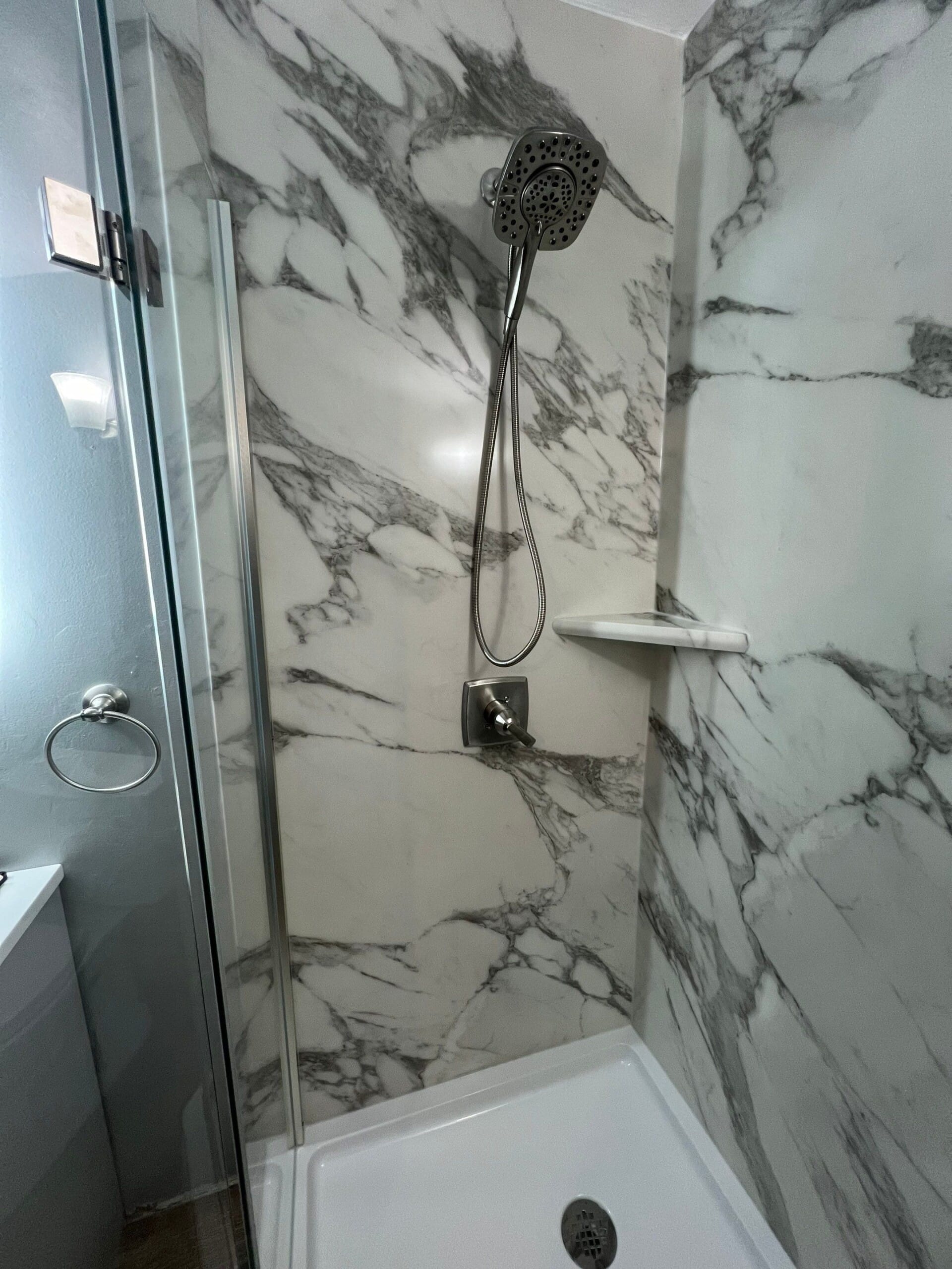 Installation involved removing the existing shower materials down to the studs in the designated area, addressing moisture-compromised components, and installing a waterproof backer system before setting the new shower base and wall panels. All seams were sealed using mold-resistant sealant to ensure long-term water containment. A corner shelf was integrated into the wall system for functional storage without visual clutter. The glass enclosure and fixtures were installed after wall completion, and the work area was cleaned and cleared the same day. The shower installation was completed within one to two days, with debris removal handled by the installation team.