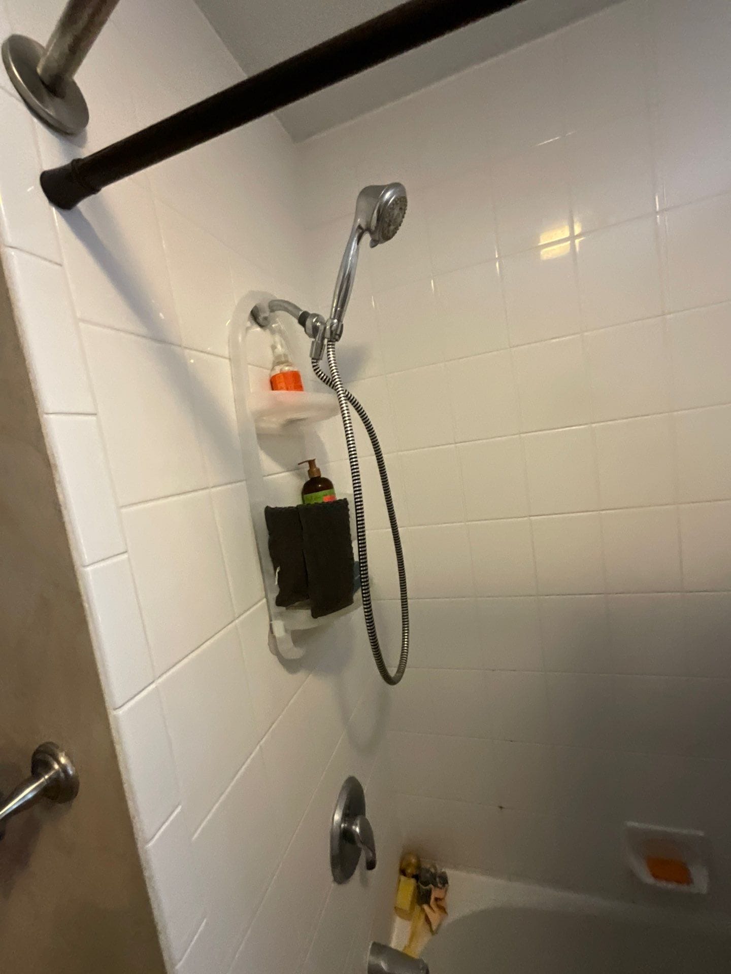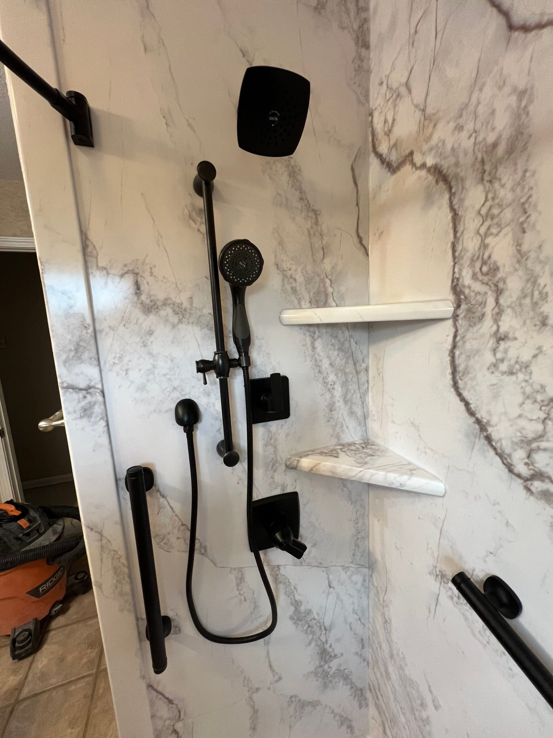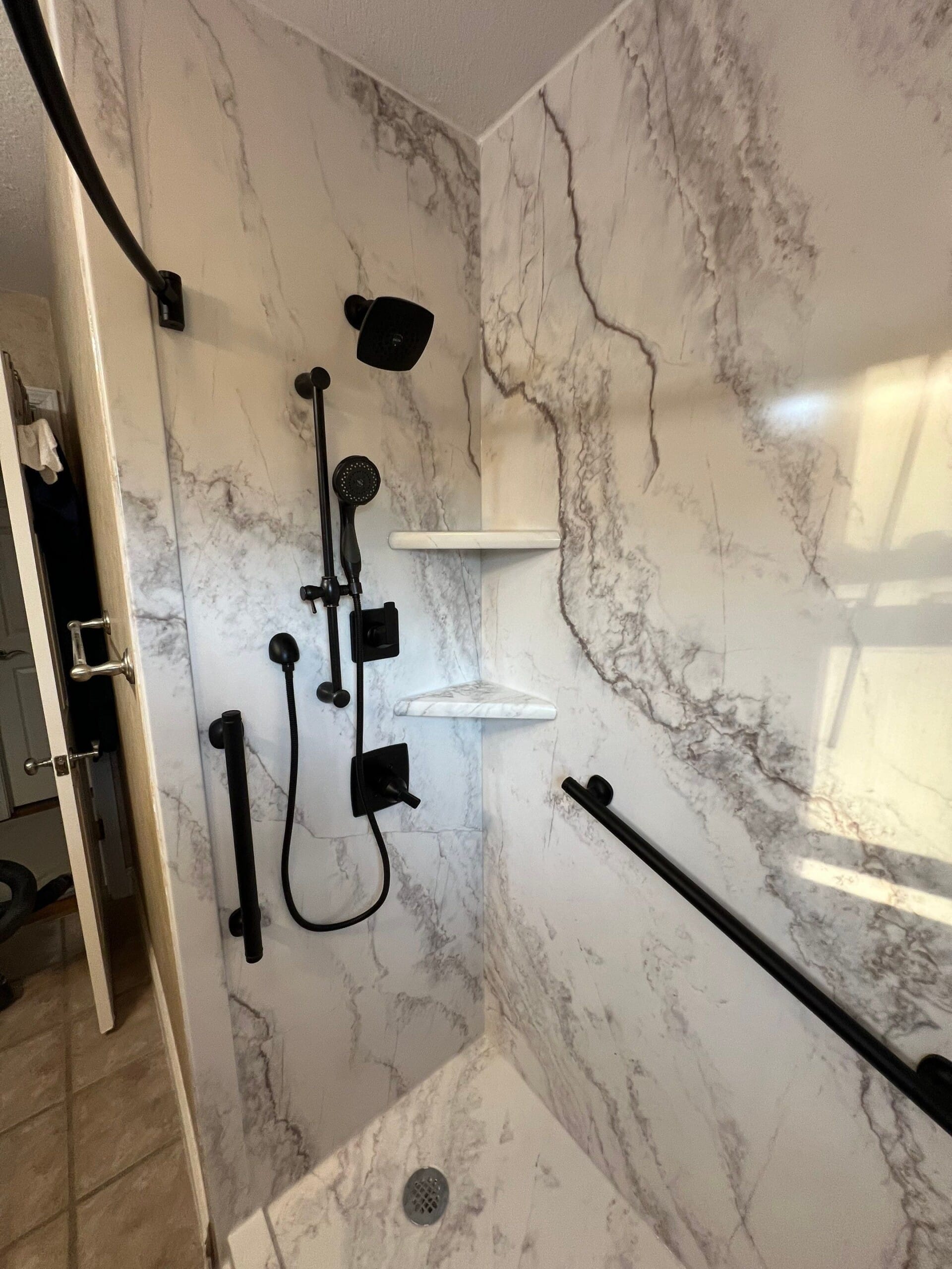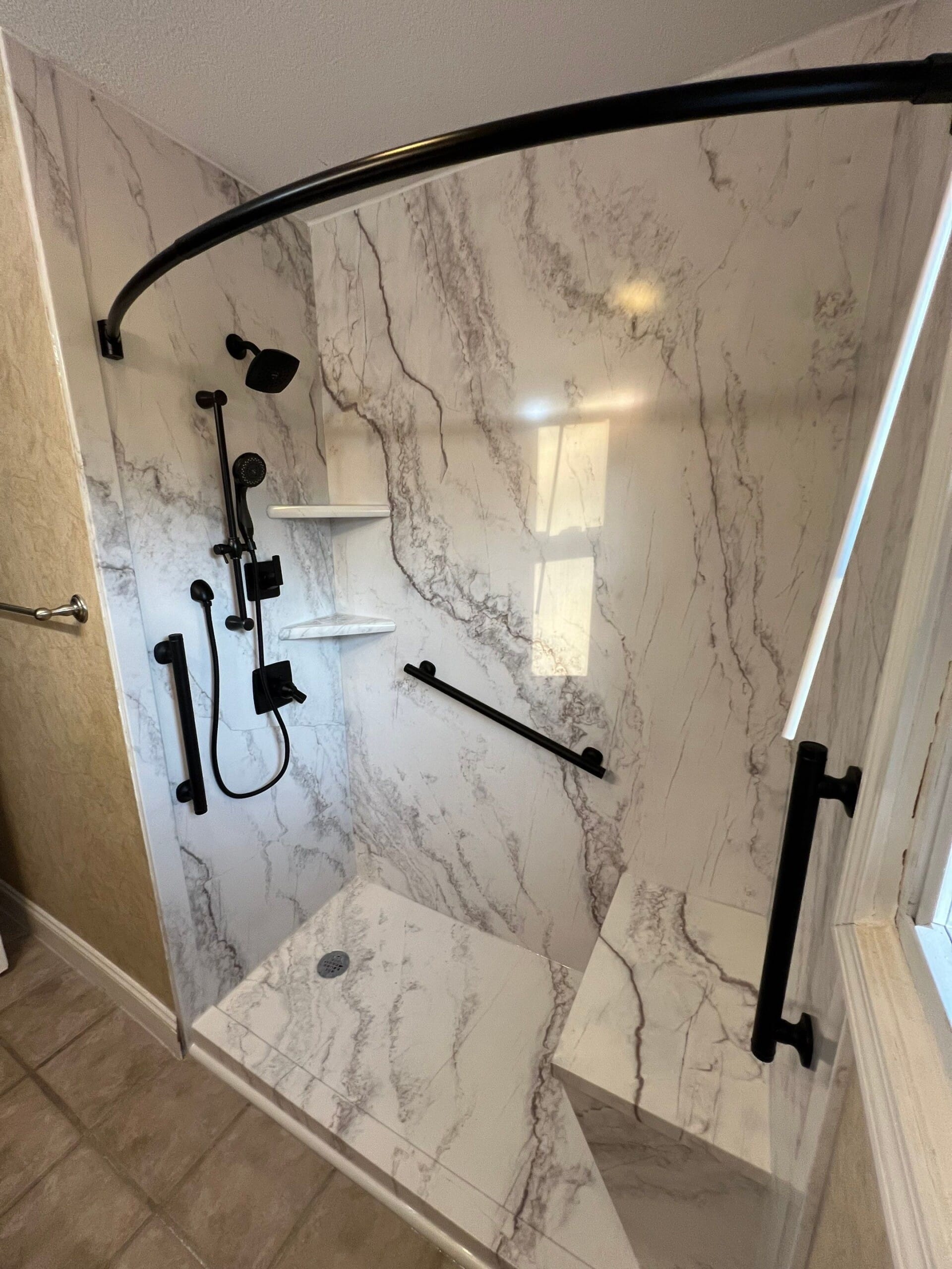 The installation included full demolition down to the studs, with subfloor inspection and any necessary repairs performed at no additional charge. A waterproof backer board was installed to support custom-fit marble-pattern composite panels reaching the ceiling. A solid non-slip shower base with a minimal threshold was added for safe, barrier-free entry. Three corner shelves and a dedicated shave shelf were integrated, and a single grab bar was installed beneath the window for support. A brushed nickel fixture system with a handheld wand was mounted on a vertical slide for adjustability. The curved curtain rod allowed flexible enclosure access without requiring a fixed door. The project was completed in under two days with floor protection and post-install cleanup included.