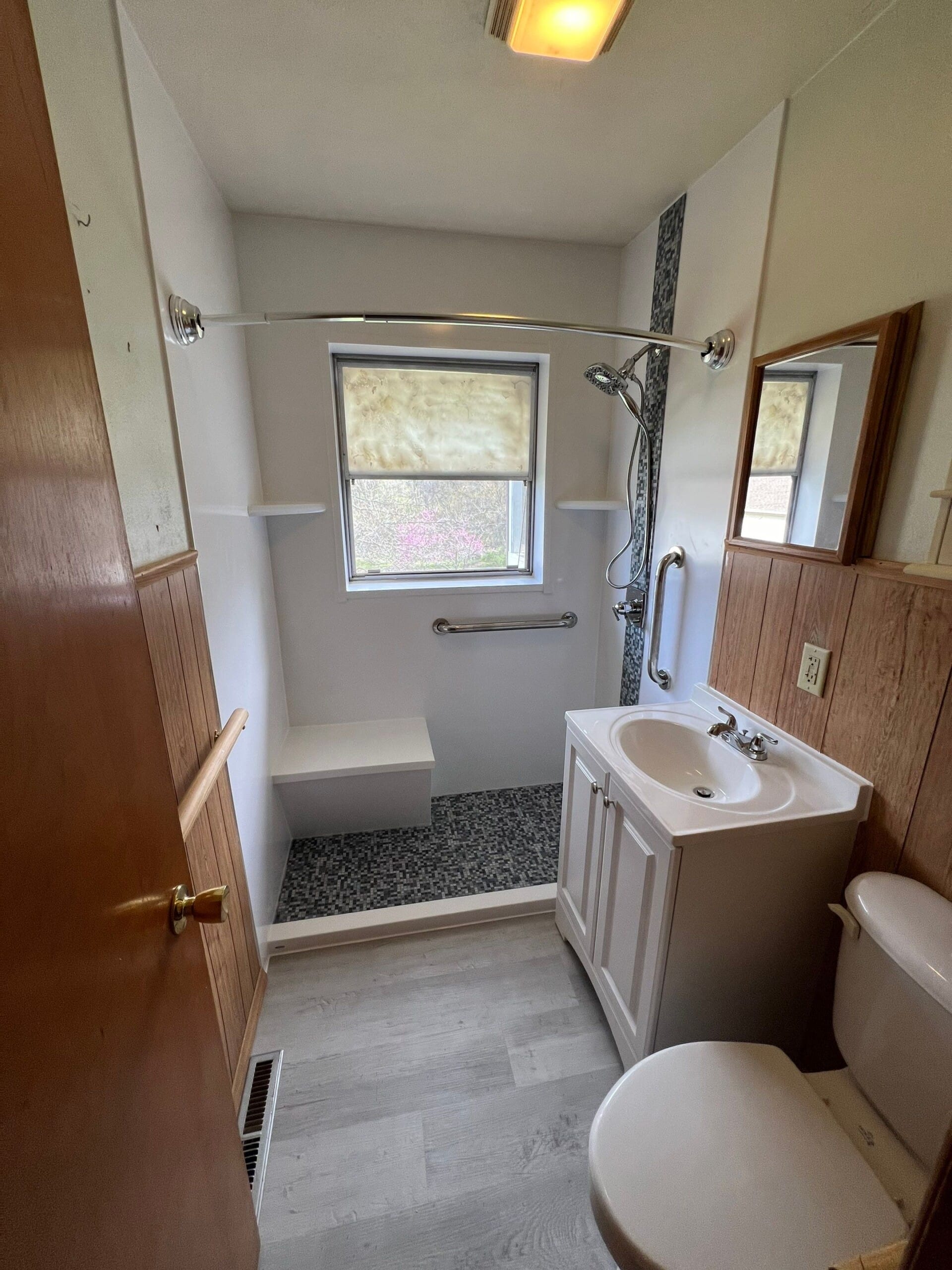 The Representative from Five Star Bath Solutions presented a grout-free composite wall system designed for durability, easy cleaning, and long-term performance. The finished shower features smooth white wall panels with a vertical mosaic accent strip, paired with a low-threshold shower base for safe and easy entry. Brushed nickel fixtures were installed, including a handheld shower system, along with a built-in bench seat, recessed shelving, and multiple grab bars for added stability. The updated space also includes a new vanity with integrated sink and modern cabinetry, creating a brighter and more functional layout. The company’s focus on bathroom remodeling and high-quality materials reinforced confidence in delivering a reliable and visually clean result.