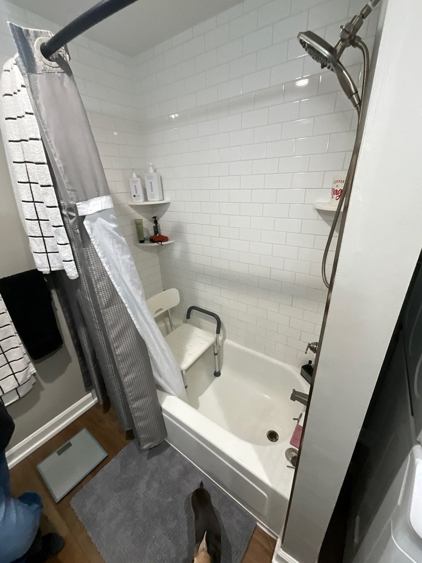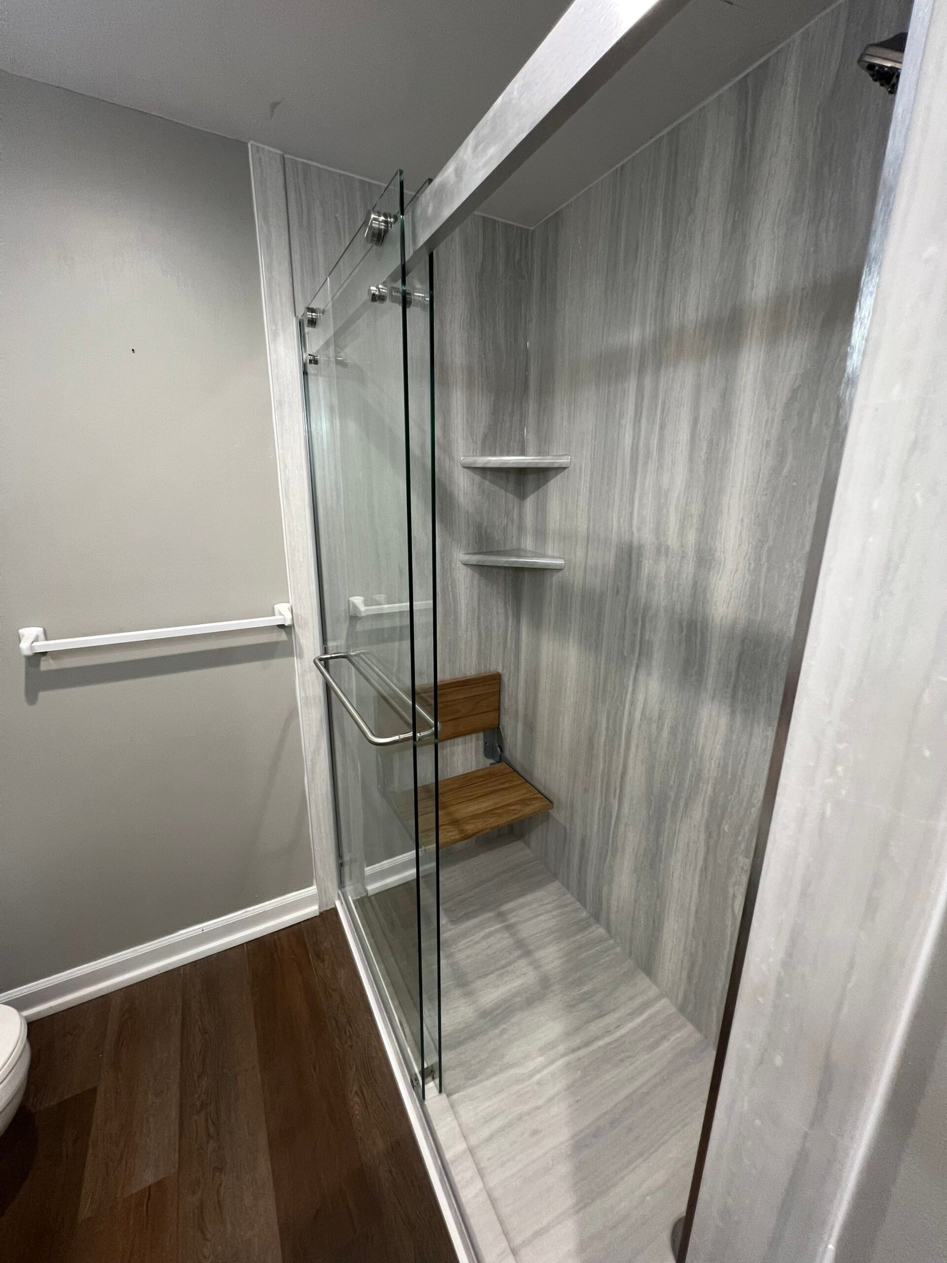 Installation was completed in one to two days by certified technicians. The team removed the existing tub, down to the studs, to allow for wall inspection and necessary structural repairs. A waterproof hydro-block backing system was added for reinforcement, and all new components—including plumbing, grab bars, seating, and shelving—were mounted based on the customer’s preferences. The fold-down teak bench and strategically placed safety rails were integrated directly into the composite panels, enhancing both usability and durability. The site was fully cleaned and debris removed following installation.