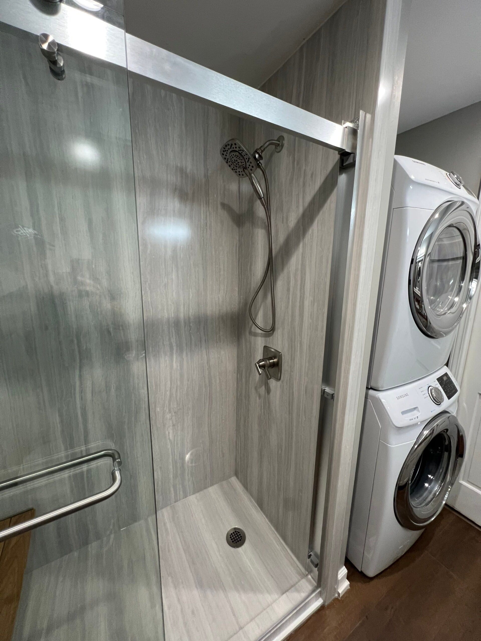 The Five Star Bath Solutions representative presented a tailored shower solution focused on long-term safety and comfort. Using antimicrobial, grout-free wall panels in a light striated gray finish, the system provides a modern aesthetic while addressing mold and cleaning concerns. A full-glass bypass door was selected for added containment and visual openness. The representative demonstrated how grab bars could be placed according to user specifications and explained the benefits of their commercial-grade fixtures, including the option of upgrading to a Delta handheld shower system. The design not only matched functional needs but also helped visually coordinate with other bathrooms in the home.