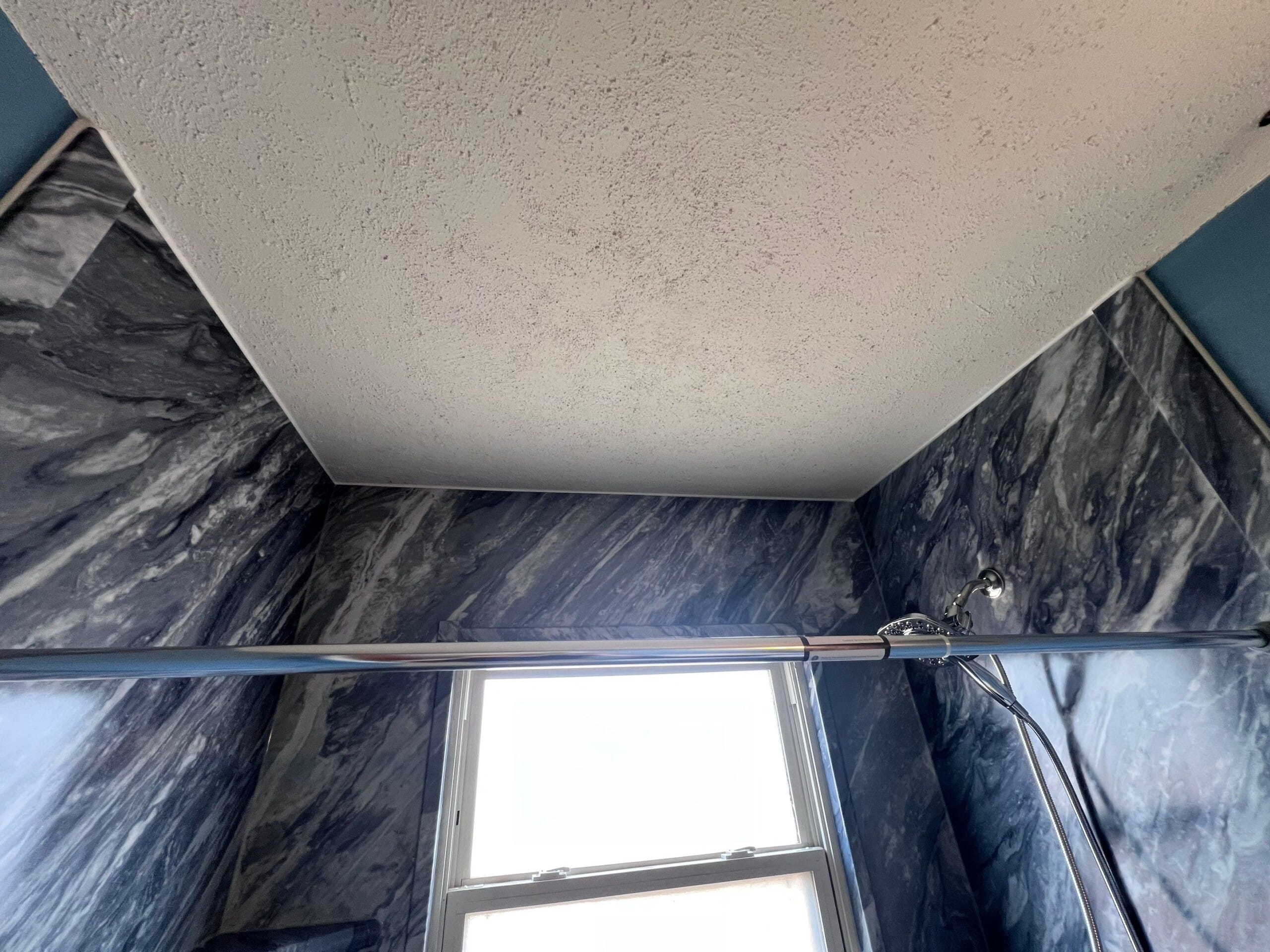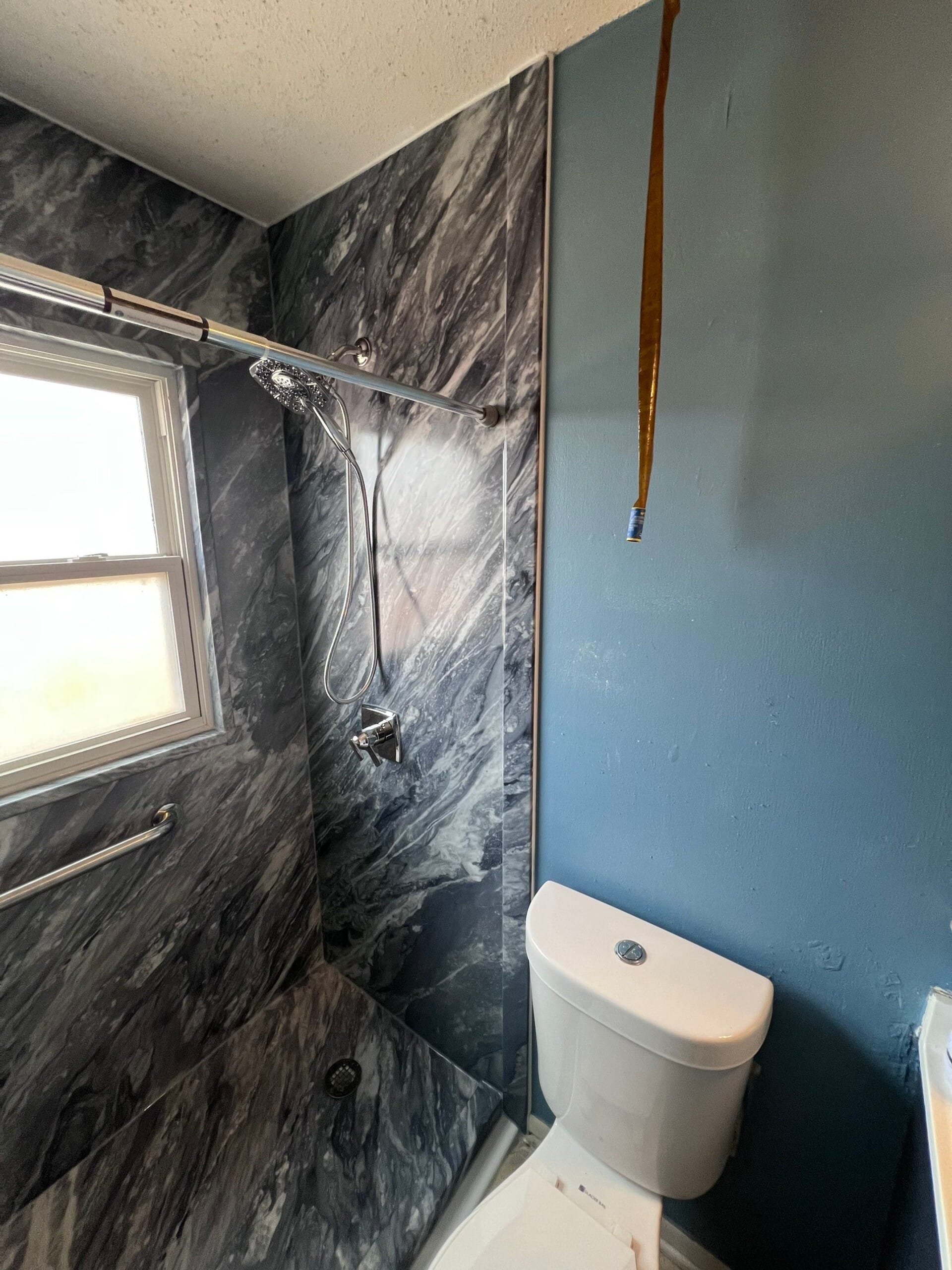 The Five Star Bath Solutions representative presented a grout-free Sentrel composite wall system designed to replicate natural stone while offering durability and easy maintenance. The selected finish features a deep grey and charcoal marble pattern with flowing white veining, extending across the shower walls and sloped ceiling line for a cohesive look. Chrome fixtures were installed, including a handheld shower system and matching control trim. Integrated corner shelving provides practical storage, and a horizontal grab bar was mounted beneath the window to enhance stability. The low-profile shower base complements the wall pattern while maintaining a clean and streamlined appearance.