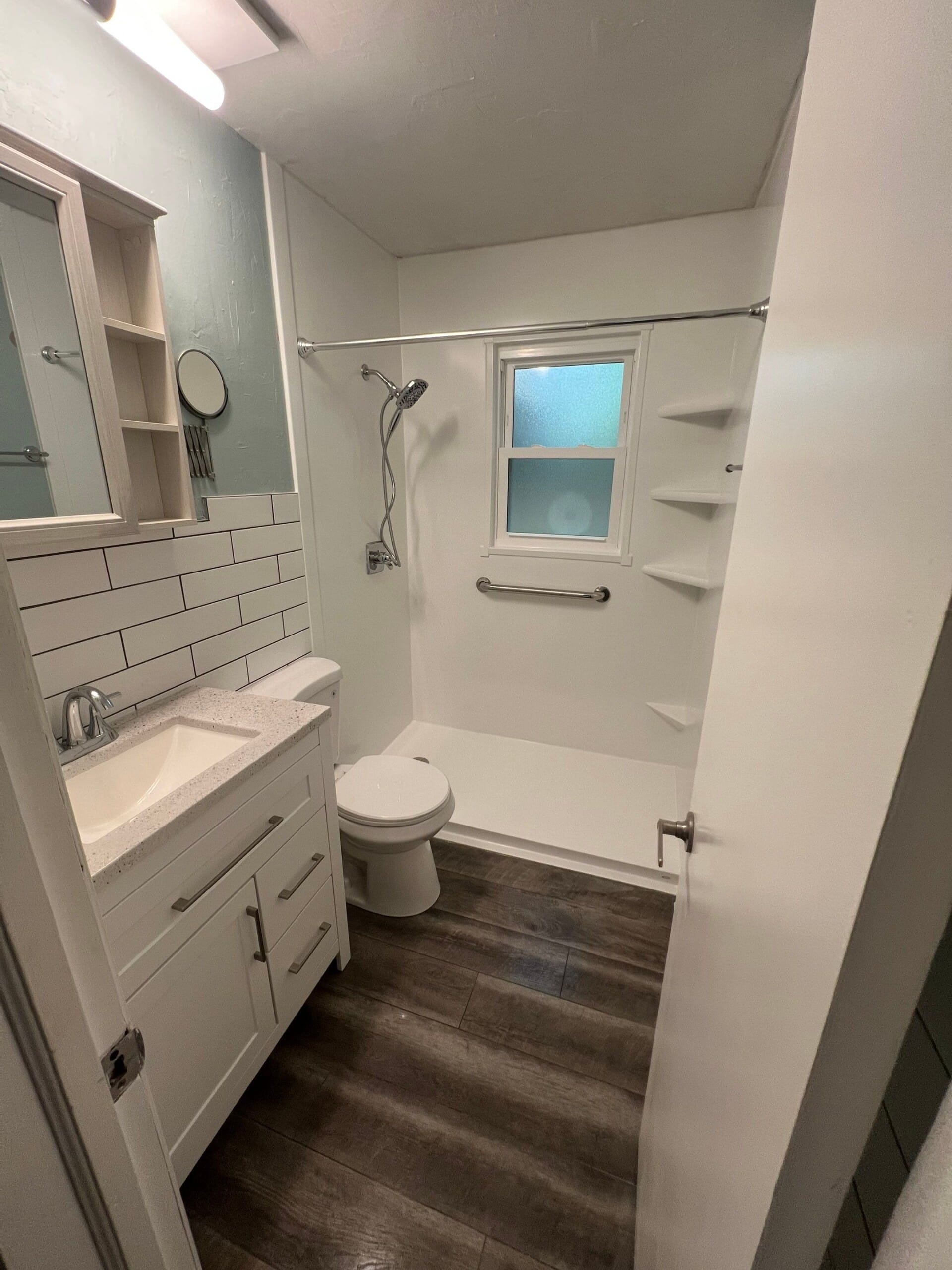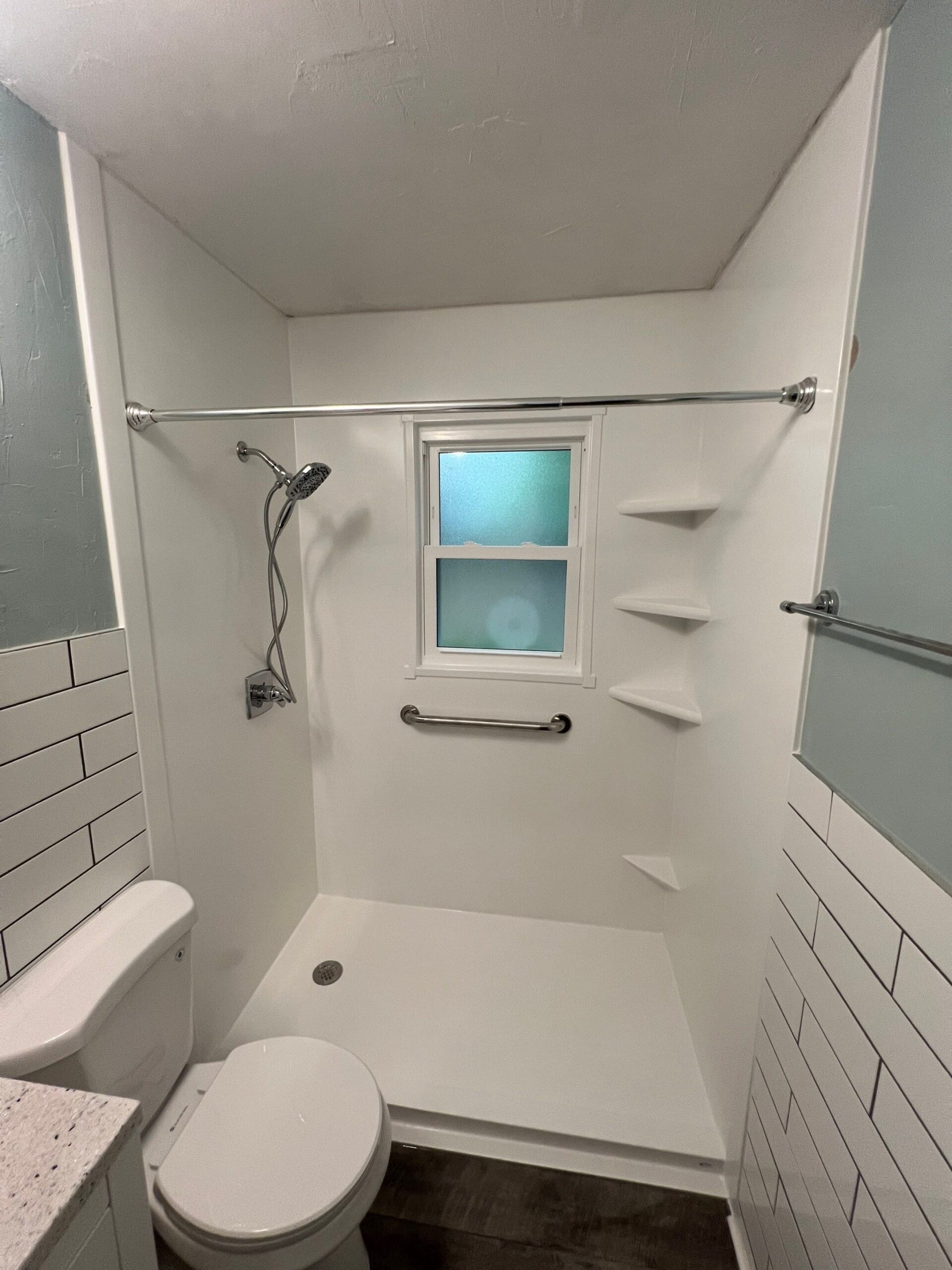 The updated wet area includes a low-threshold shower base with fully integrated corner shelving. Grout-free composite wall panels in bright white eliminate the need for tile upkeep while creating a clean, seamless look. A new handheld showerhead with flexible hose was mounted on the side wall, enhancing ease of use. A horizontal ADA-compliant grab bar was installed under the window for secure support during entry and exit. The curtain rod was retained, providing water containment without the need for a glass door.