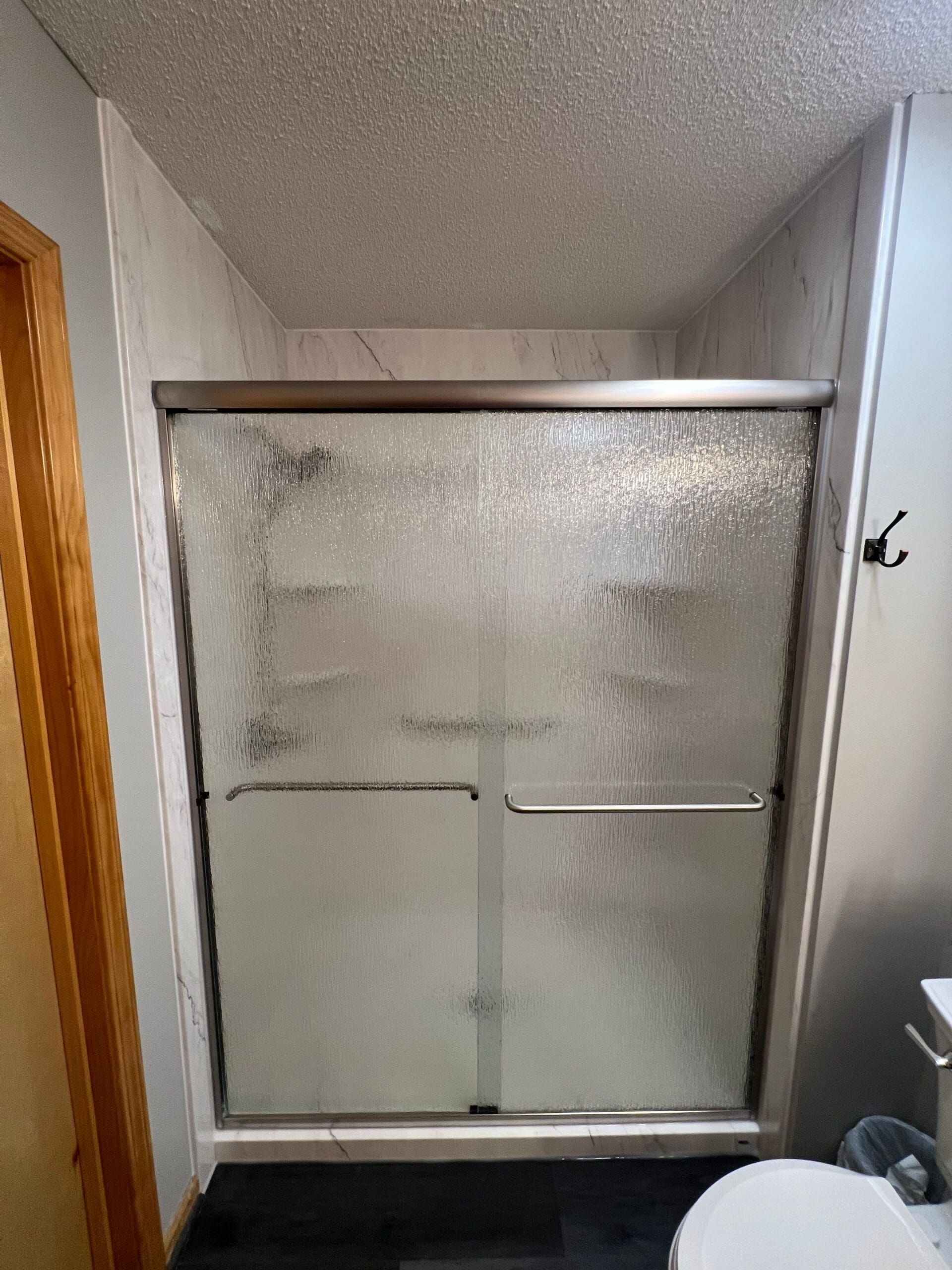 The Representative from Five Star Bath Solutions presented a grout-free composite wall system designed to resist mold and simplify cleaning. The finished shower features large-format marble-pattern wall panels in a white and gray tone, paired with a low-threshold shower base for safer access. Chrome fixtures were installed, including a handheld shower system, along with a horizontal grab bar for stability. A sliding glass door with an obscured finish was installed to provide privacy while maintaining a clean and functional enclosure. The company’s focus on durable materials and bathroom-specific expertise reinforced confidence in delivering a low-maintenance and long-lasting solution.