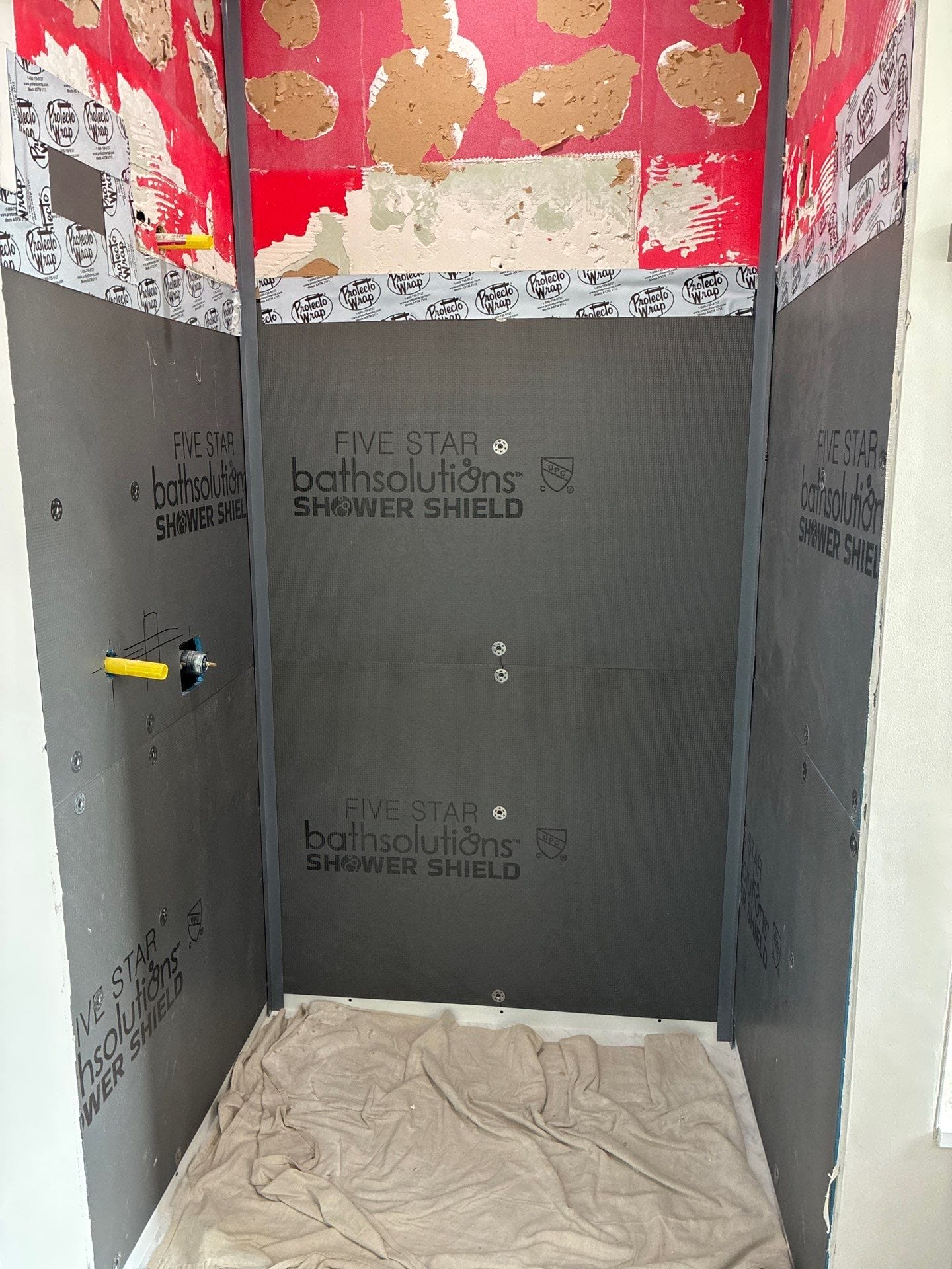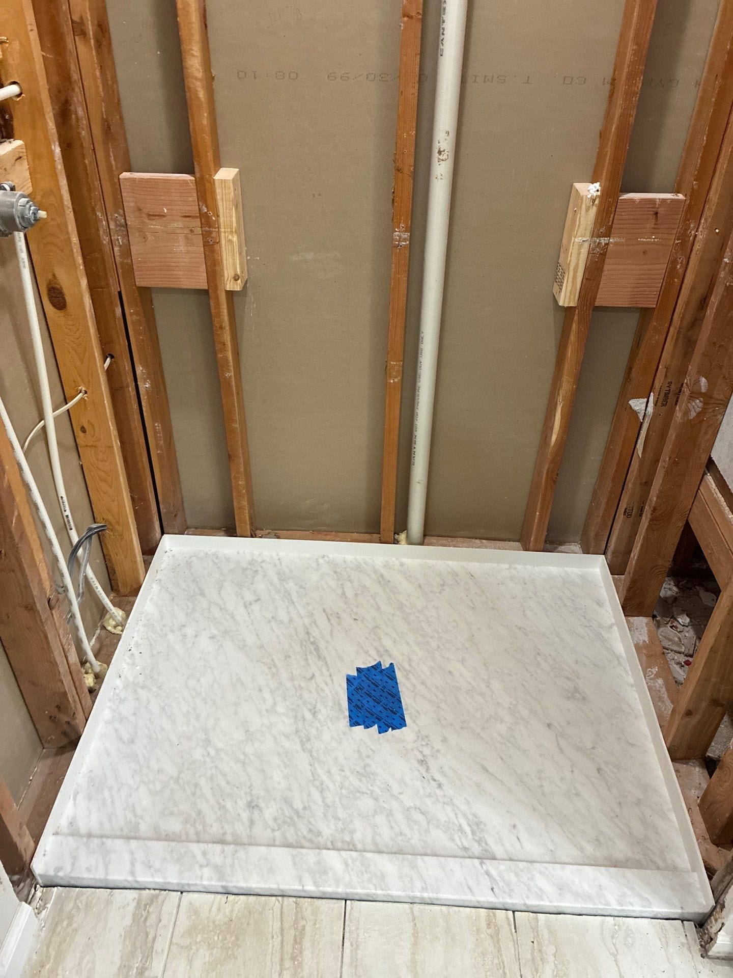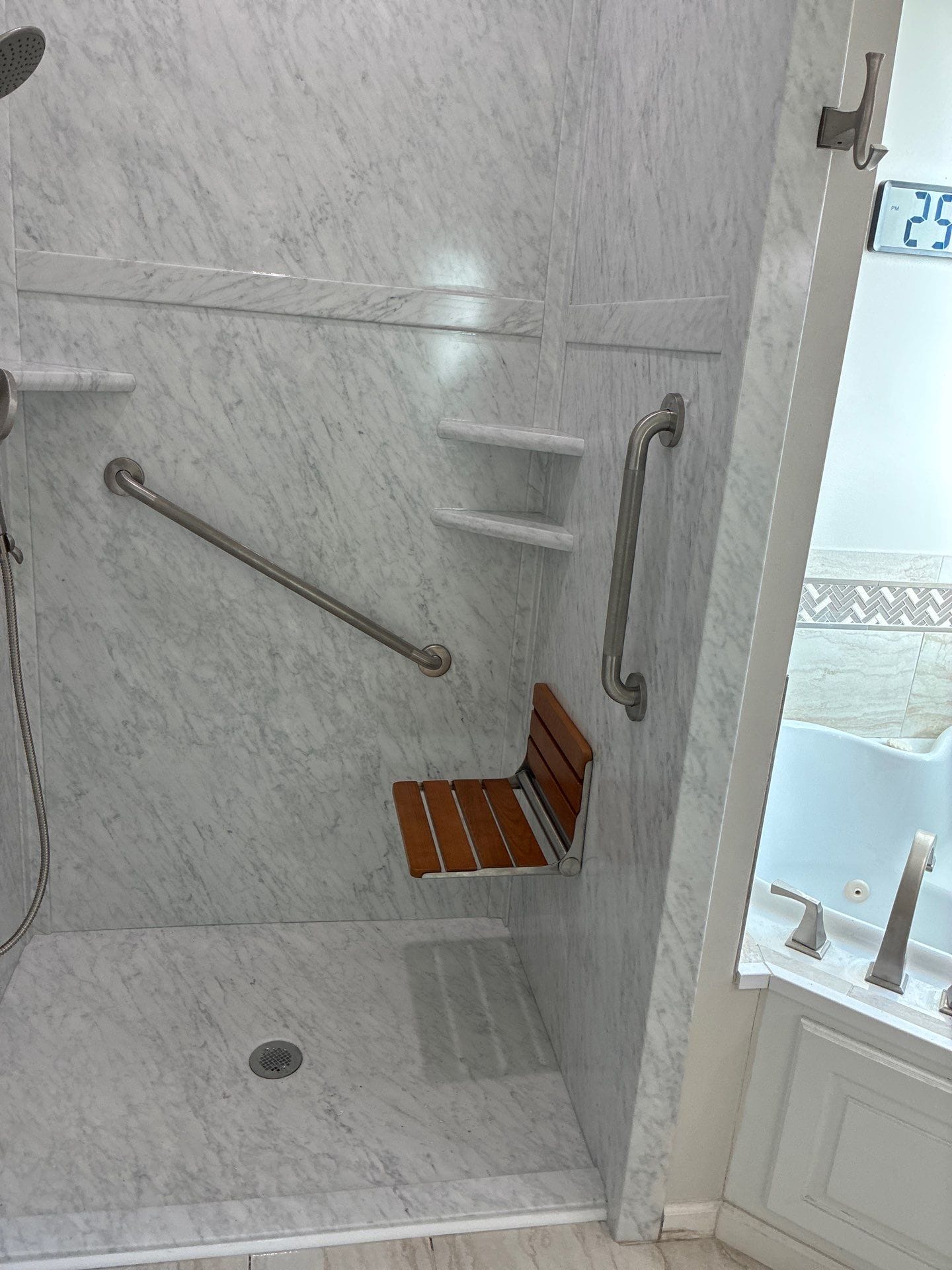 Installation followed a detailed, professional process to ensure durability and precision. The existing tub and wall system were removed down to the studs, allowing for full inspection and any necessary structural or plumbing updates. A low-threshold shower base was installed to create a nearly flush entry, improving accessibility and flow. Waterproof backing was applied before installing the full-height wall panels with a secure locking system for watertight performance. Fixtures, grab bars, shelving, and seating elements, including a fold-down teak bench, were installed according to the finalized layout, resulting in a spacious and highly functional walk-in shower.