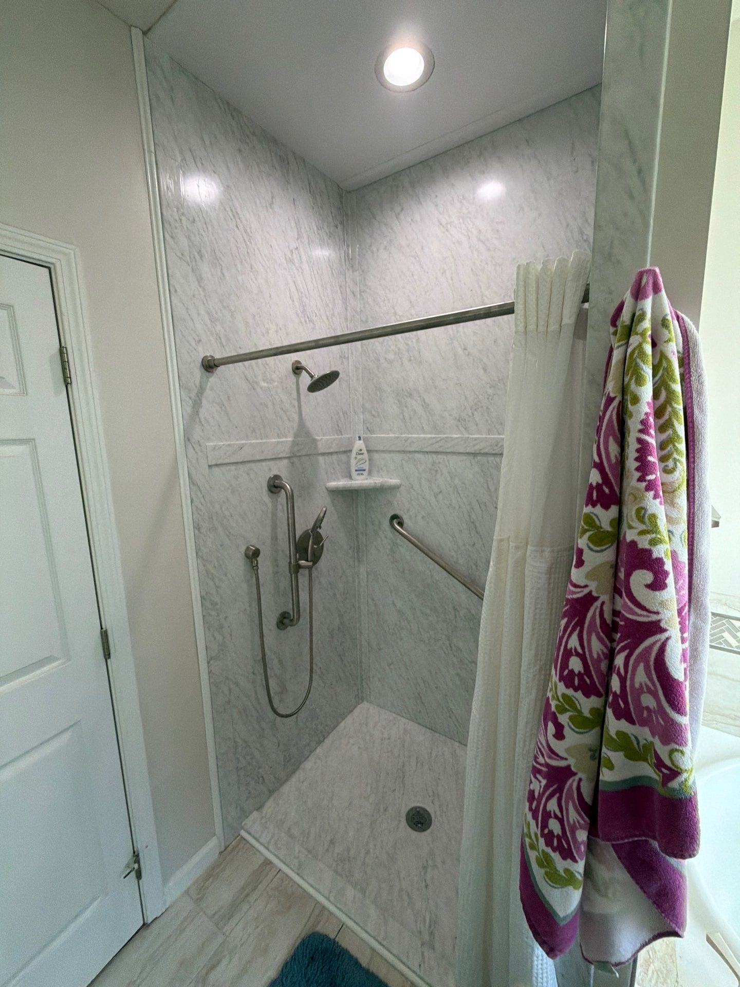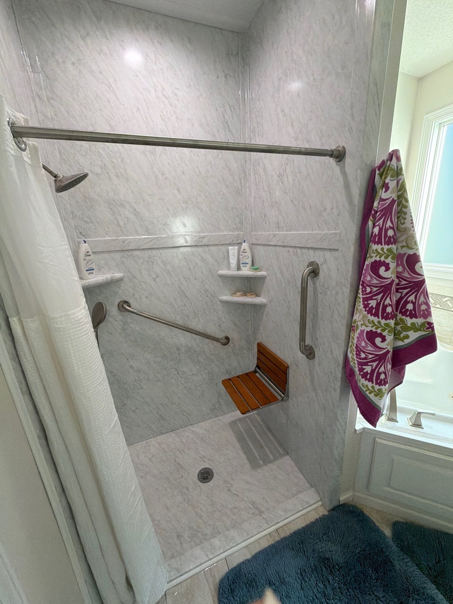 The Five Star Bath Solutions representative presented a Smart Choice wall system using light marble-pattern composite panels that reflect a clean white and gray aesthetic, aligning with the customer’s preference for a brighter, more modern look. The grout-free, non-porous material eliminates maintenance concerns while delivering the appearance of natural stone. Brushed nickel fixtures were installed, including a square-style showerhead and a handheld shower system for versatility. The design incorporated a long horizontal recessed niche for storage, along with additional corner shelving, and multiple grab bars positioned for stability and ease of use within the walk-in shower.