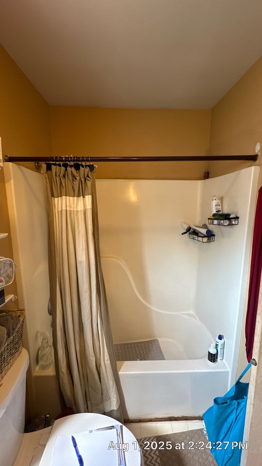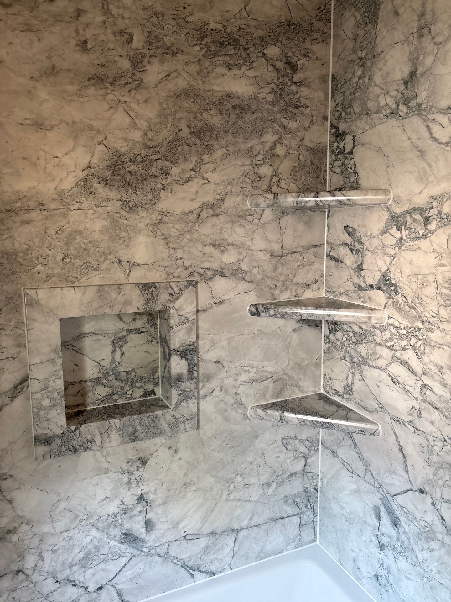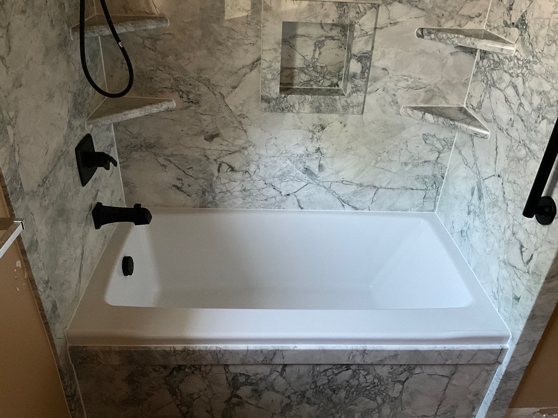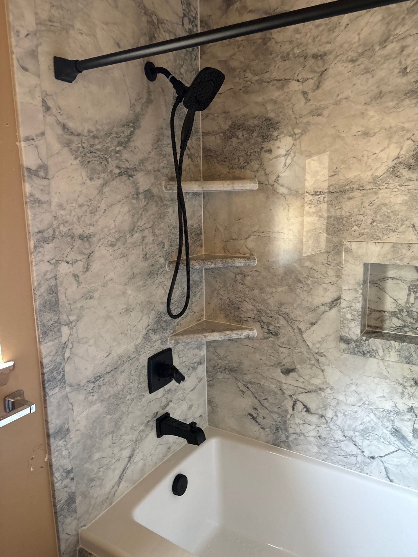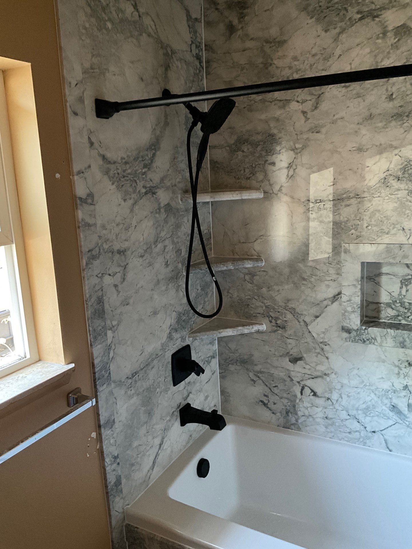 The remodeled unit features a white composite tub with three gray-marble patterned wall panels in a grout-free, antimicrobial finish. A matte black hardware system was installed including tub filler, diverter, and handheld showerhead on a flexible hose. Three corner shelves were added for vertical storage along one wall, and a recessed wall niche provides built-in shelving. A black curtain rod was installed to complete the update, offering accessibility while maintaining a clean, open visual. A grab bar was mounted near the tub wall for additional safety support.