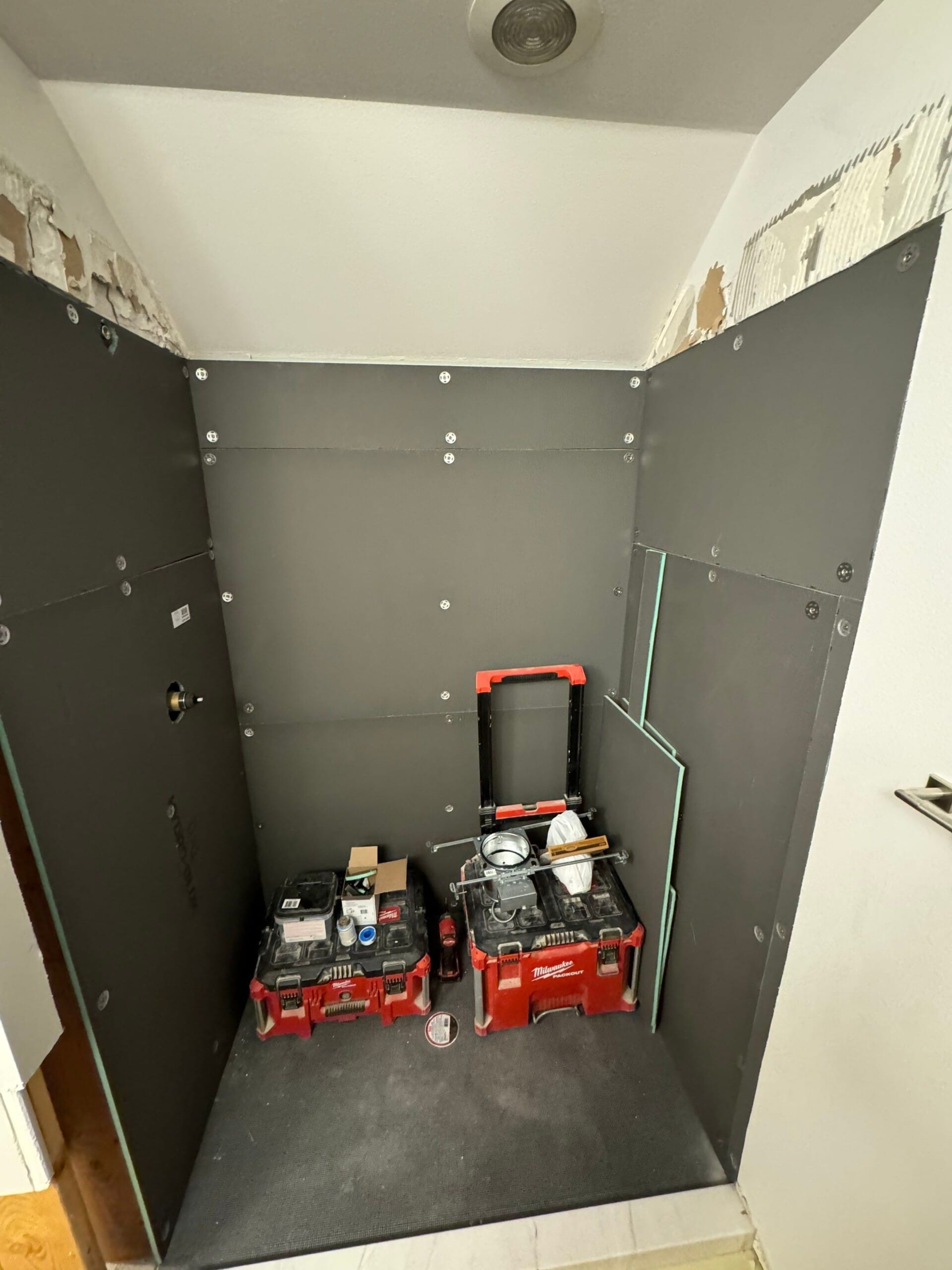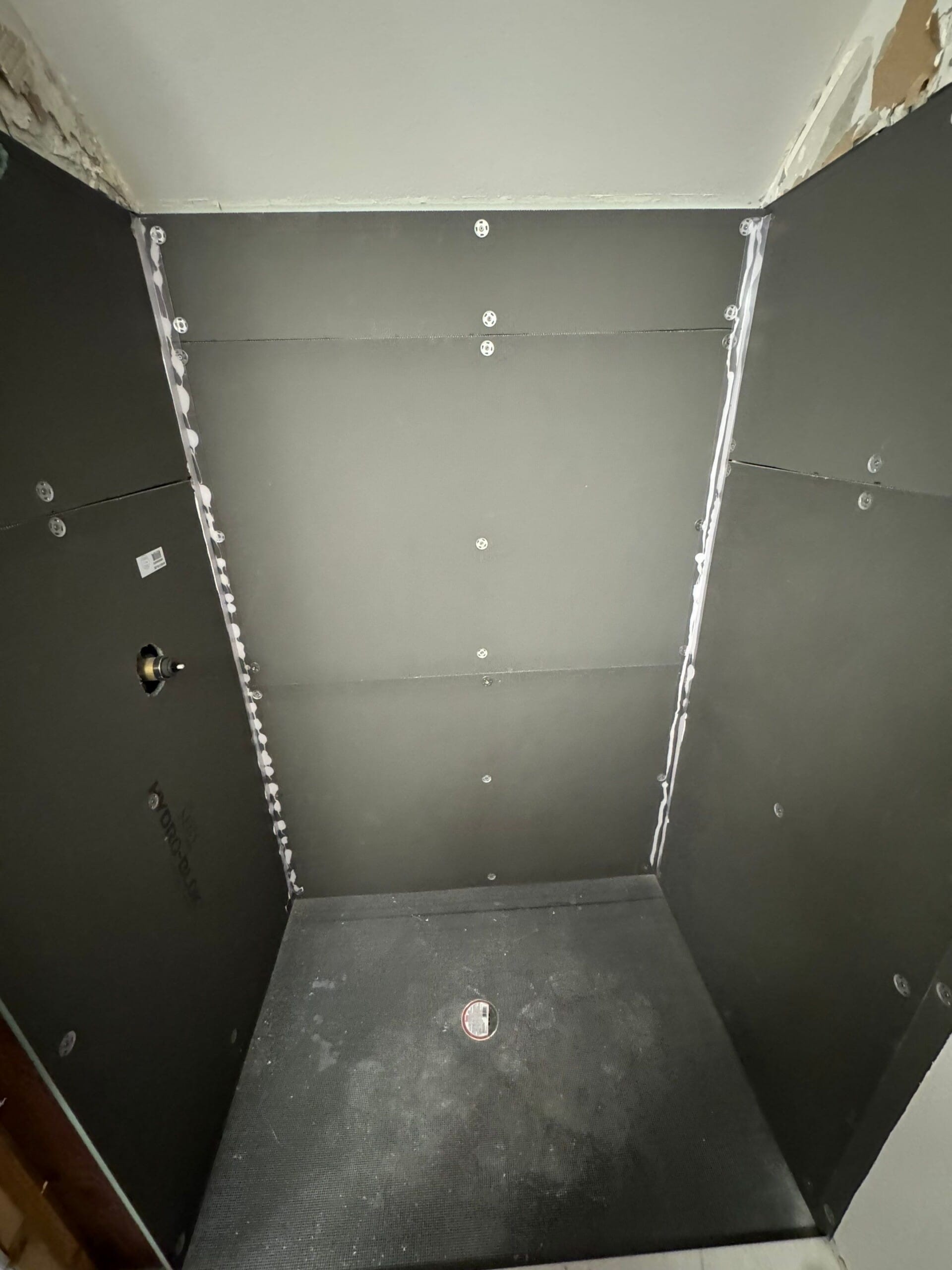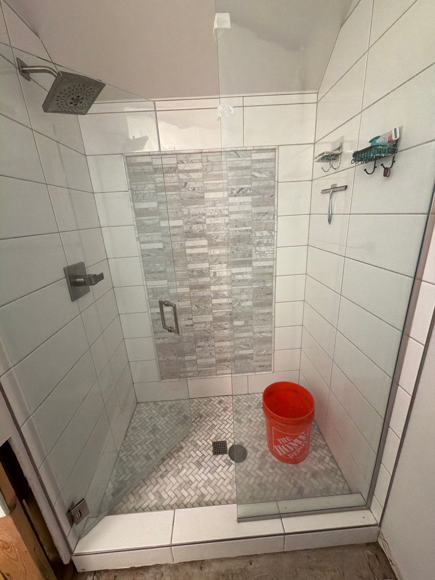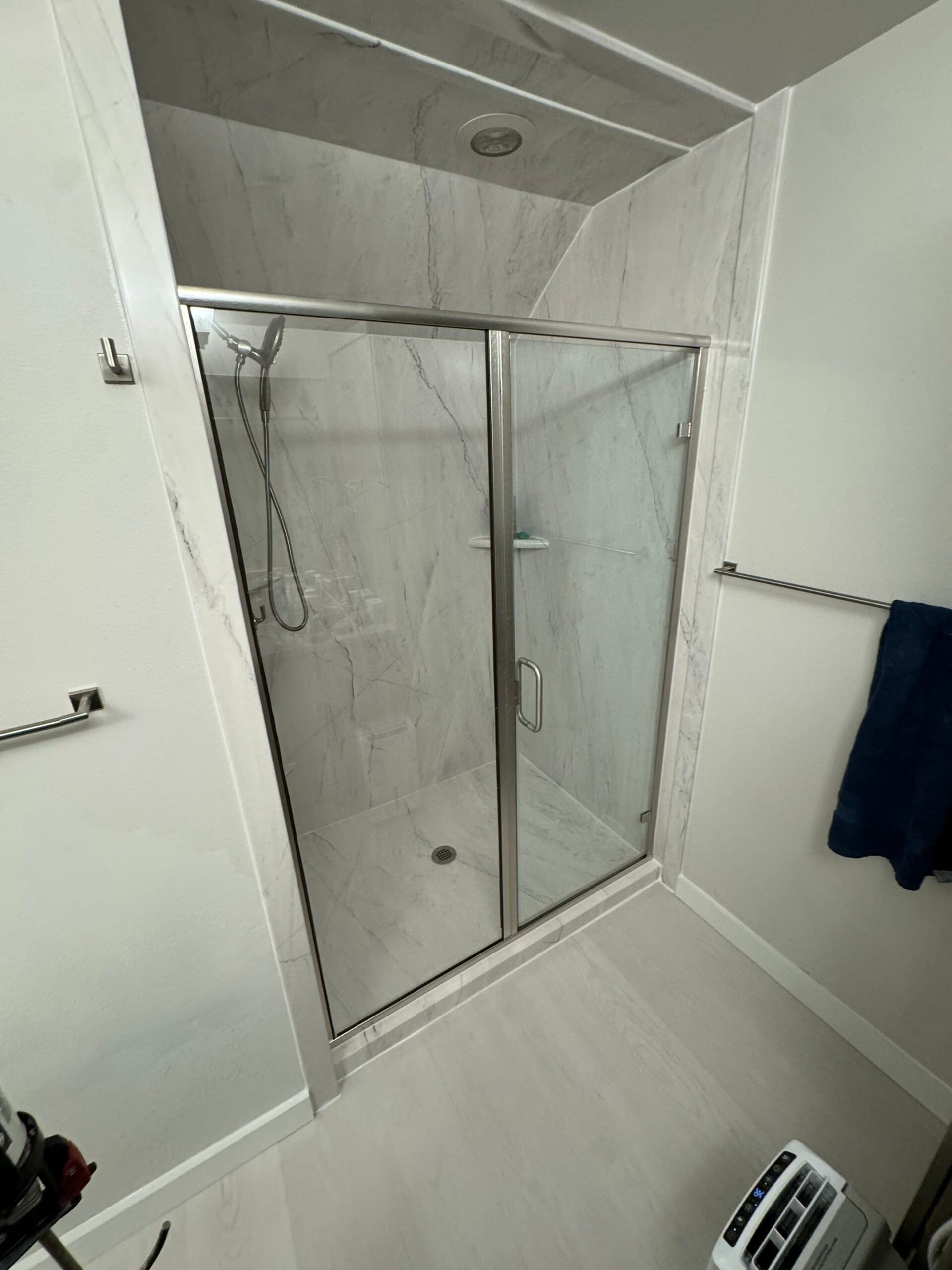 The installation process involved a complete demolition to the underlying studs to facilitate the replacement of old plumbing lines and the installation of a waterproof Shower Shield backing system. A custom solid-core non-slip shower base was fitted, along with a recessed storage shelf and safety grab bars positioned at specific locations for optimal support. The project was completed within a one-to-two-day timeframe, with the crew maintaining a clean worksite and removing all debris upon conclusion.