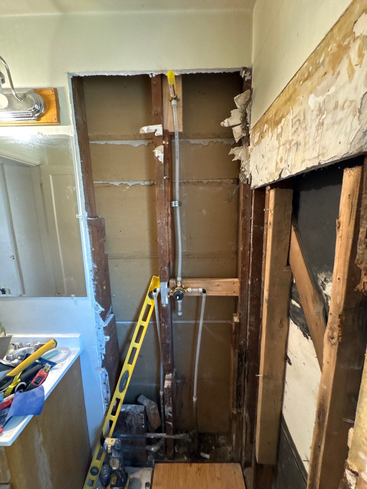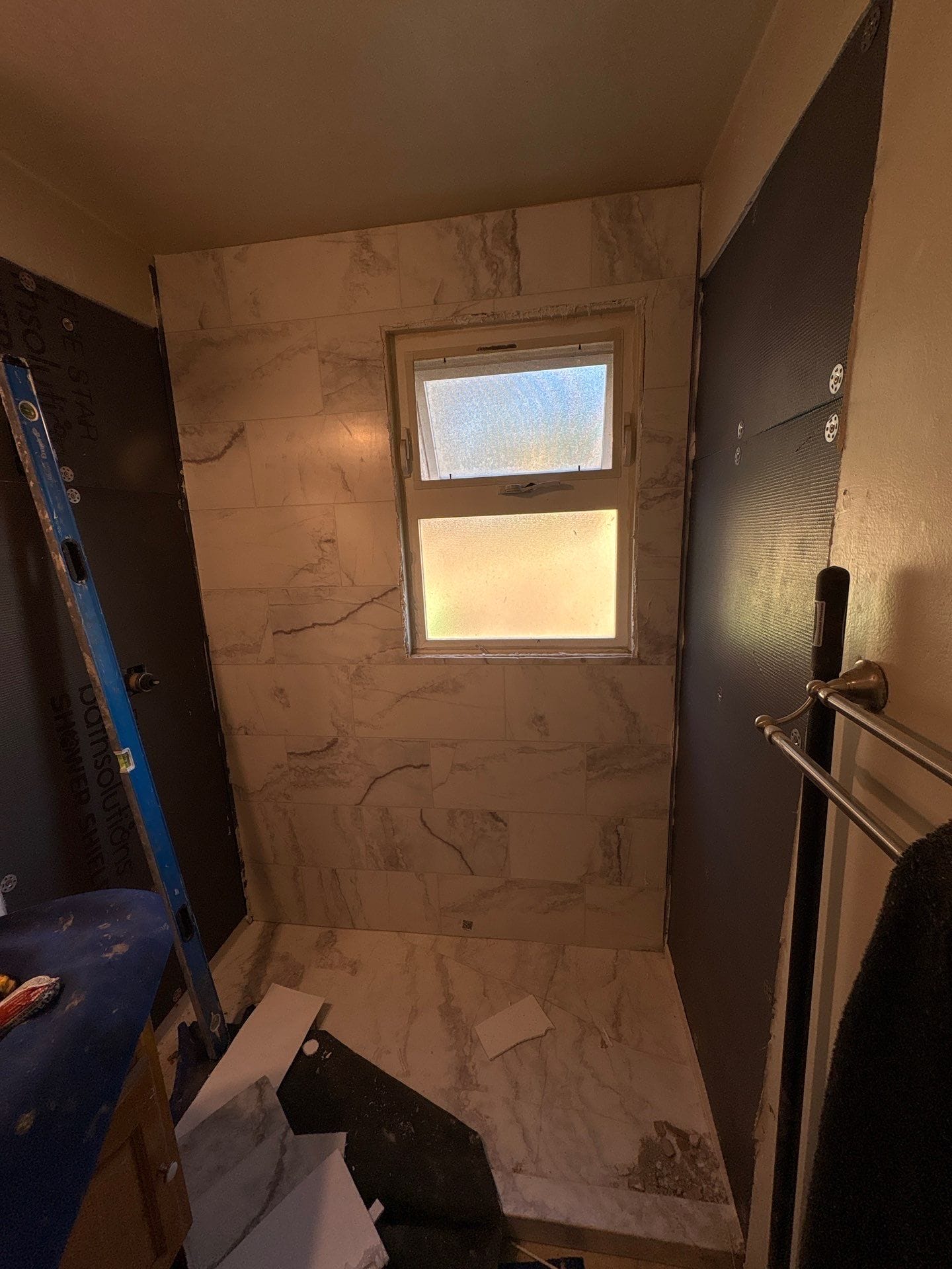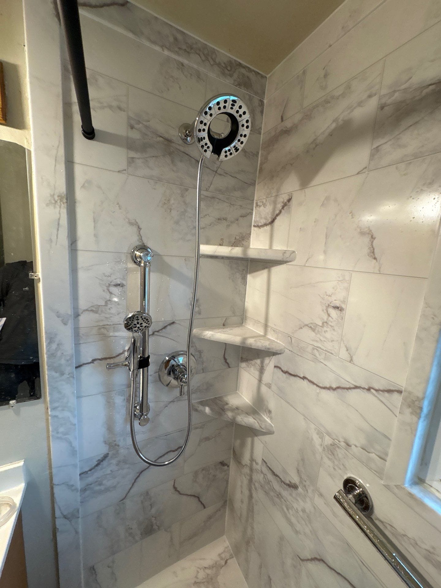 Installation was completed within two days. Crews handled demolition and disposal on day one, rebuilt the wet area with new framing and backer, installed the composite shower pan, mounted the Everest panel system, and secured all accessories including grab bars and bench. Plumbing was upgraded to match the new valve and handheld fixture. Protective floor coverings were used throughout and all tools were removed after final inspection.