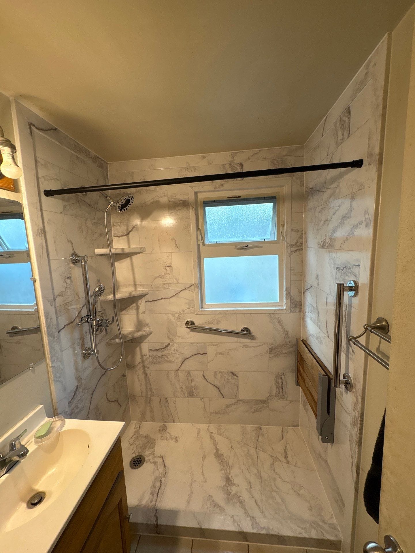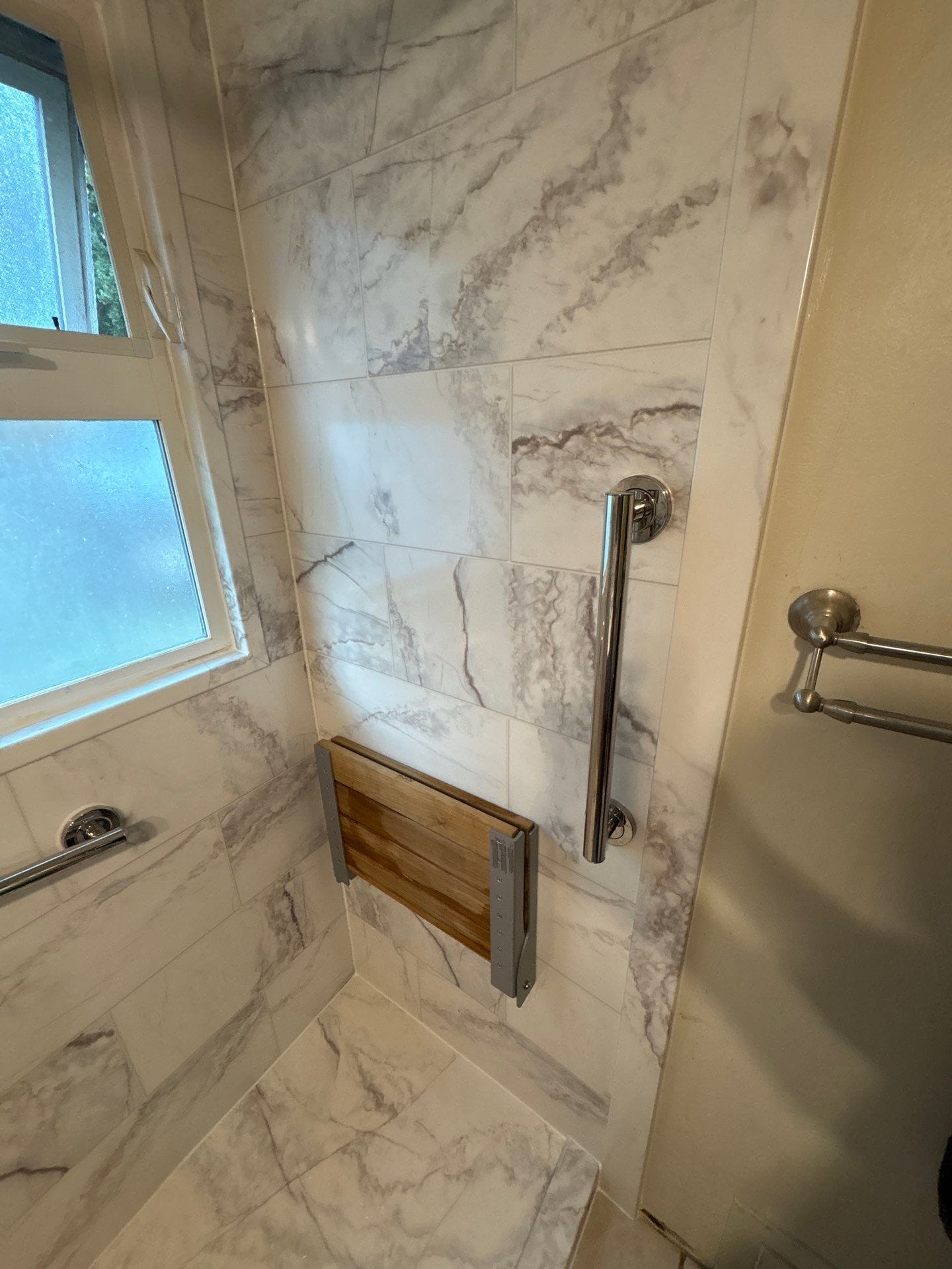 The selected shower system included Everest-style antimicrobial composite wall panels with full-height installation and seamless surface integration. A matte, stone-like finish presented a more upscale visual than the original plain tub surround. Fixtures featured a vertical slide bar showerhead system with handheld capability, matched in chrome to surrounding hardware. Three corner shelves offered efficient storage without bulk. A teak-finish fold-down bench was mounted opposite the showerhead for flexible seated use. Curtain-style entry was retained for unobstructed movement and cleaning access.
