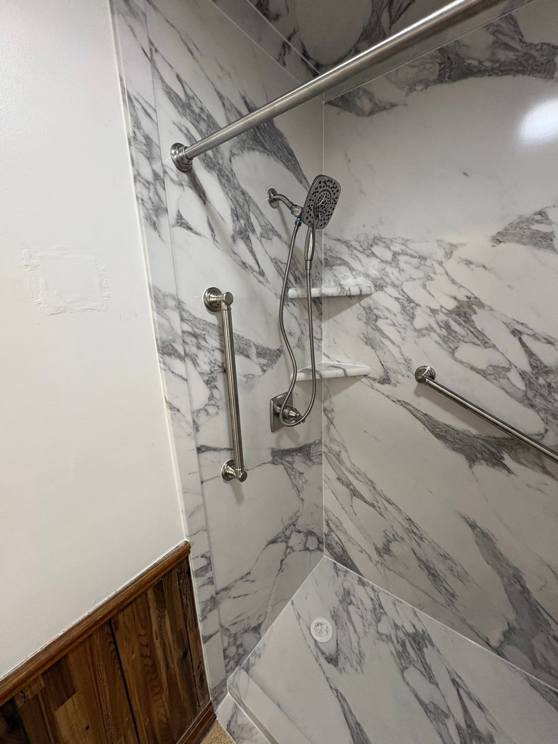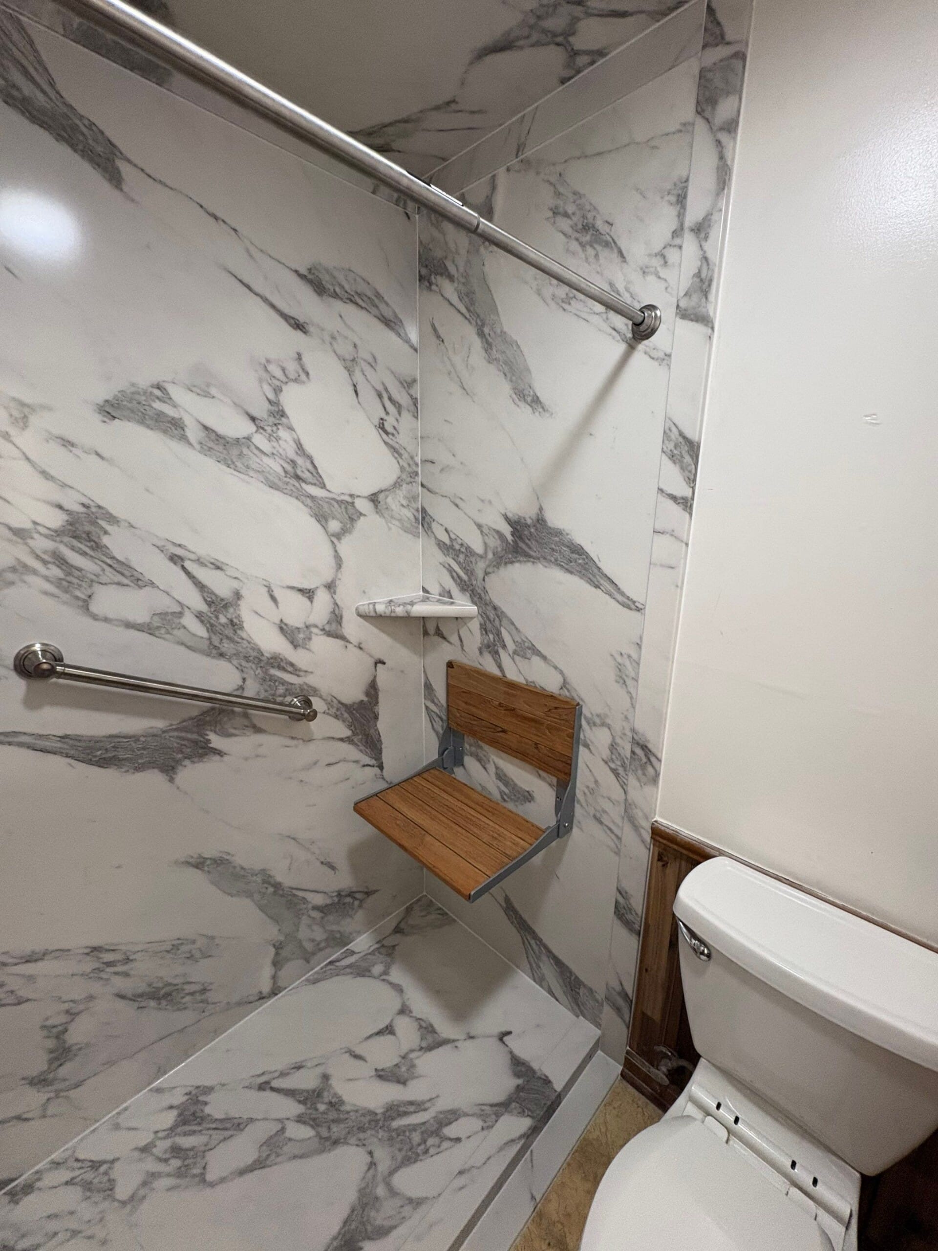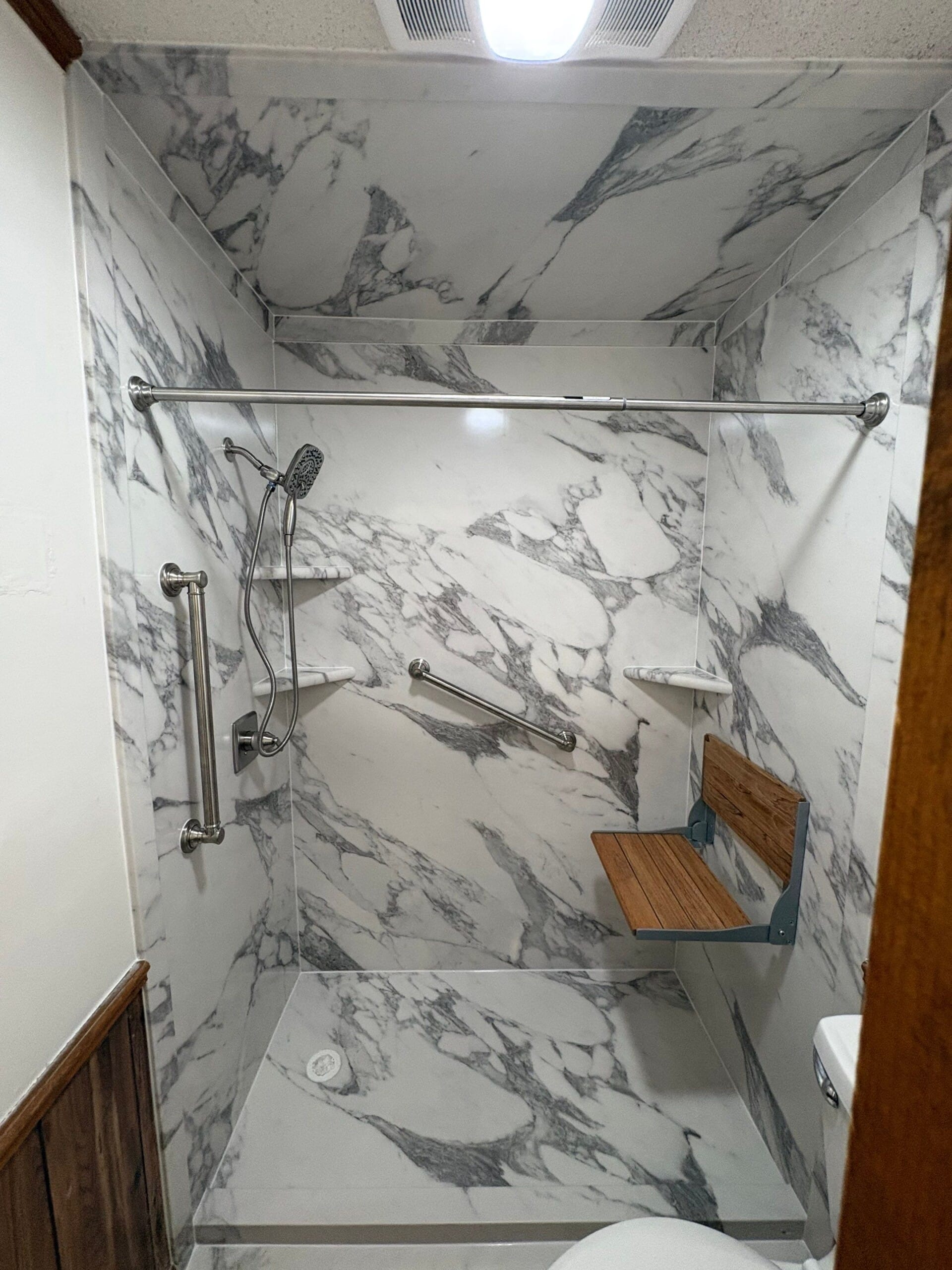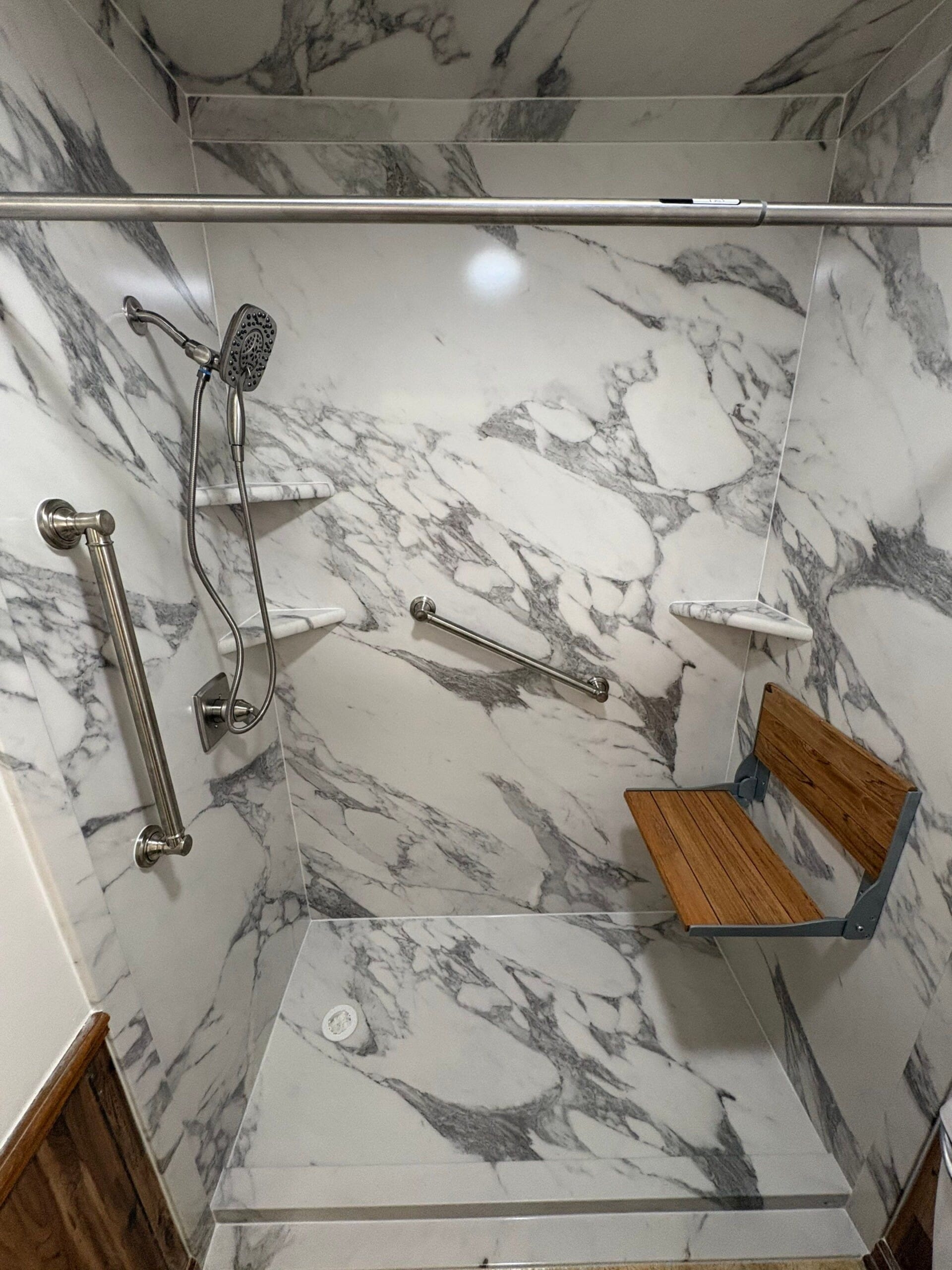 The new system includes marble-style composite wall panels in a cool gray vein pattern, paired with brushed nickel fixtures and a modern handheld showerhead. Two integrated shelves and a wall-mounted teak bench were installed for convenience and comfort. A curtain rod replaces the old tension setup, omitting the previously planned hinged glass door while preserving visual openness. Grab bars were positioned vertically at the entrance and diagonally along the back wall to support entry and seated bathing.