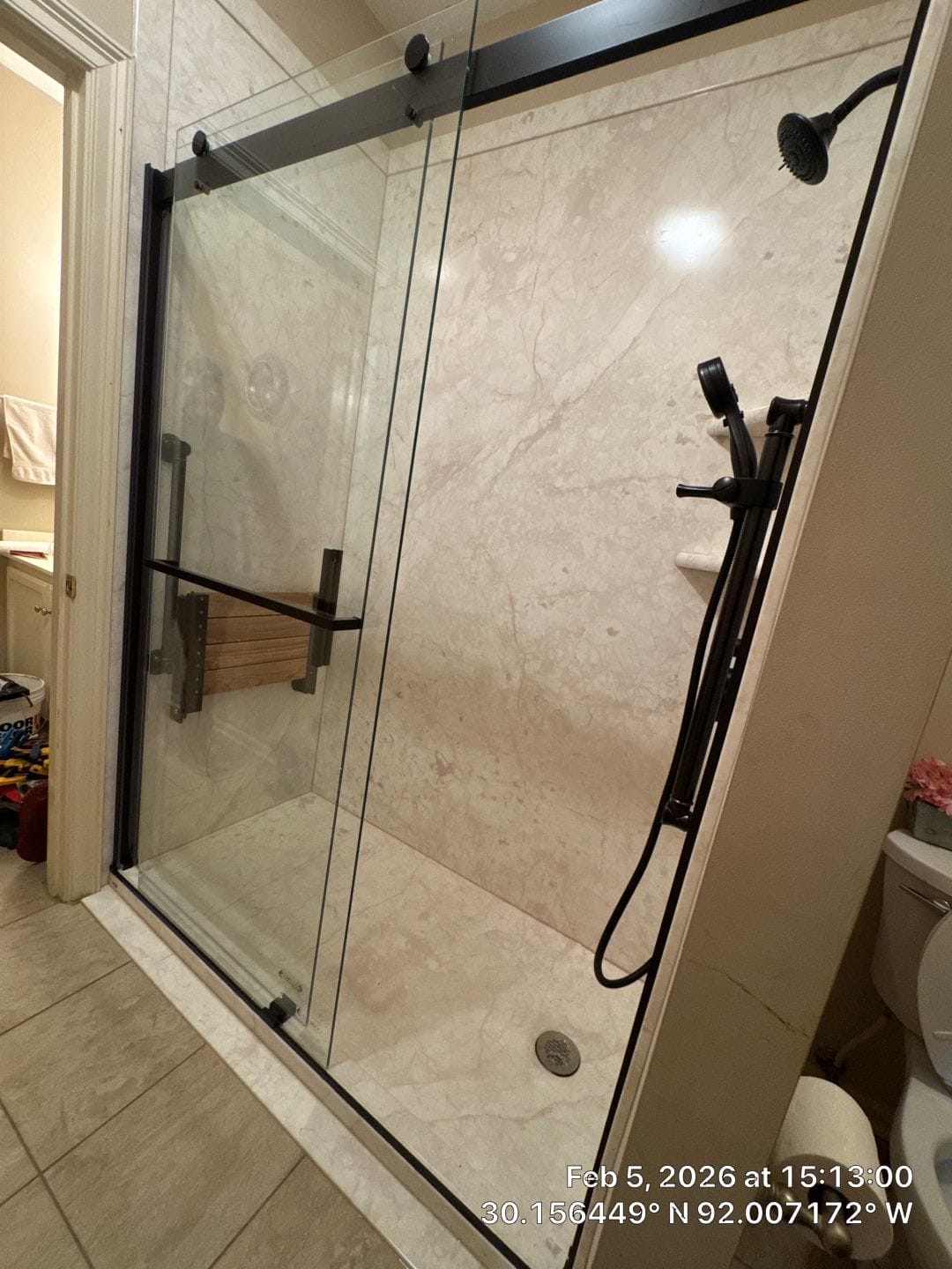 The Five Star Bath Solutions Representative presented a grout-free composite wall system designed to replicate natural stone while remaining easy to maintain. The selected design features light marble-pattern wall panels paired with matte black fixtures and hardware for a modern contrast. A sliding glass enclosure with exposed matte black rail hardware replaced the traditional curtain setup, creating a streamlined appearance and improved water containment. Interior storage solutions were incorporated through built-in corner shelving, while a handheld shower system with adjustable slide bar provides flexible daily use.