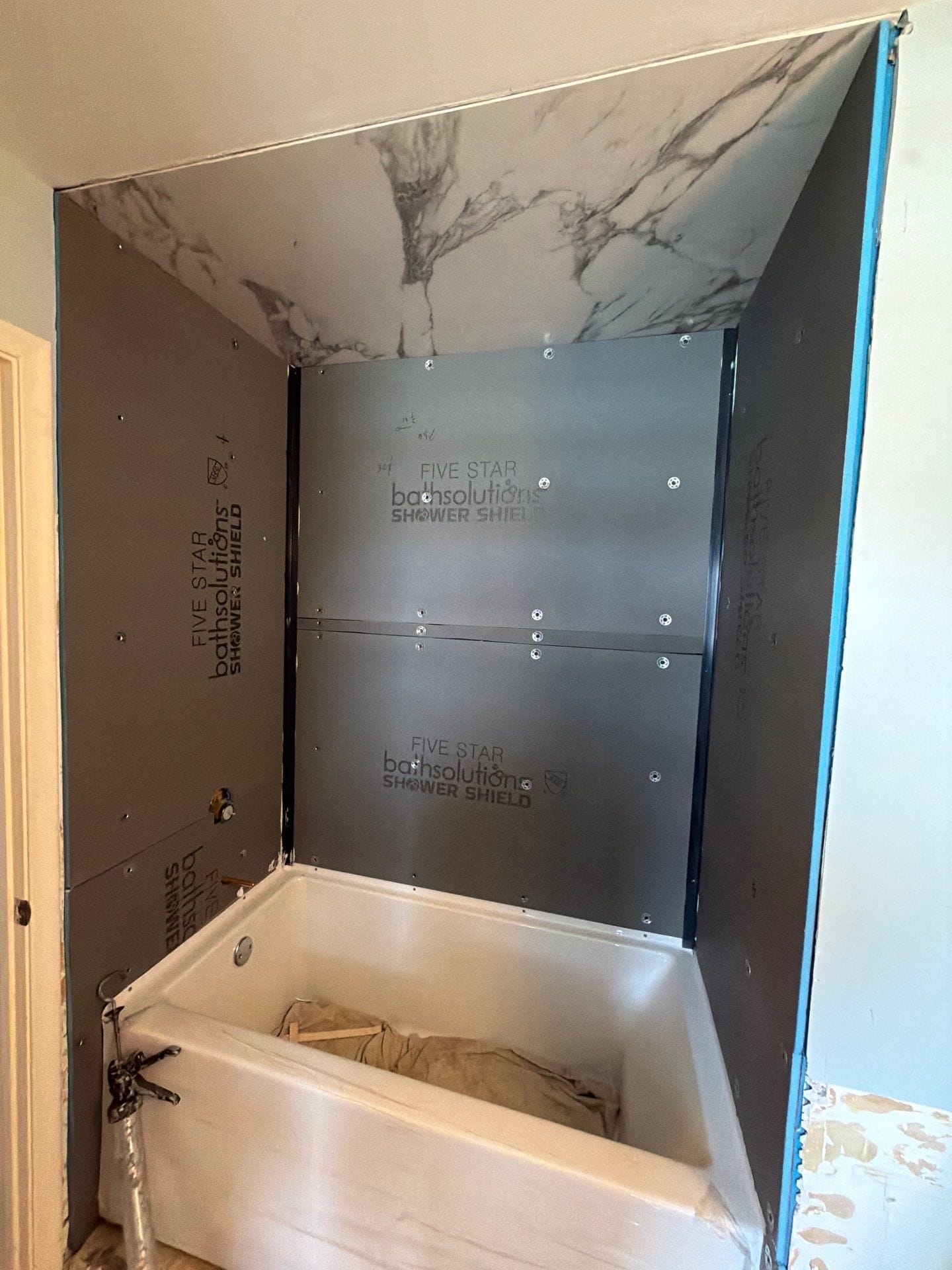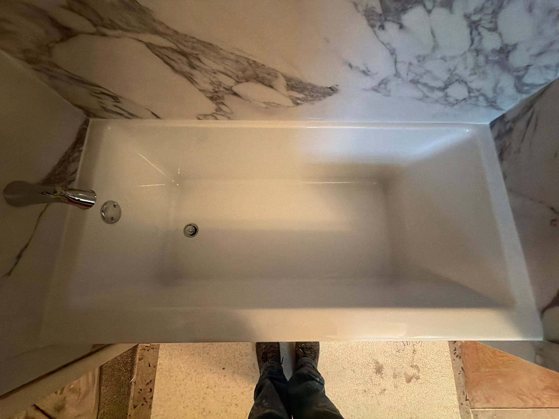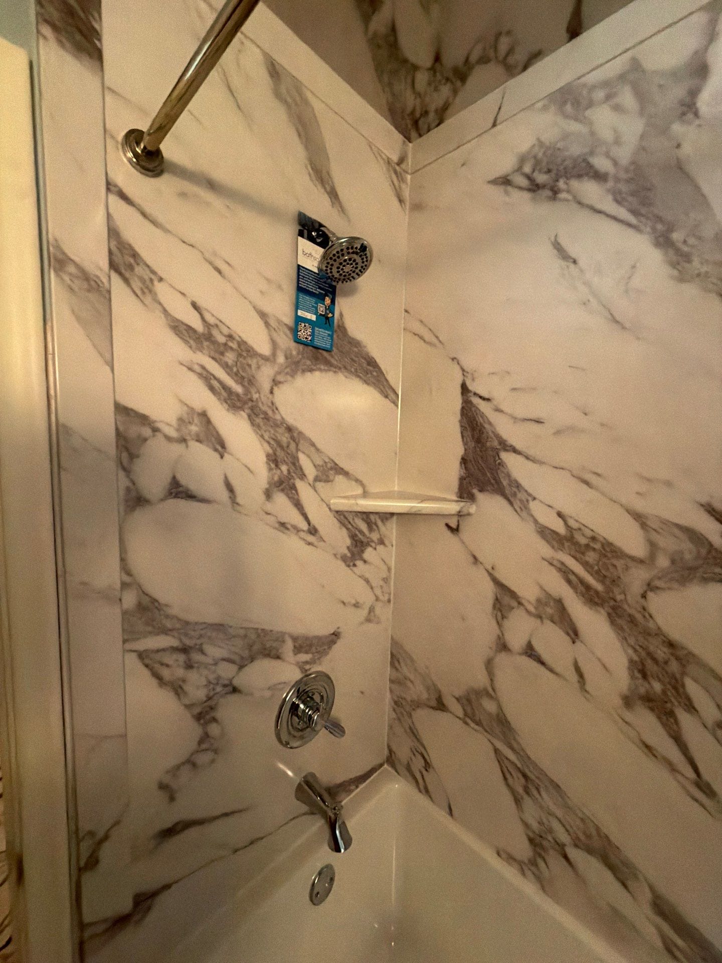 The Five Star Bath Solutions Representative presented a grout-free wall system designed to create a clean, updated look while reducing long-term maintenance. The completed bathing area features marble-pattern composite wall panels paired with polished chrome fixtures and a standard bathtub configuration. The large wall panels provide a seamless appearance compared to the previous tiled surround. Integrated corner shelving offers convenient storage within the bathing space while maintaining the streamlined design.