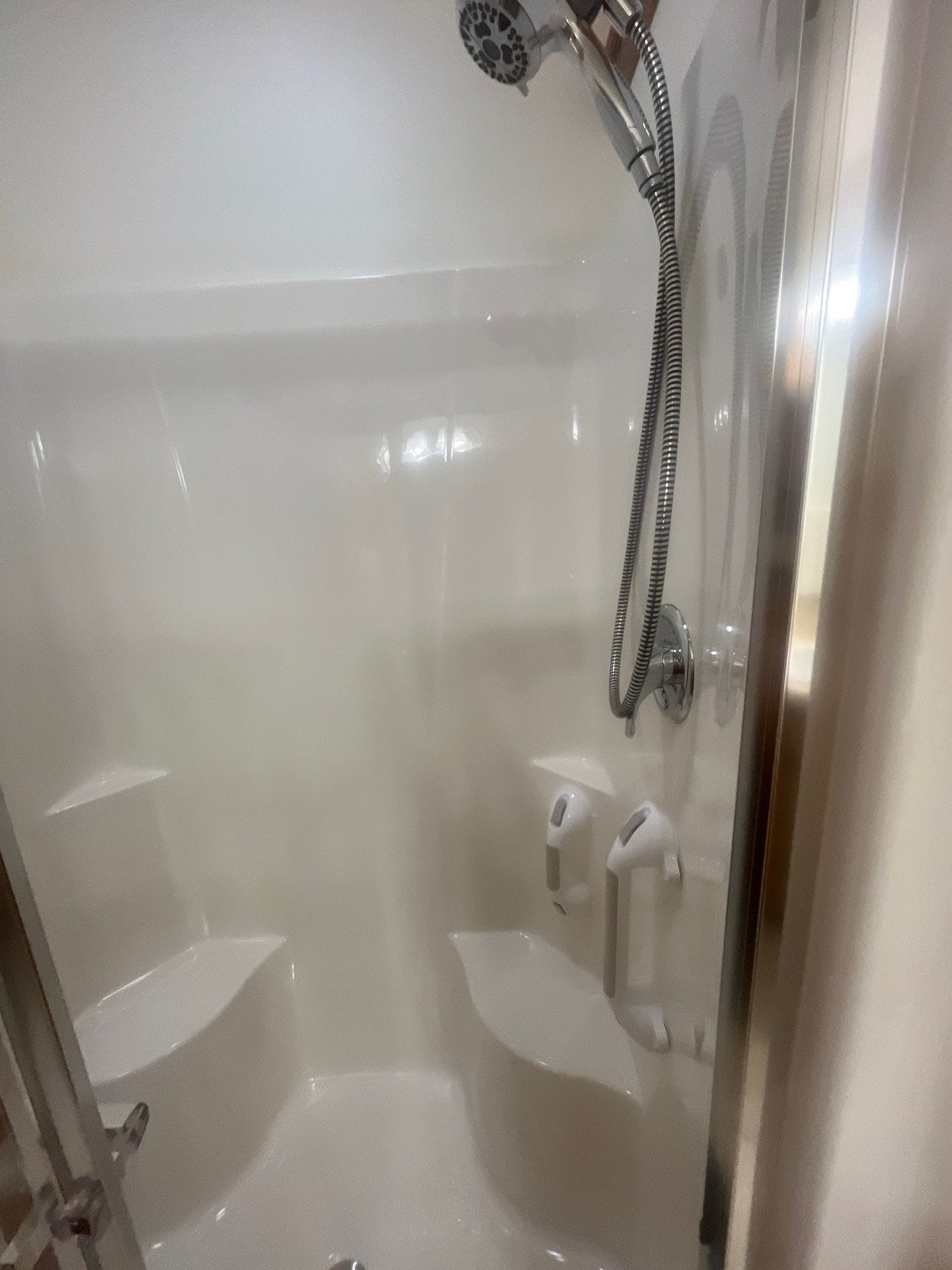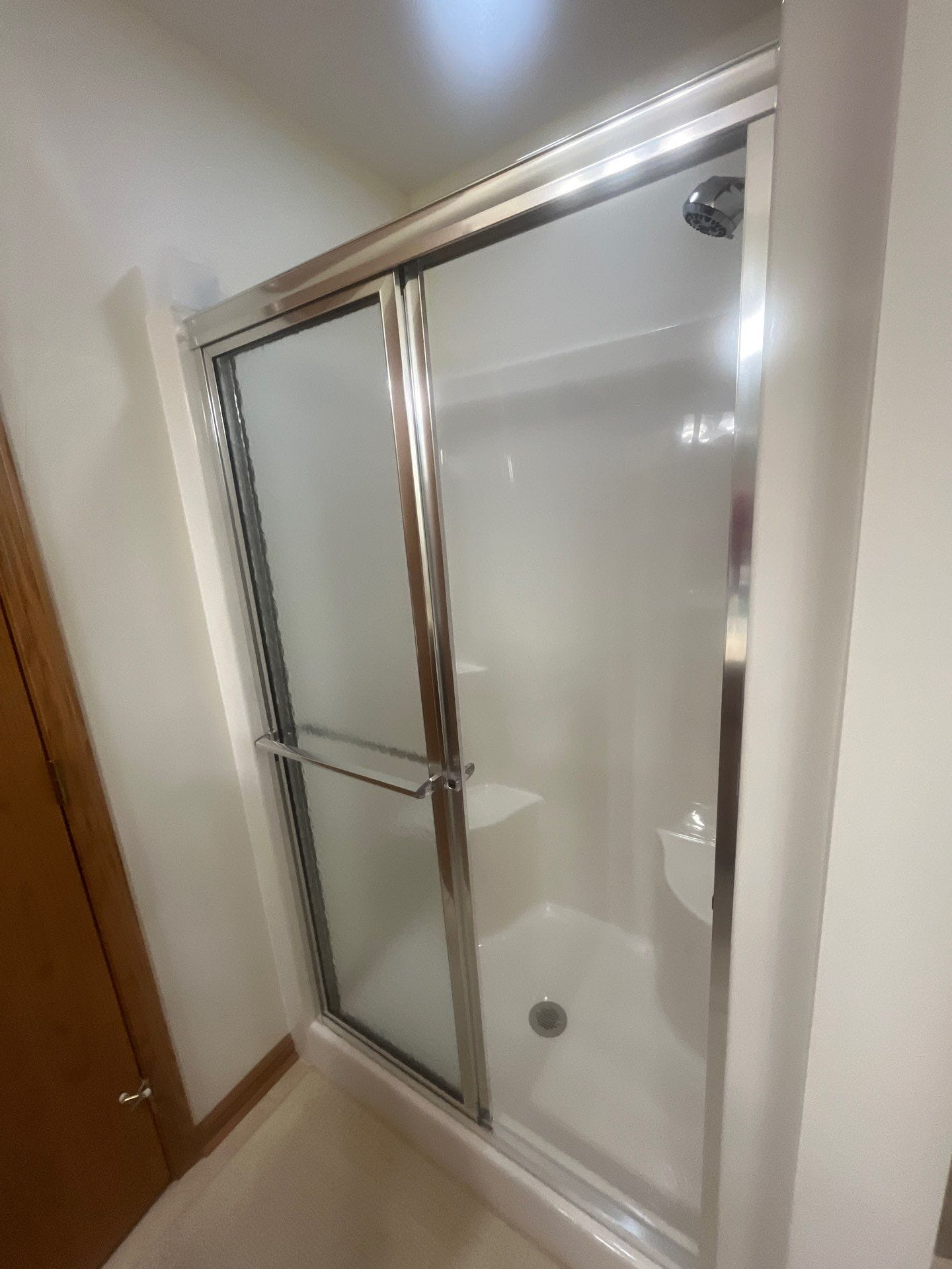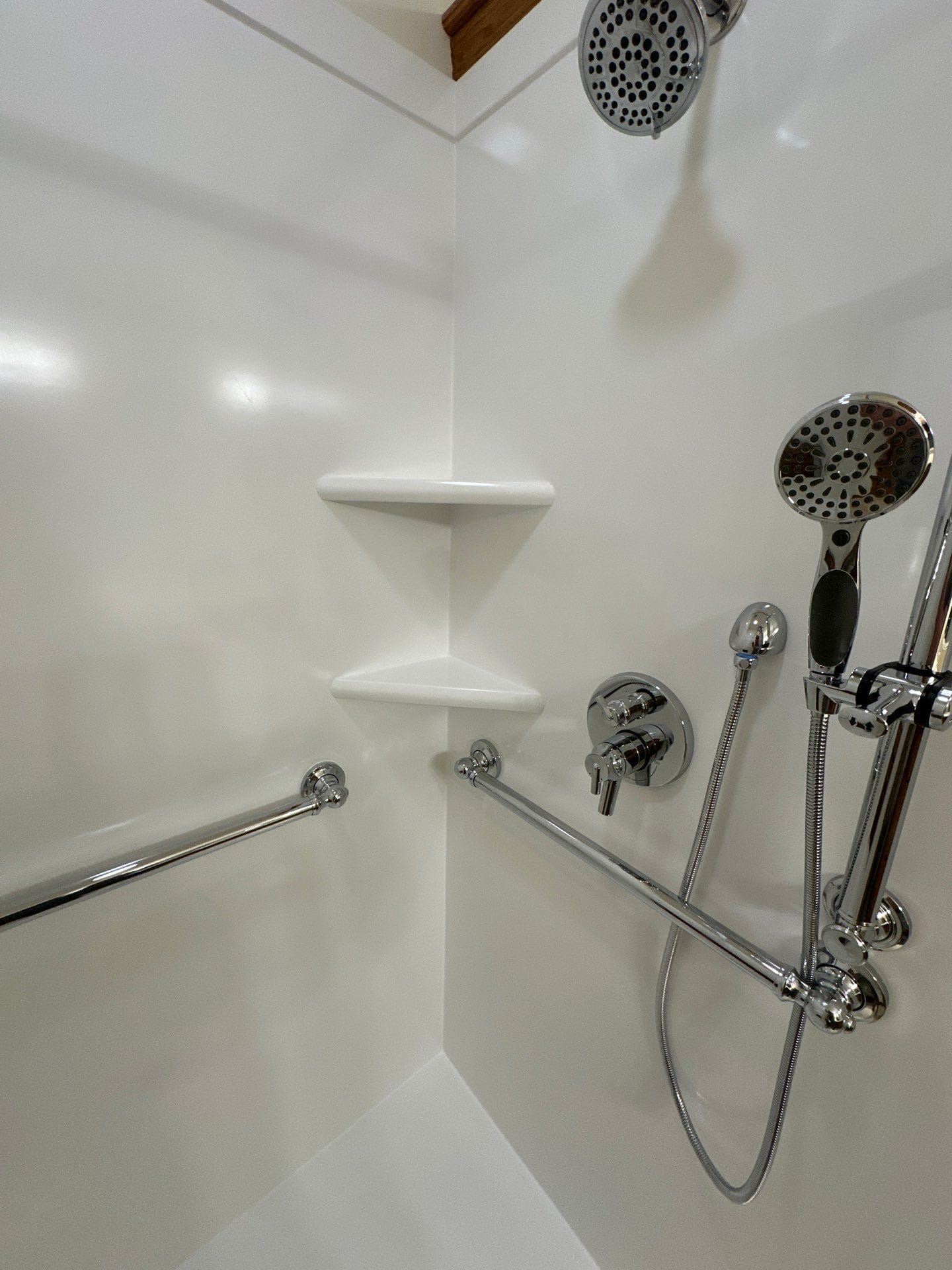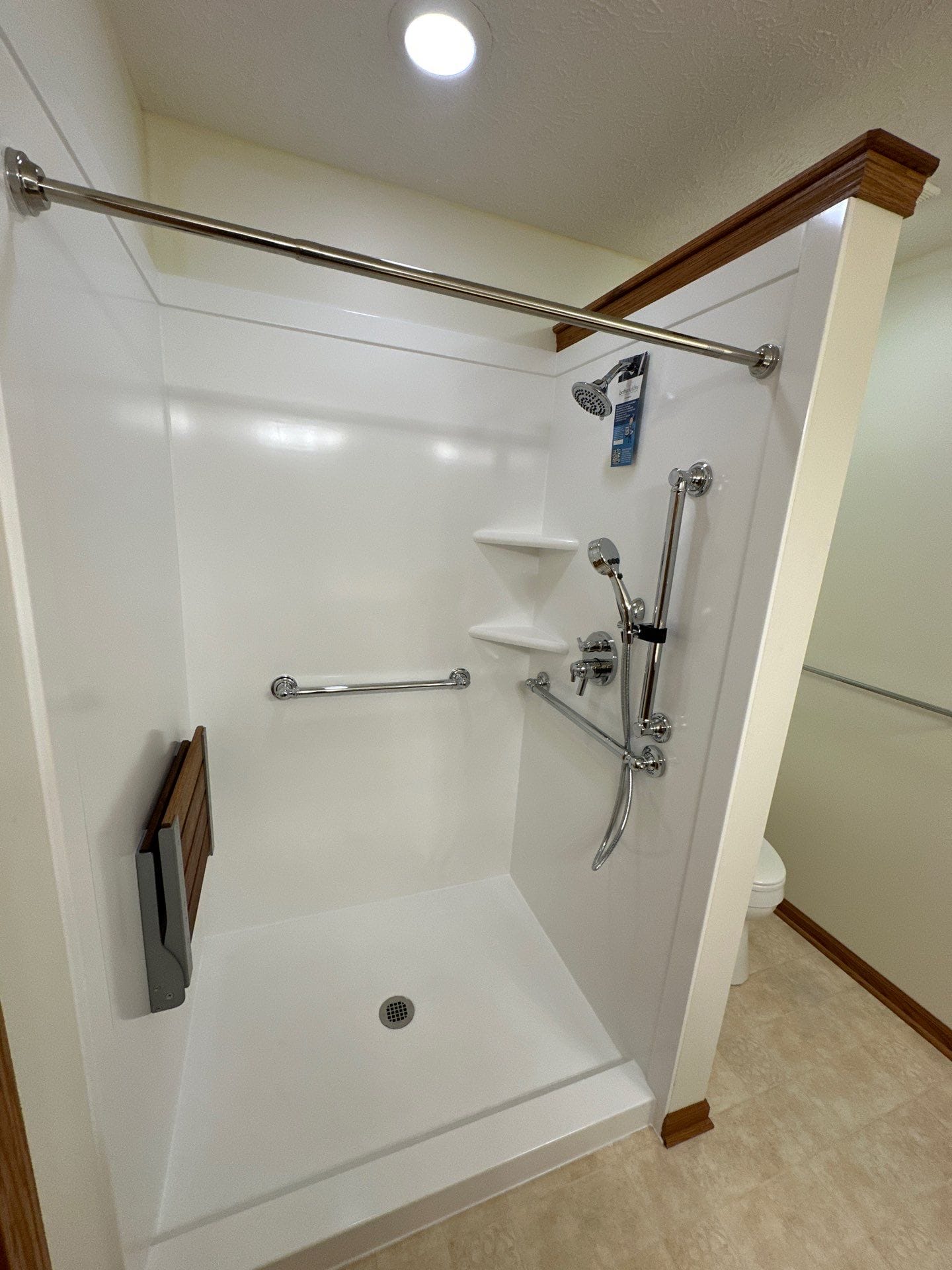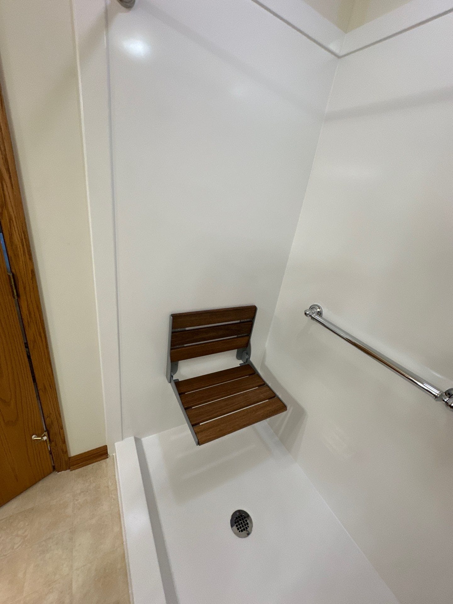 Installation included full removal of the existing shower enclosure, down to the studs and subfloor. The new system introduced a solid surface backer board for full waterproofing and a custom-fit low-threshold shower pan to allow easier access. Structural backing was added behind the walls to support the fold-down bench and grab bar. Plumbing updates were completed in line with current code, and the space was sealed using antimicrobial silicone. Protective coverings were placed during the process to keep the rest of the bathroom undisturbed, with all work completed efficiently by certified installers.
