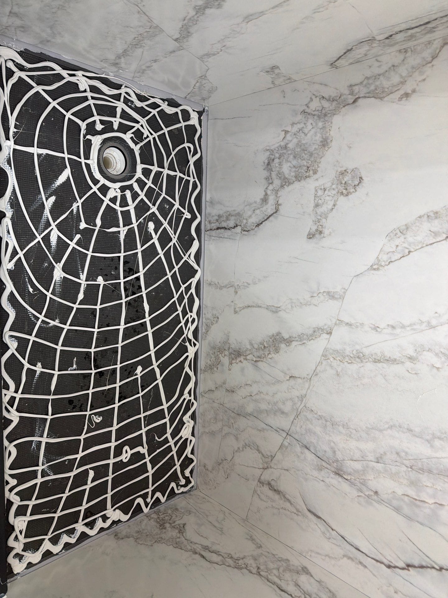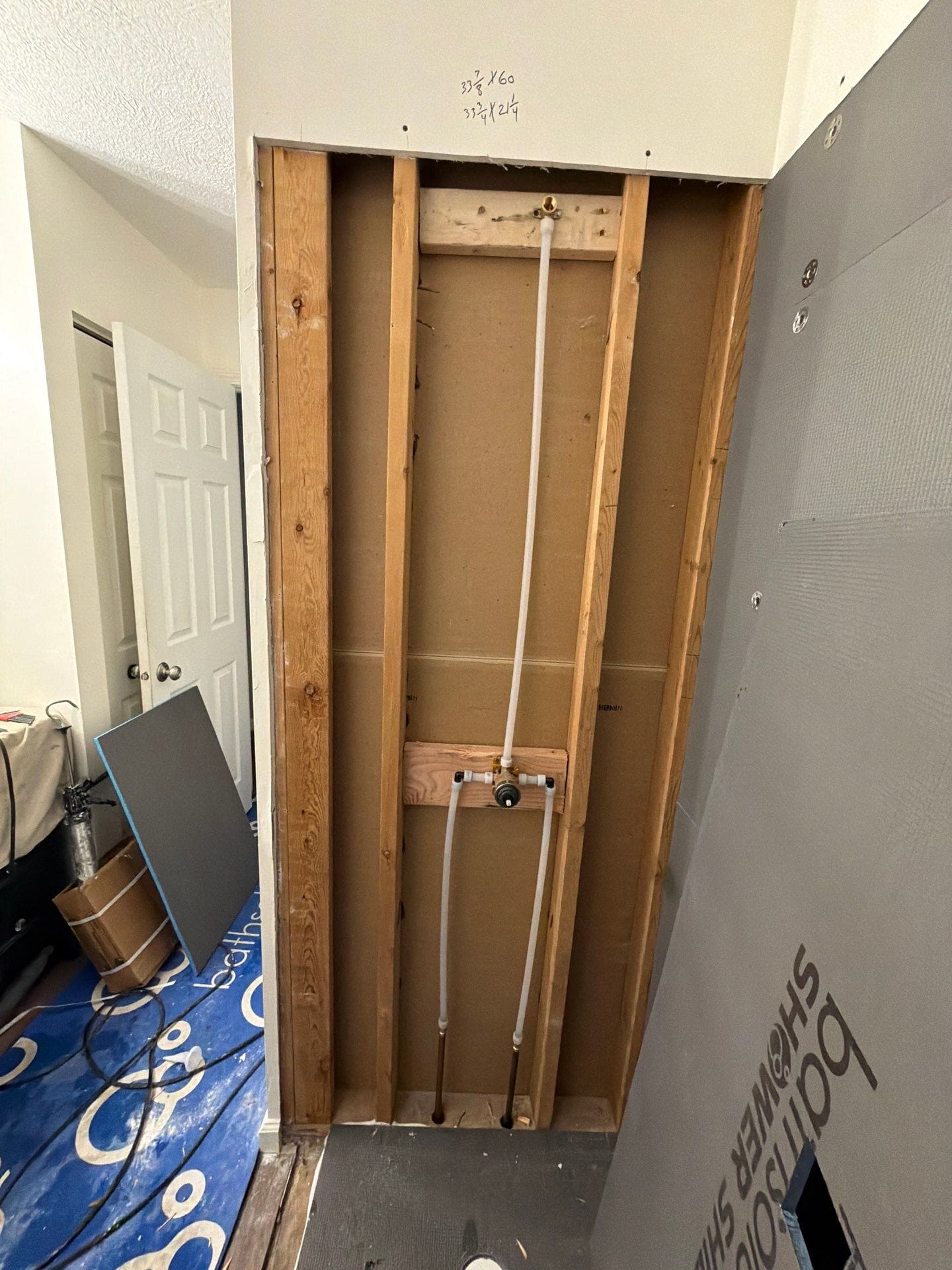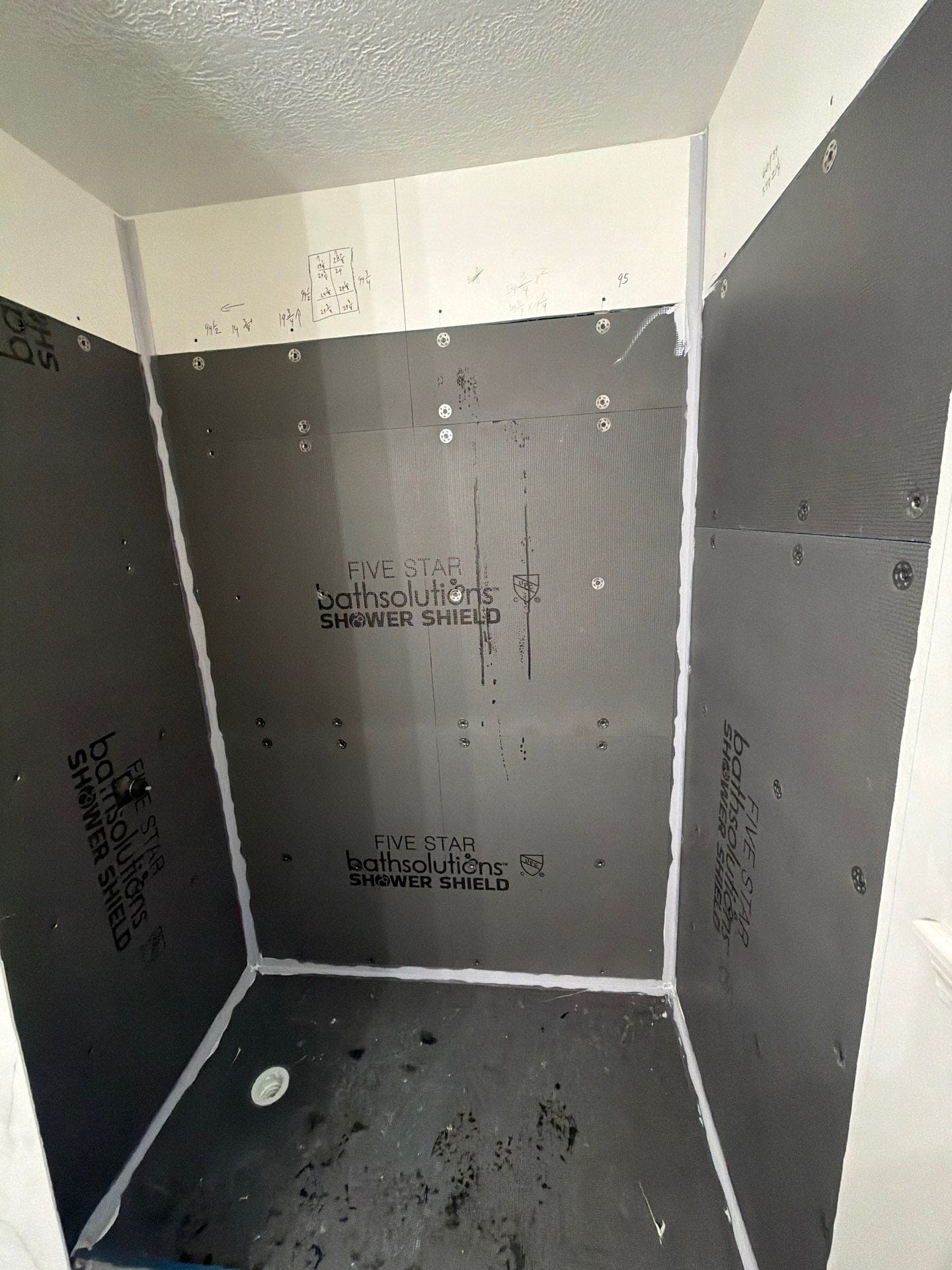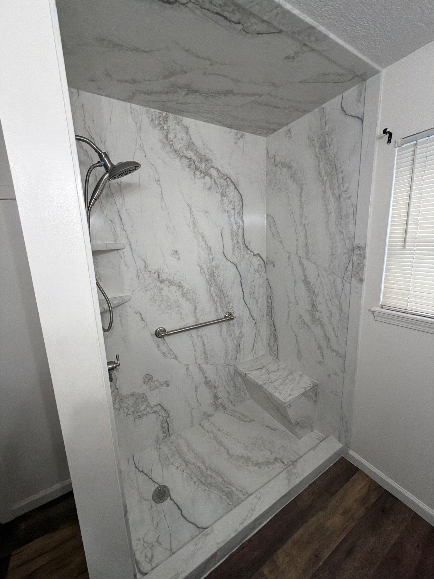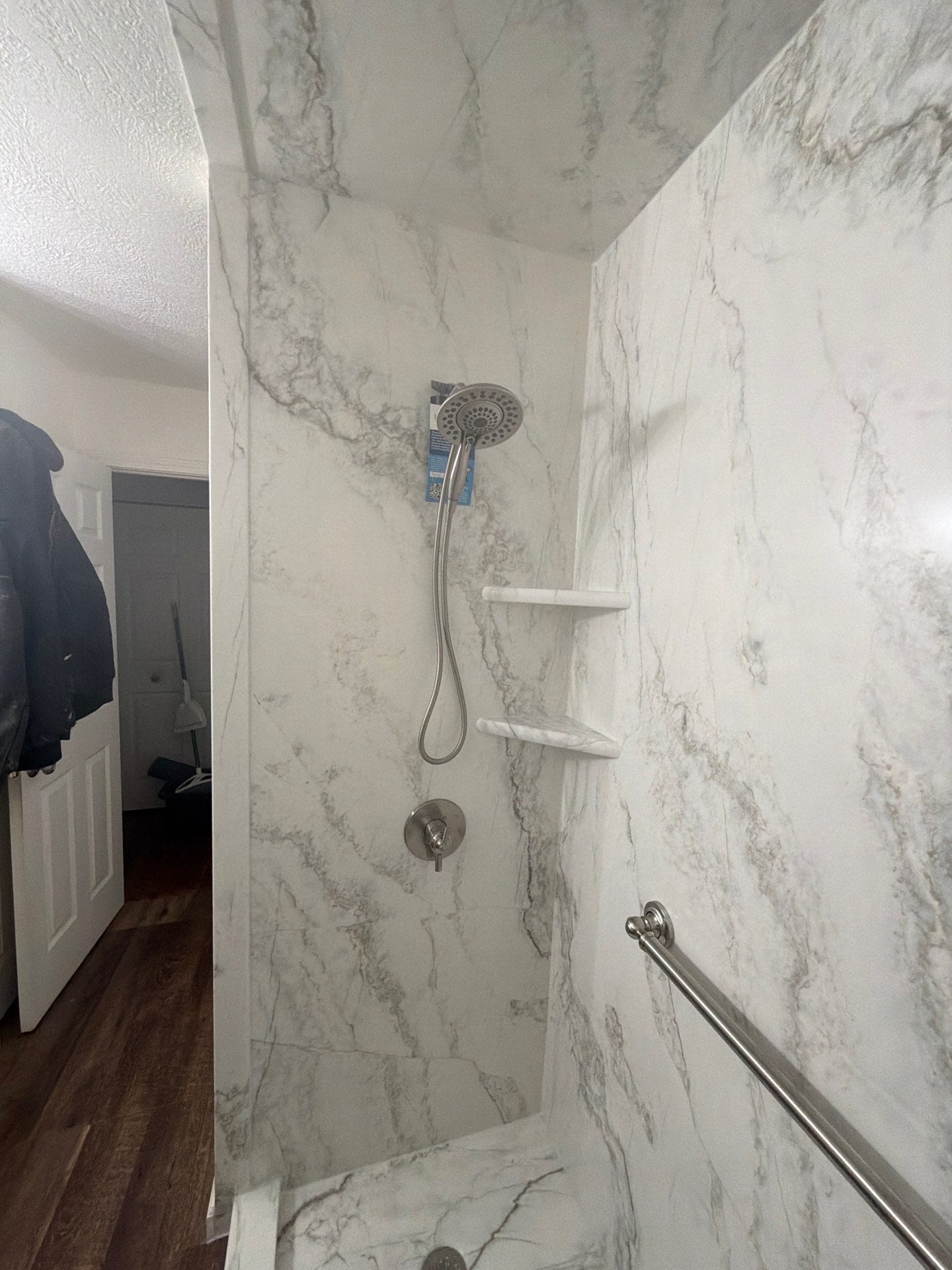Installation involved a complete demolition down to the studs to inspect for moisture damage and ensure a structurally sound foundation. The process included the installation of a waterproof backer system and a reinforced low-threshold base to provide a secure, leak-proof environment. Wall panels were custom-fitted to the ceiling and finished with matching trim for a seamless, polished appearance. The project was completed in a short timeframe, with a project manager overseeing the site protection, plumbing updates, and final hardware placement.