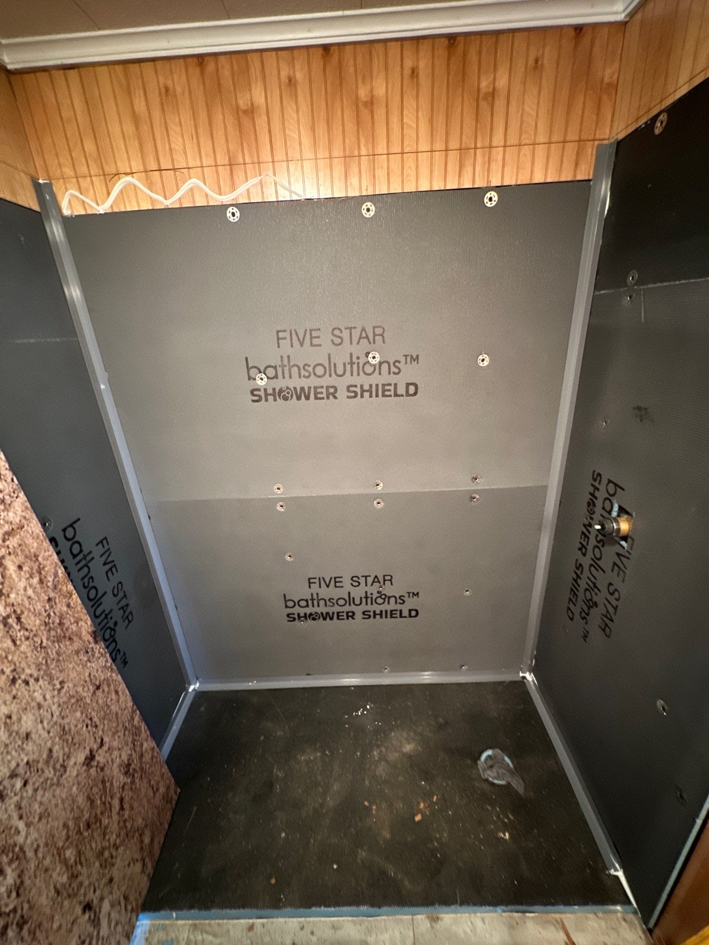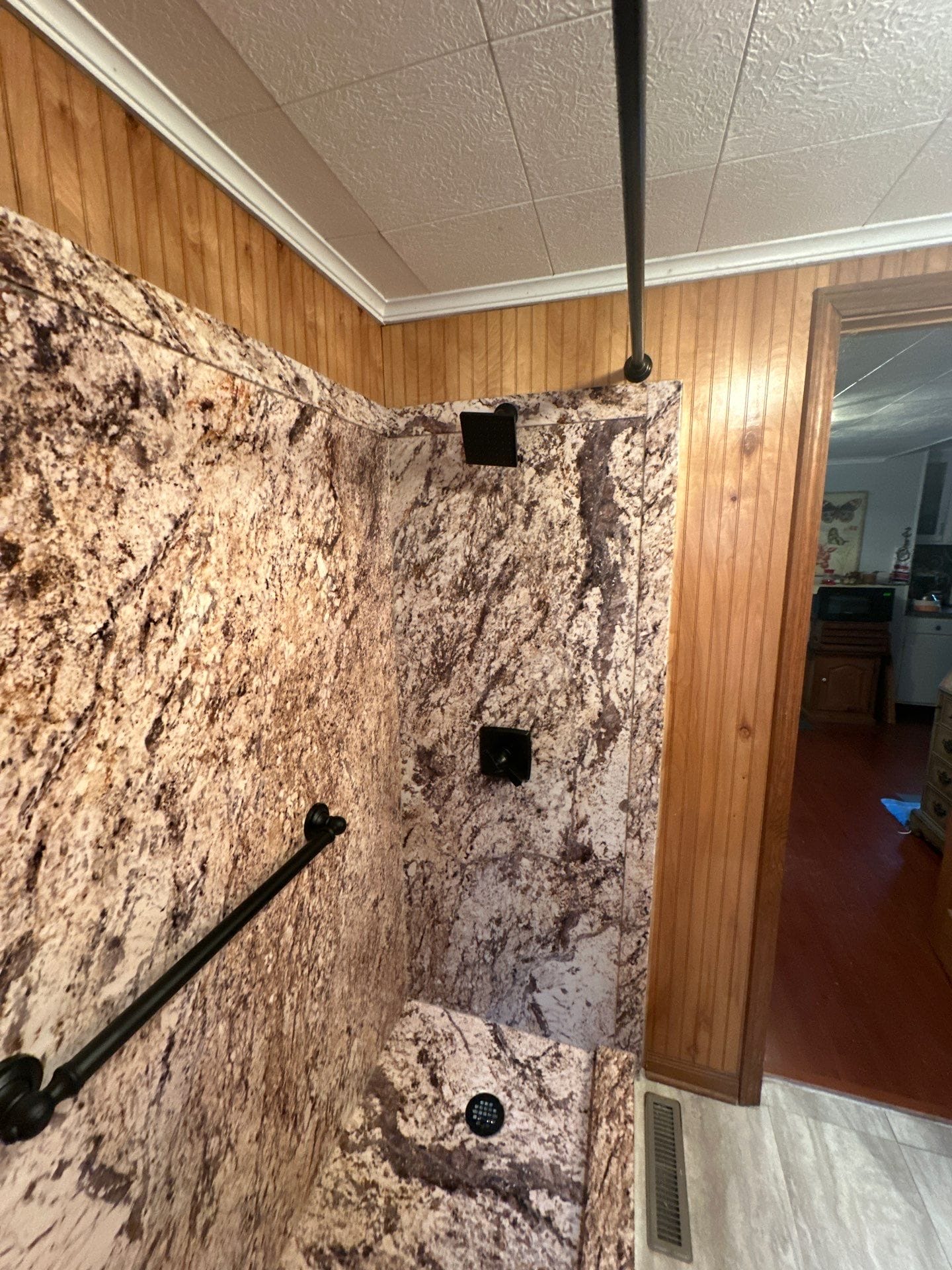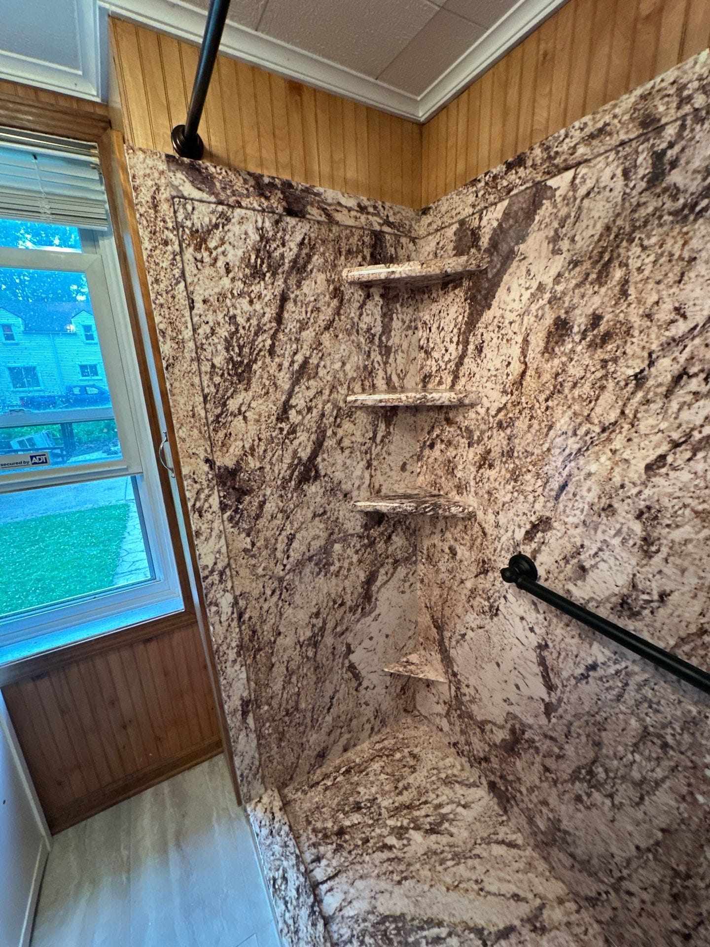 Installation involved a full tear-out of the existing tub and sliding doors, followed by plumbing updates and preparation of the base. The new wall panels, grab bar, shelving, and fixtures were installed in a one-day process. The bathroom retained its wood-paneled walls, while the floor was updated with light gray tile to contrast the stone-look shower.