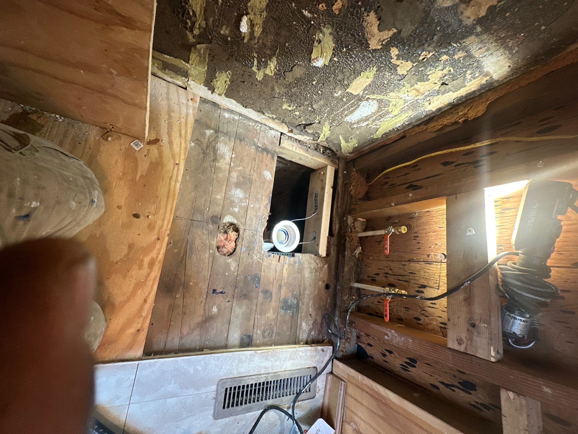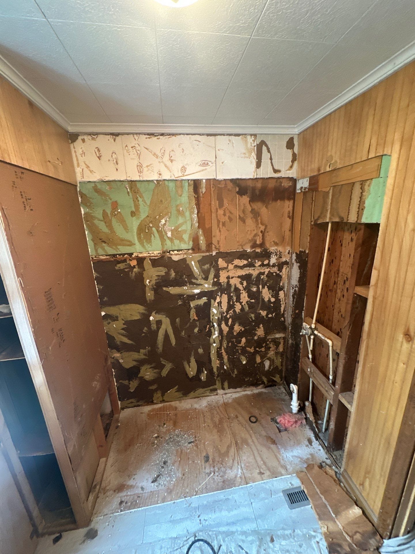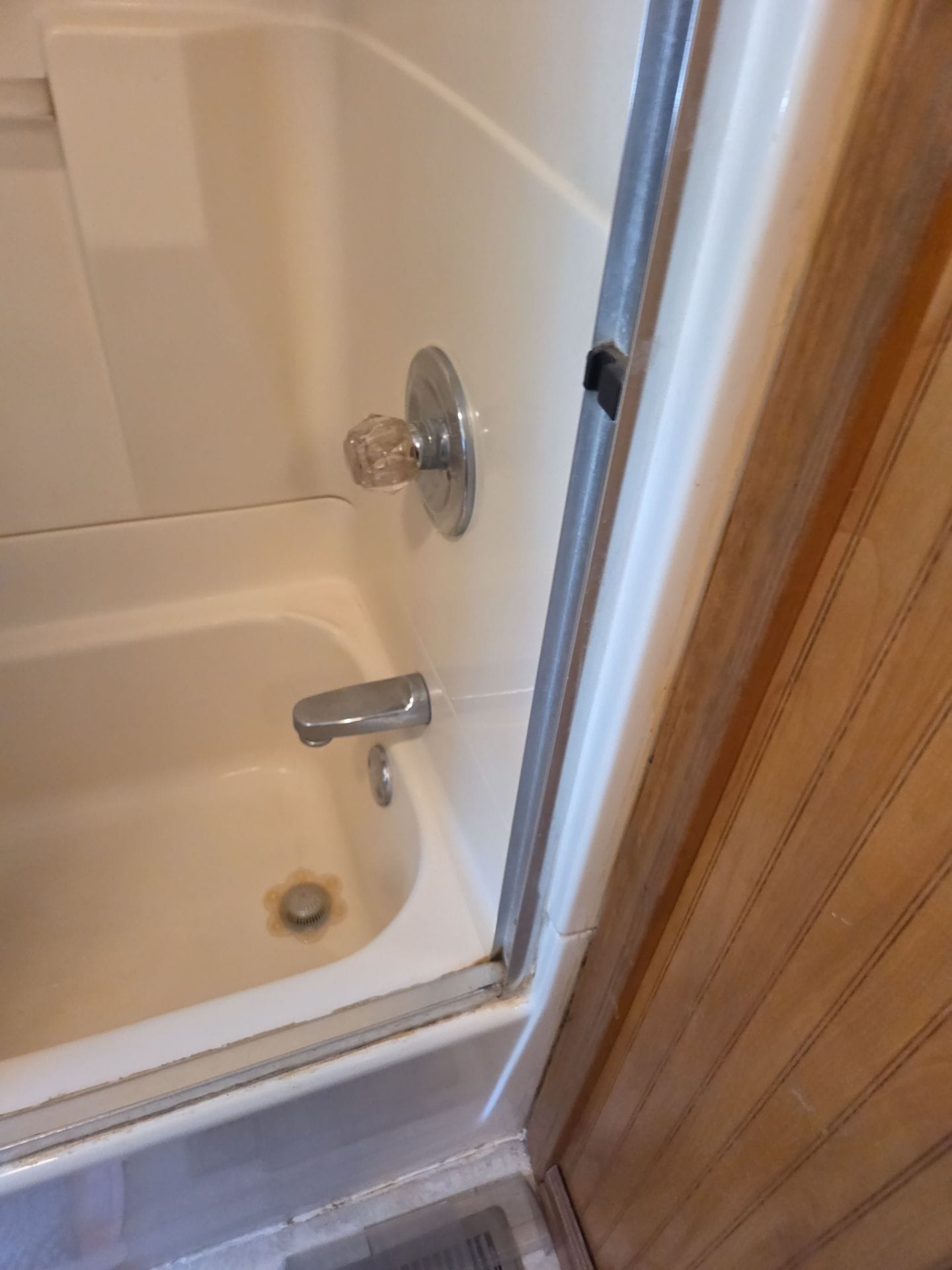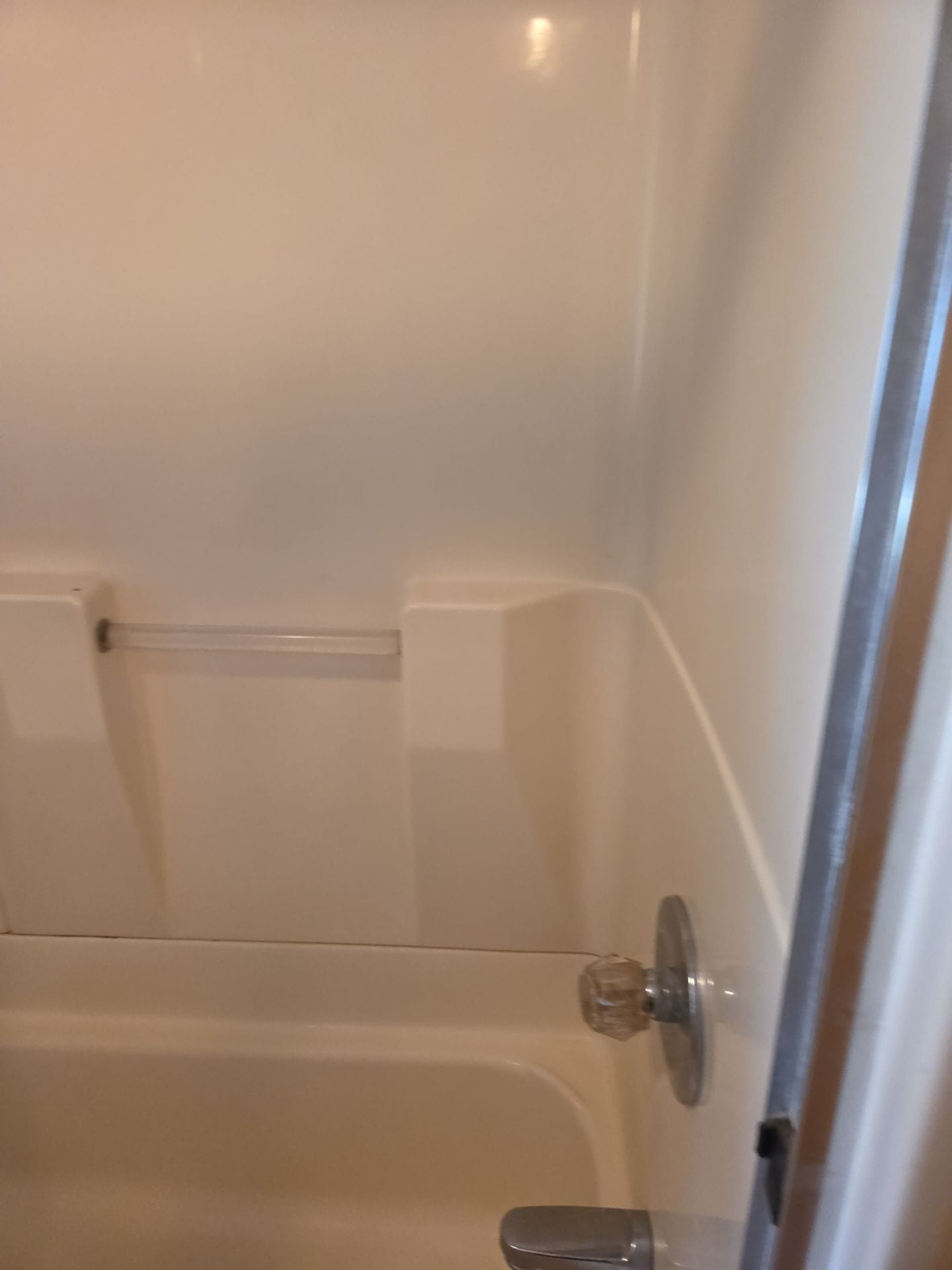 Installation involved a full tear-out of the existing tub and sliding doors, followed by plumbing updates and preparation of the base. The new wall panels, grab bar, shelving, and fixtures were installed in a one-day process. The bathroom retained its wood-paneled walls, while the floor was updated with light gray tile to contrast the stone-look shower.