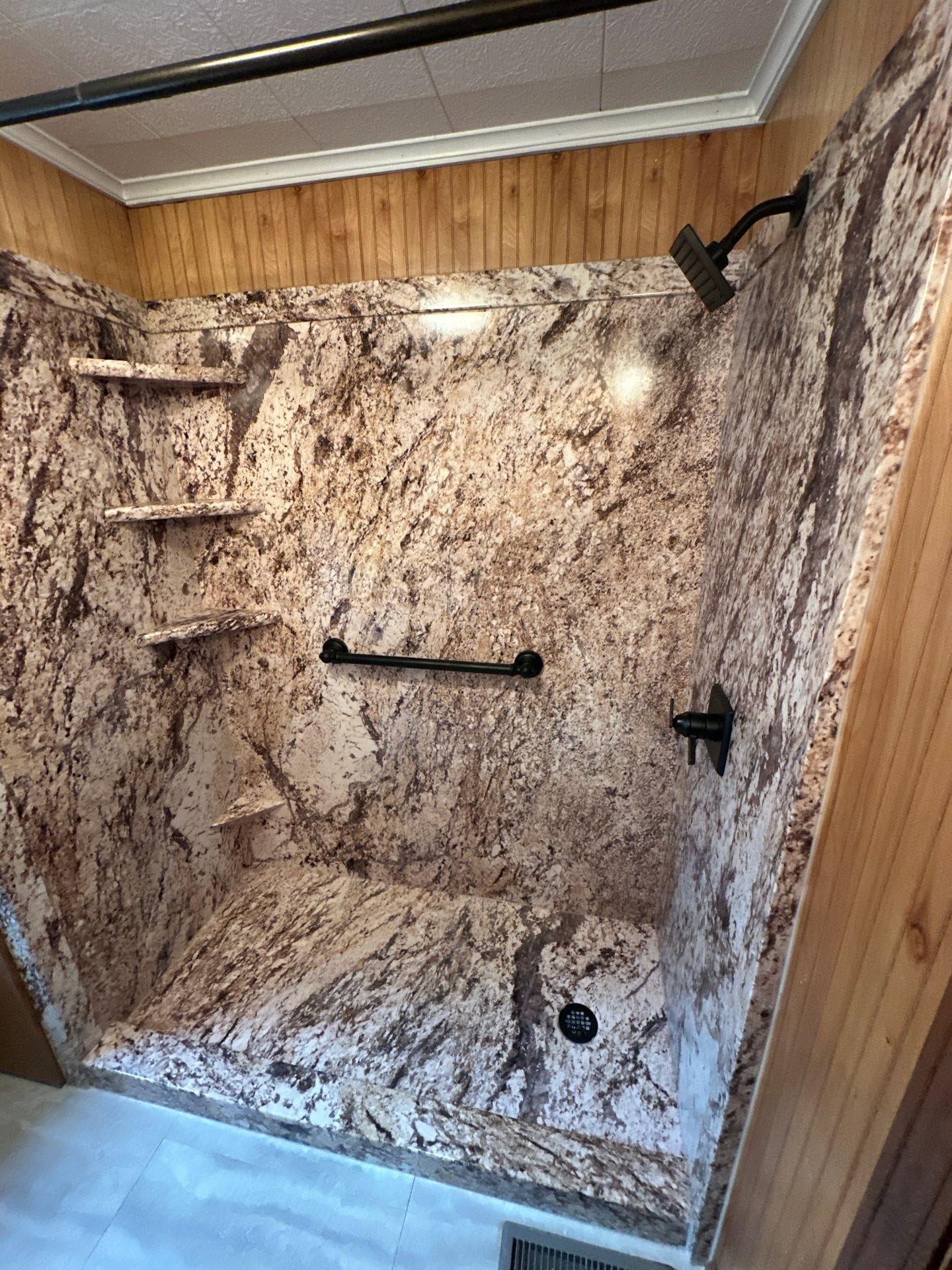 The selected finishes included full-height stone-style composite wall panels in a brown and cream granite design. The shower was fitted with matte black fixtures, a modern square showerhead, and matching grab bar hardware. Built-in corner shelving was installed on the side wall for storage, and the low-threshold base ensured ease of entry.