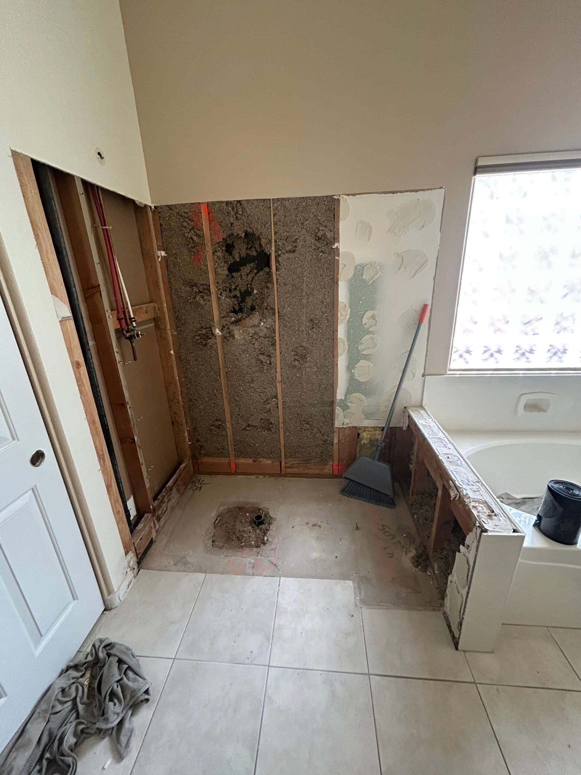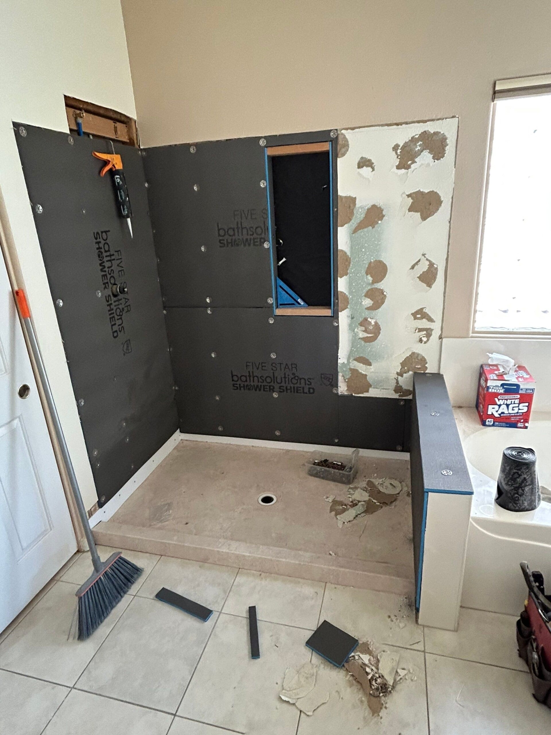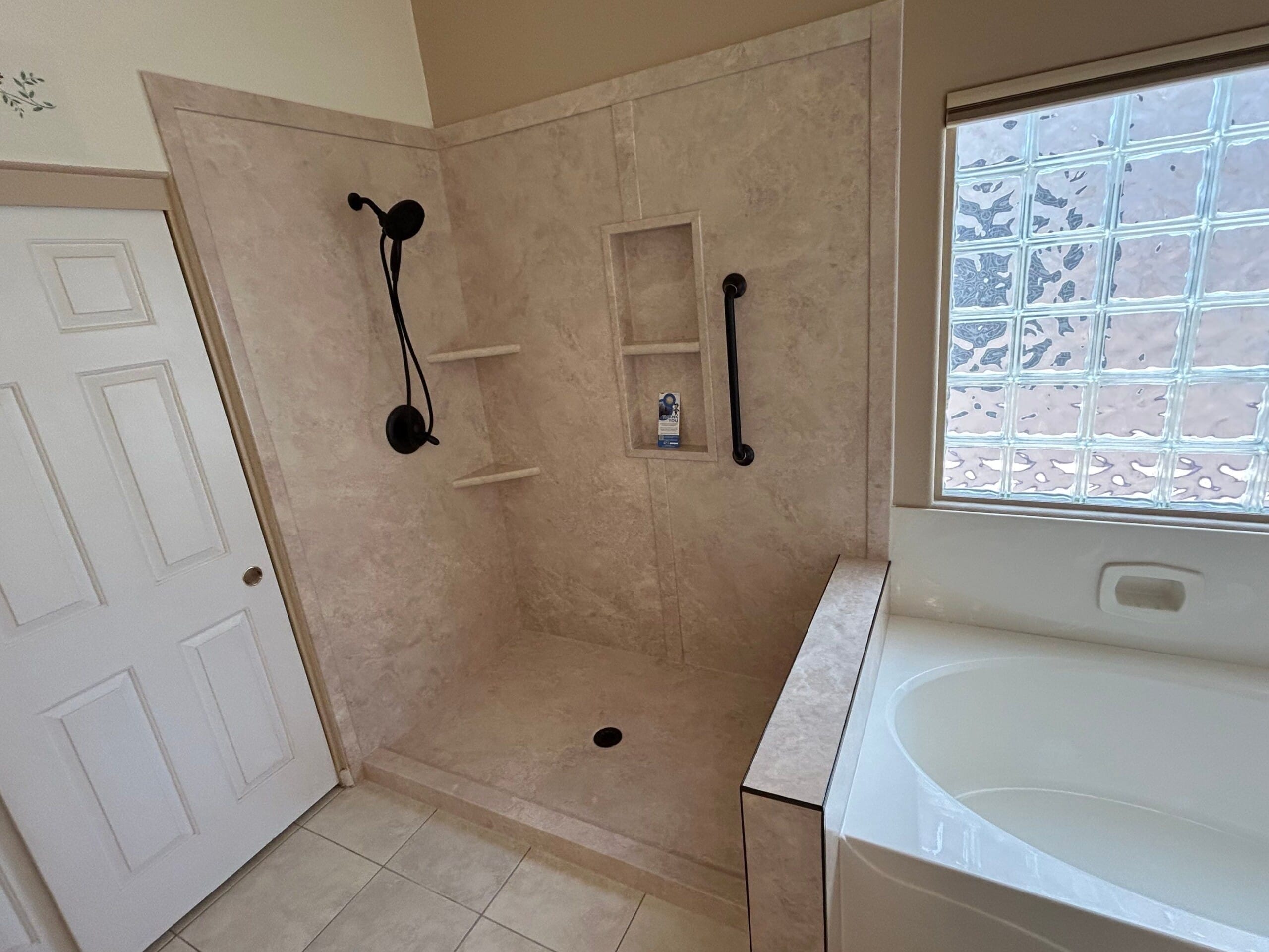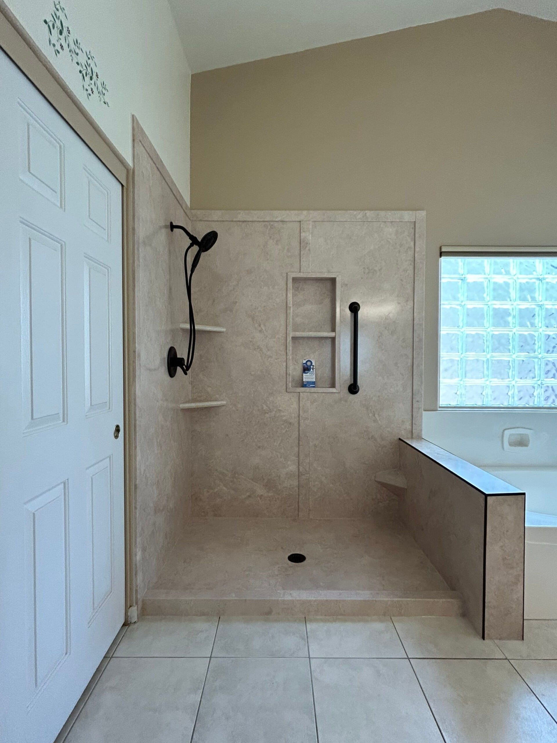 Installation included removal of the original shower enclosure and preparation of the surrounding structure for the new waterproof system. The shower area was rebuilt using waterproof backer board and custom-fit composite wall panels installed from base to upper wall height to create a sealed, durable enclosure. A new low-profile shower base was installed to provide easier entry and improve accessibility. Plumbing fixtures, shelving, and safety accessories were installed before all seams and joints were sealed to complete the system and ensure long-term moisture protection.
