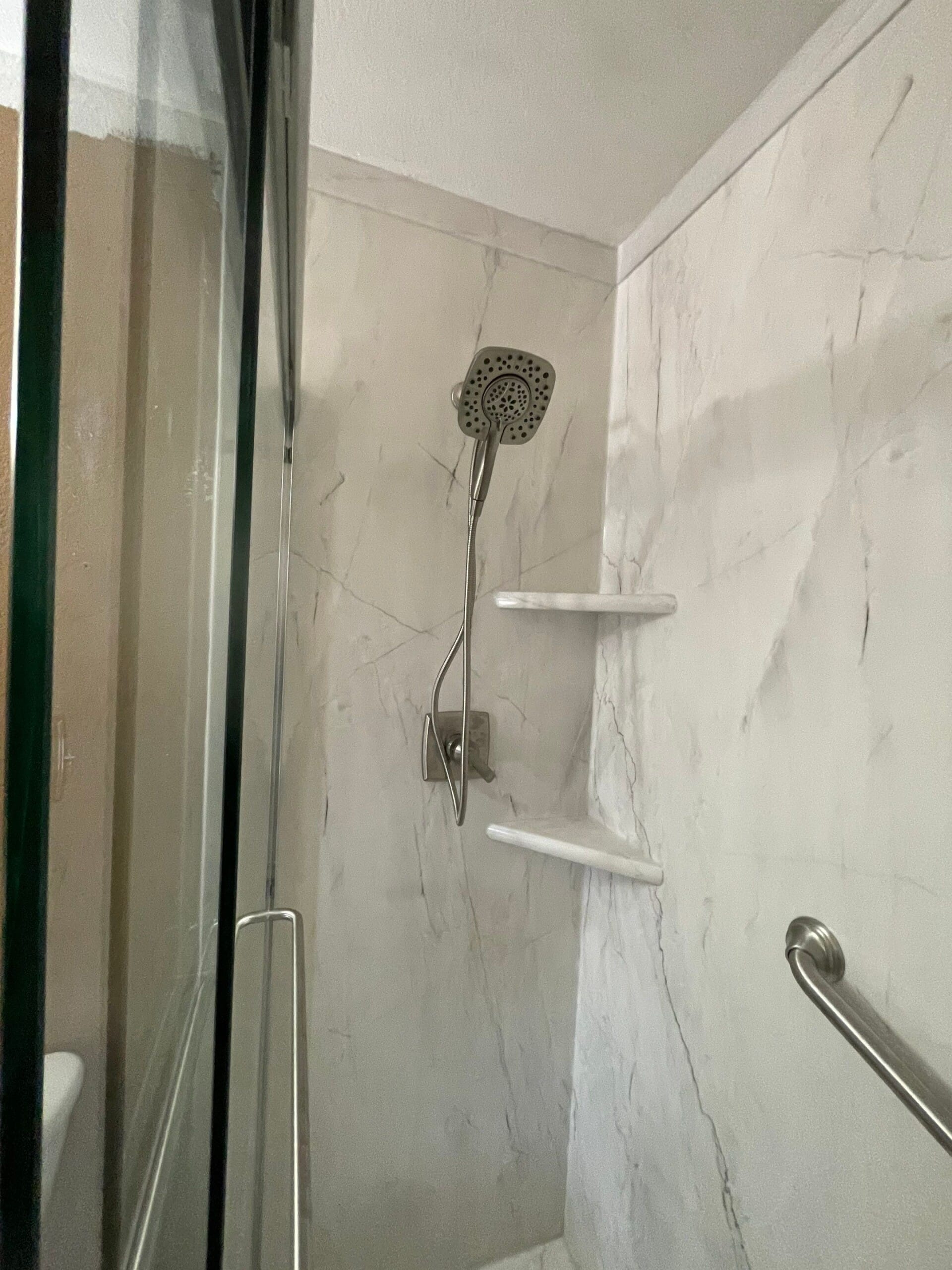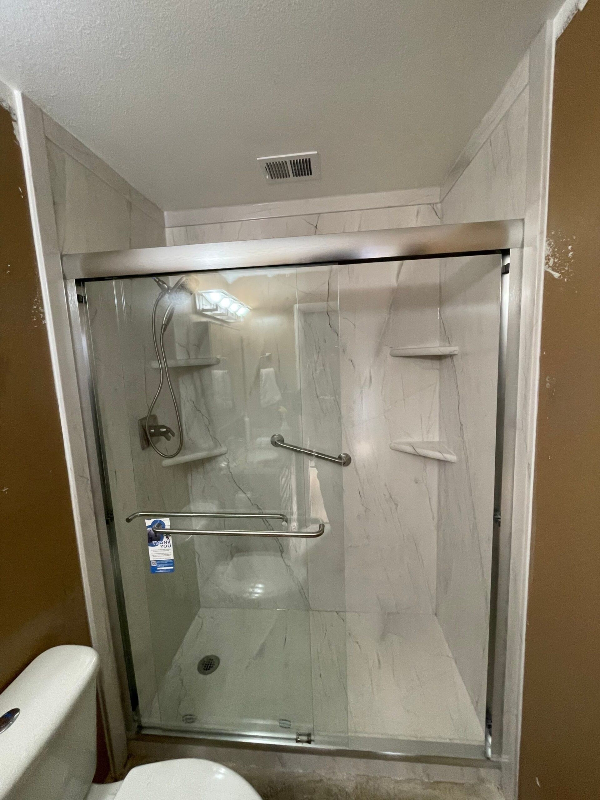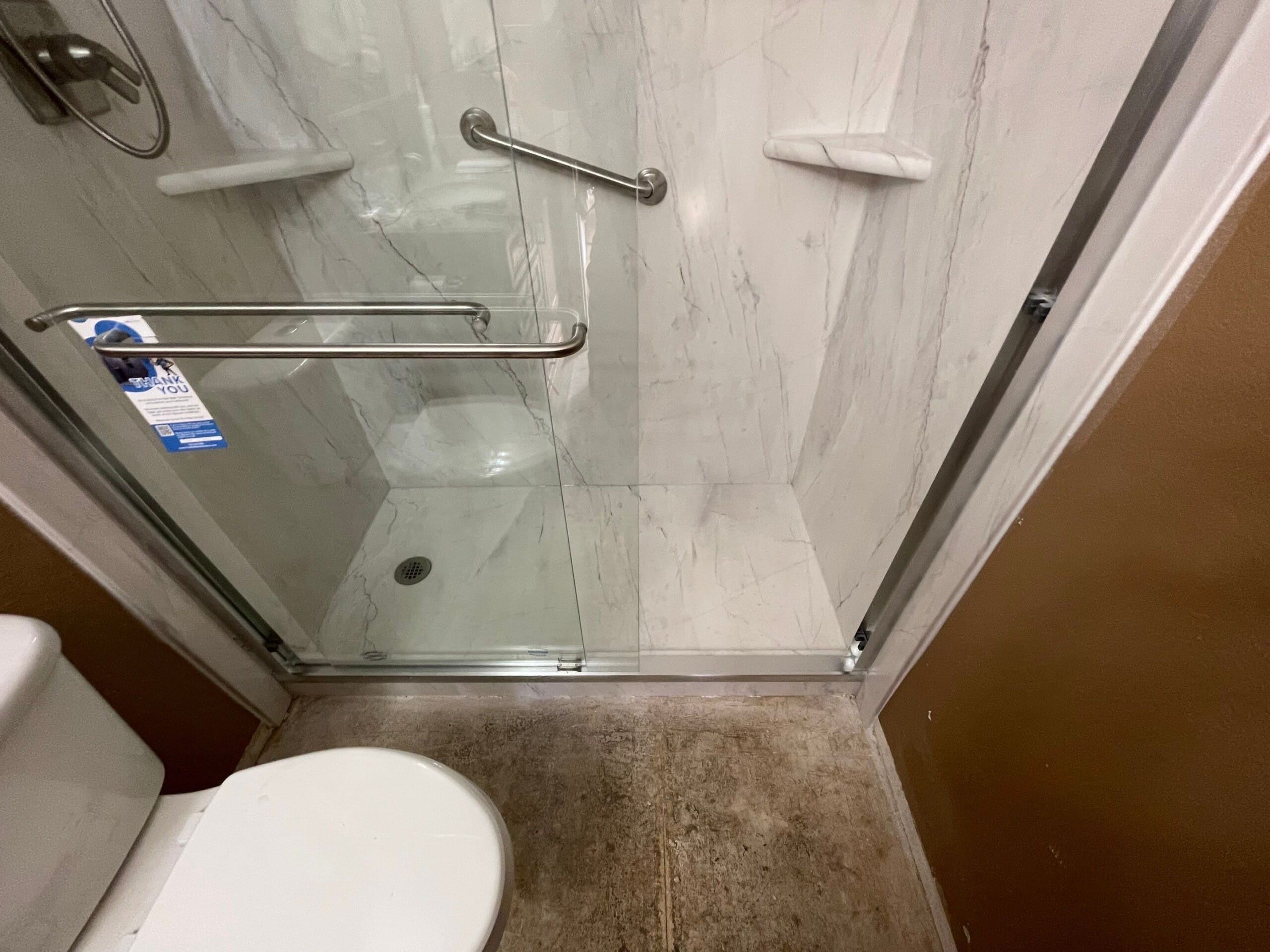 * Walk-in shower conversion with low-threshold, slip-resistant base