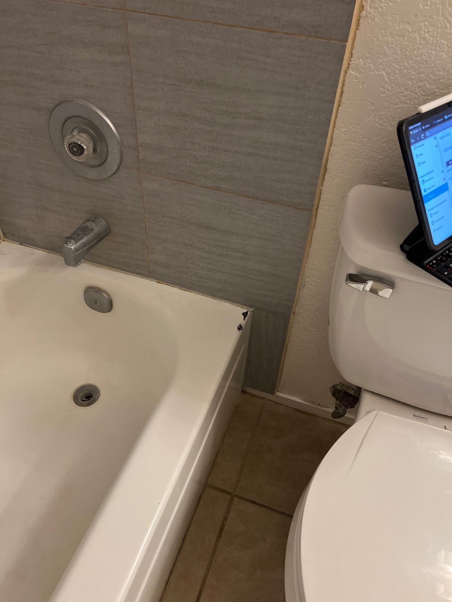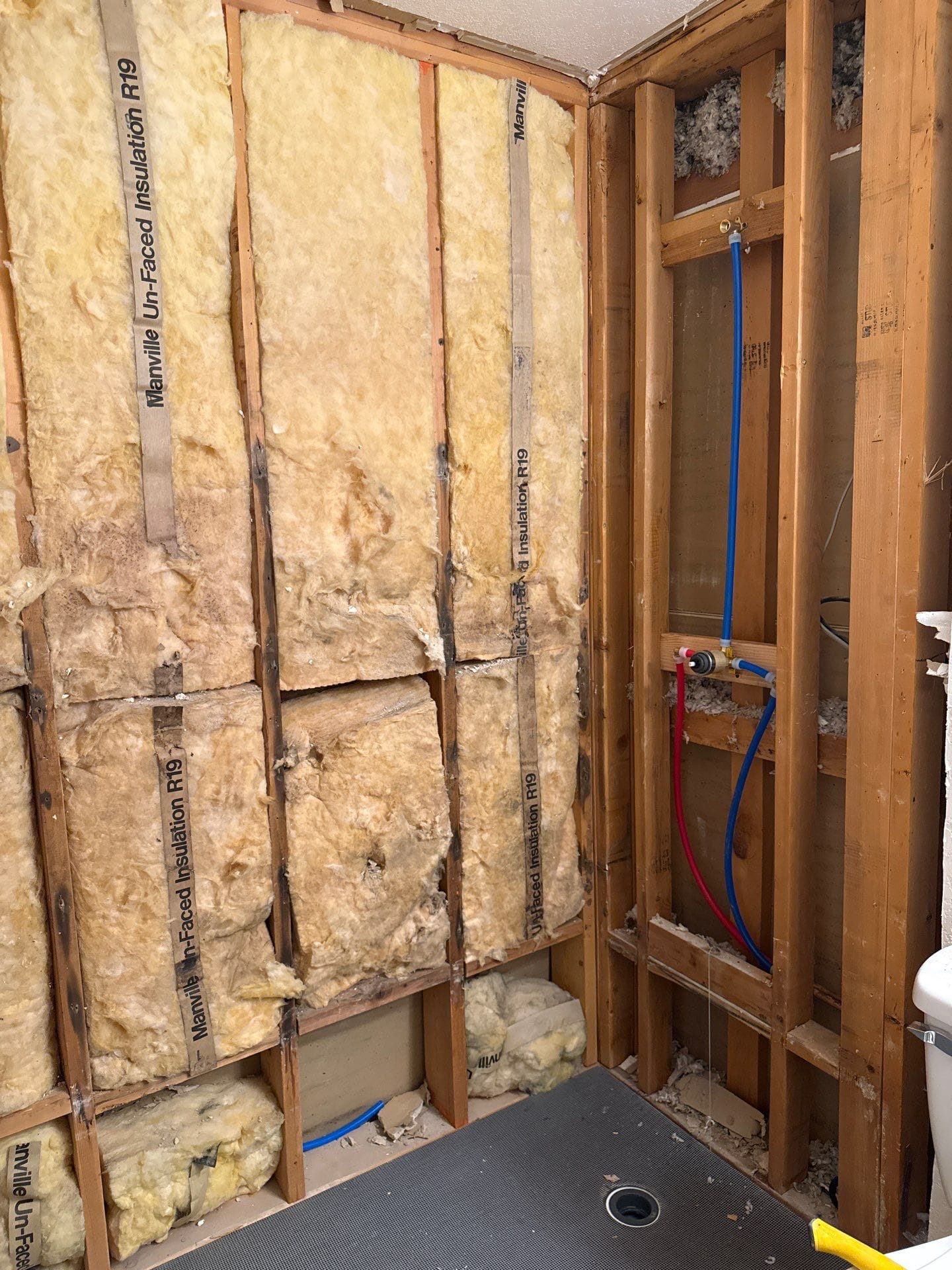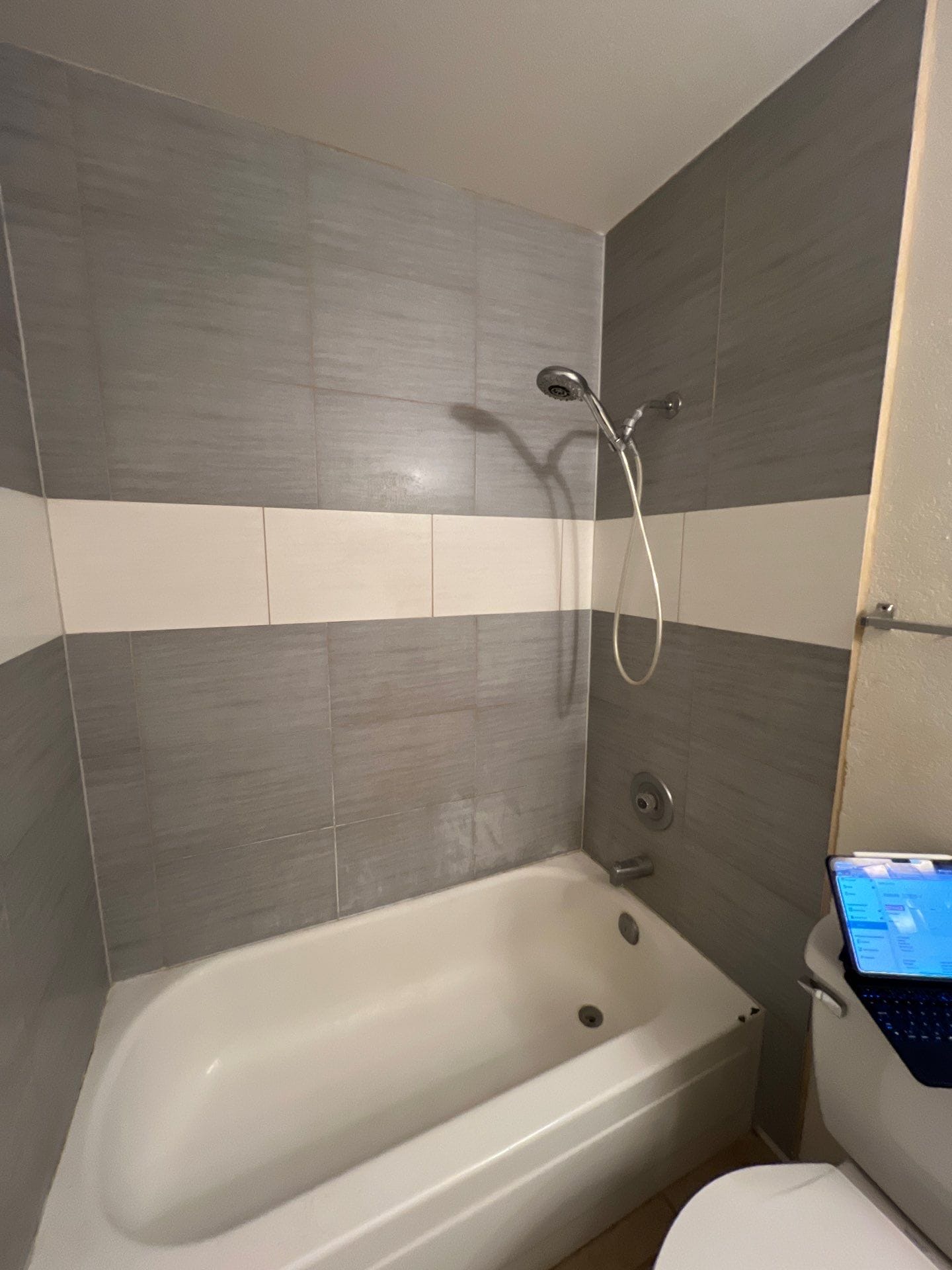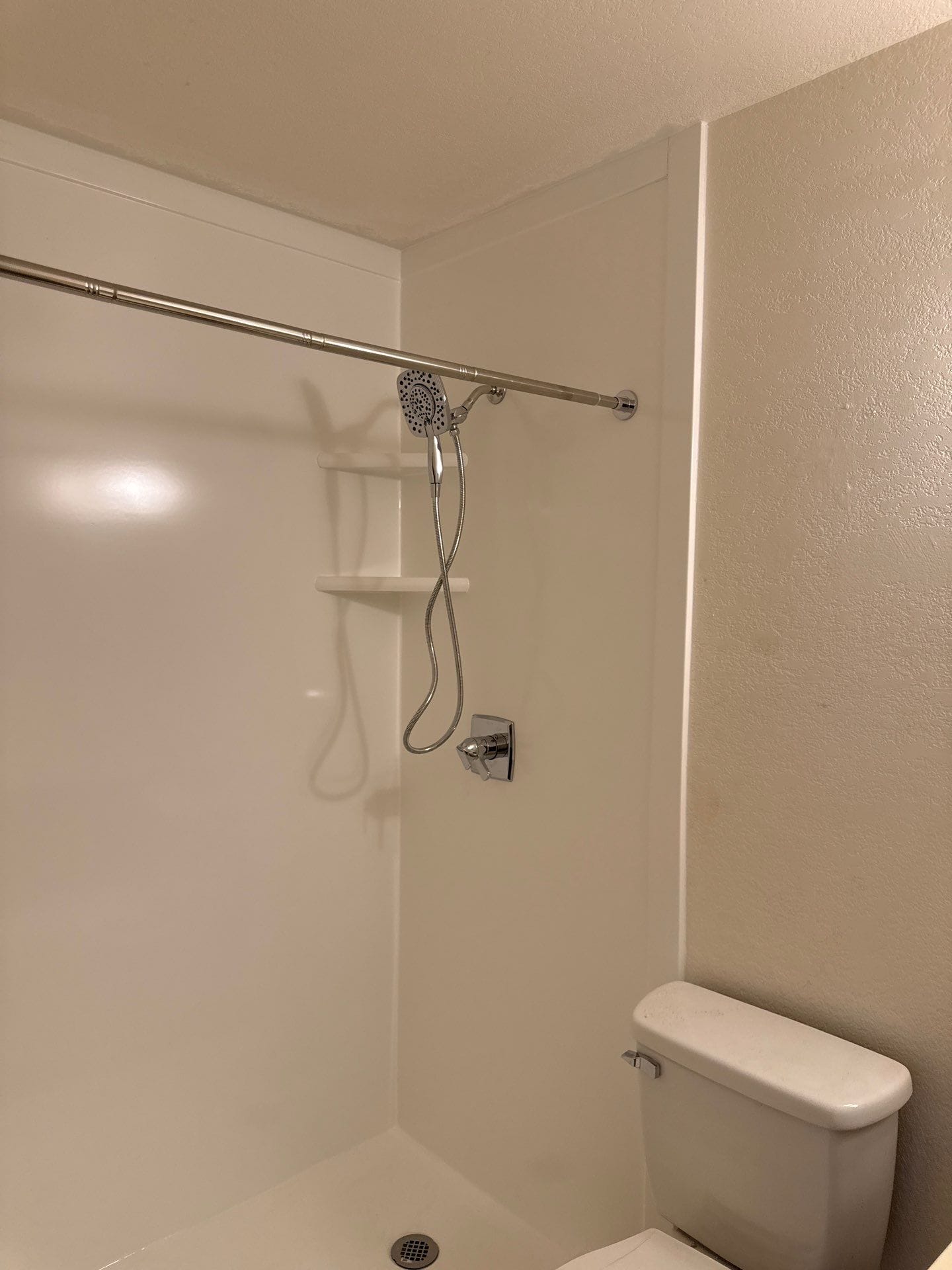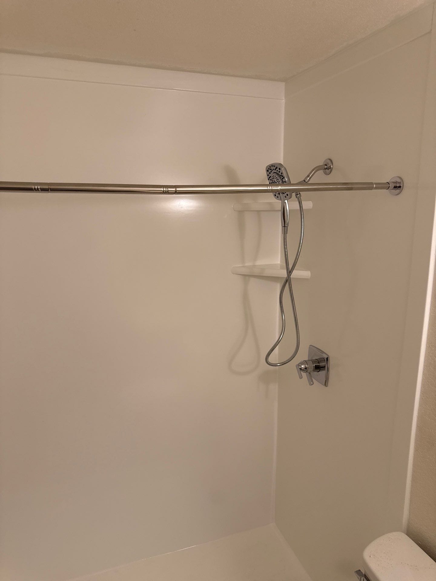 Installation included a full demolition of the tub area and wall tile, replacement with a seamless white composite shower system, and the addition of a slip-resistant shower base. A brushed nickel handheld fixture replaced the older brass unit, and a minimal double corner shelf provided storage. Although the customer originally requested a hinged glass door and privacy glass, photos confirm that the final installation included a temporary tension-mounted shower rod, with no glass door present. This suggests the glass component was either deferred or in fabrication. No seat or grab bar was installed, aligning with the customer's preference for a cleaner layout during the interim phase.