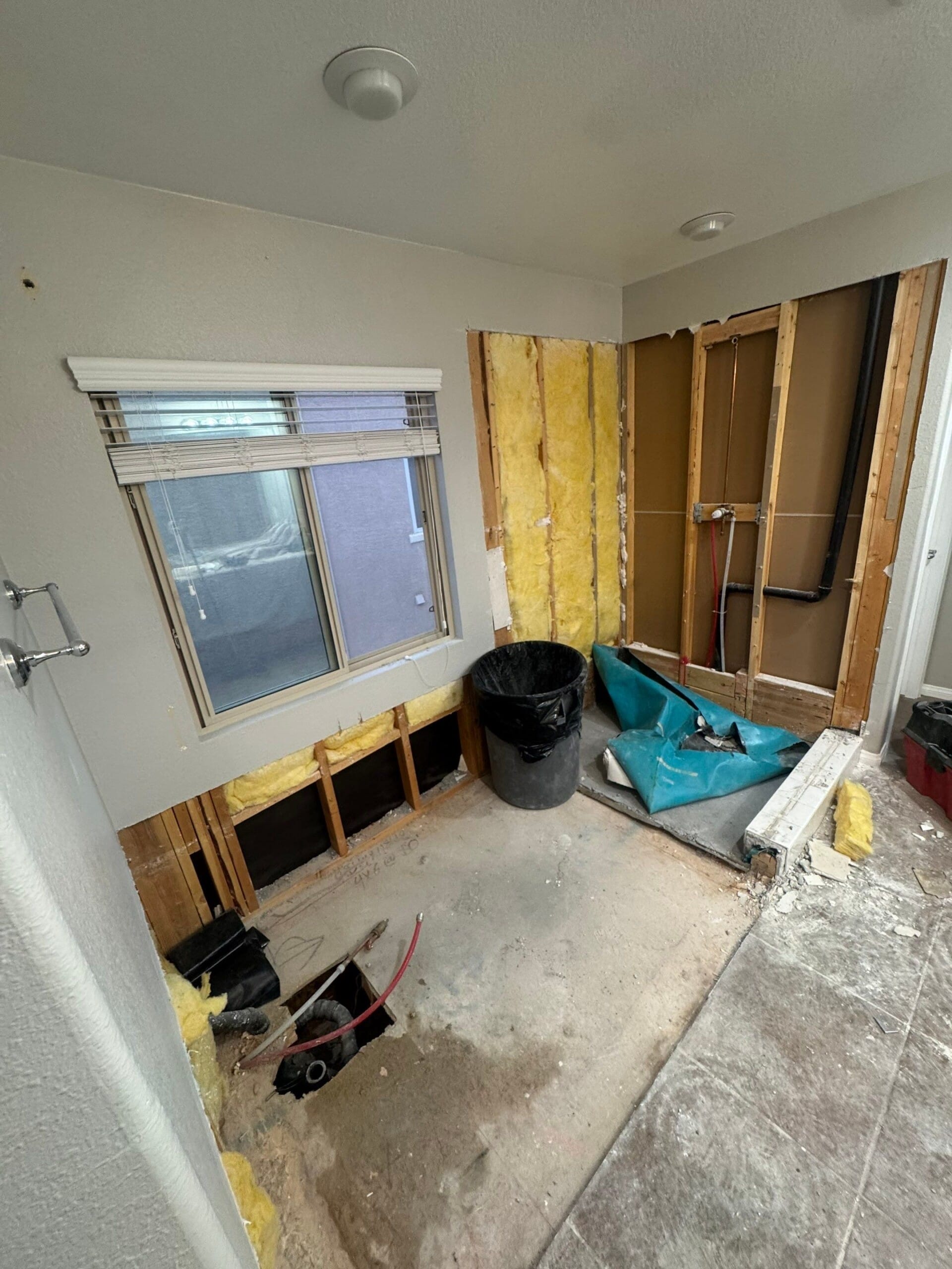 Installation began with a complete site teardown, as visible in the initial image showing exposed framing, insulation, and a relocated drain line. Plumbing was rerouted using PEX lines to accommodate the dual-head shower layout. Waterproof backer boards and a solid-core, anti-slip base were installed, followed by the custom-fit composite panels. Panel seams were sealed using 100% silicone to ensure long-term performance. The shower was built to accommodate future glass door installation, with all measurements taken during the final walkthrough prior to fabrication. Work was completed in two days following an 8–10 week lead time for material prep.