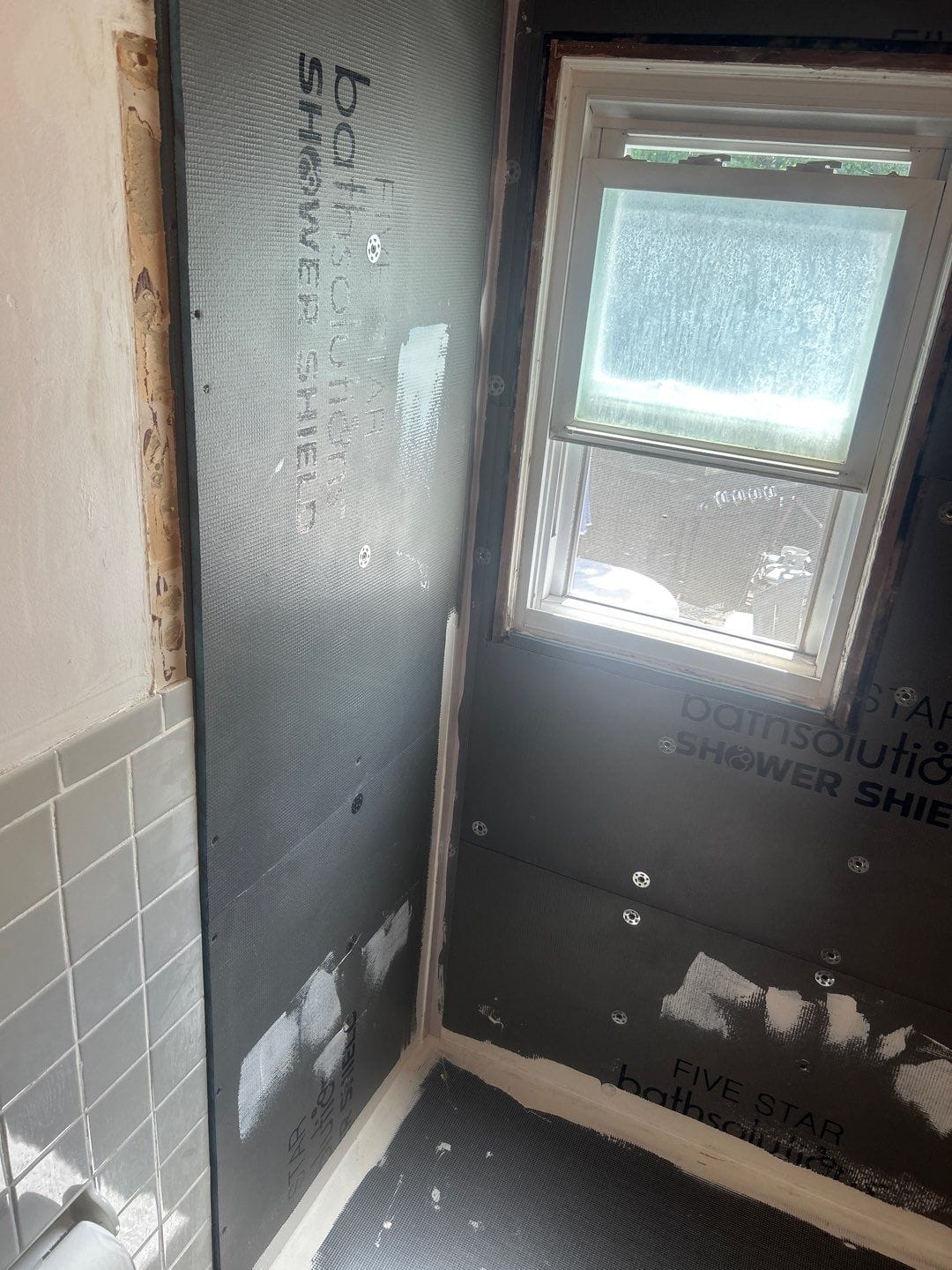 Installation began with protection of surrounding areas followed by demolition of the existing bathtub, tile walls, and outdated plumbing components. The crew installed updated plumbing lines, valves, and drainage connections before setting a new low threshold shower base designed for improved accessibility and slip resistance. Waterproof wall backing was installed before mounting the composite wall panels in large sections to create a seamless enclosure around the existing window opening. Shelving, seating, grab bars, fixtures, and the glass shower enclosure were then installed before final inspection and full site cleanup.