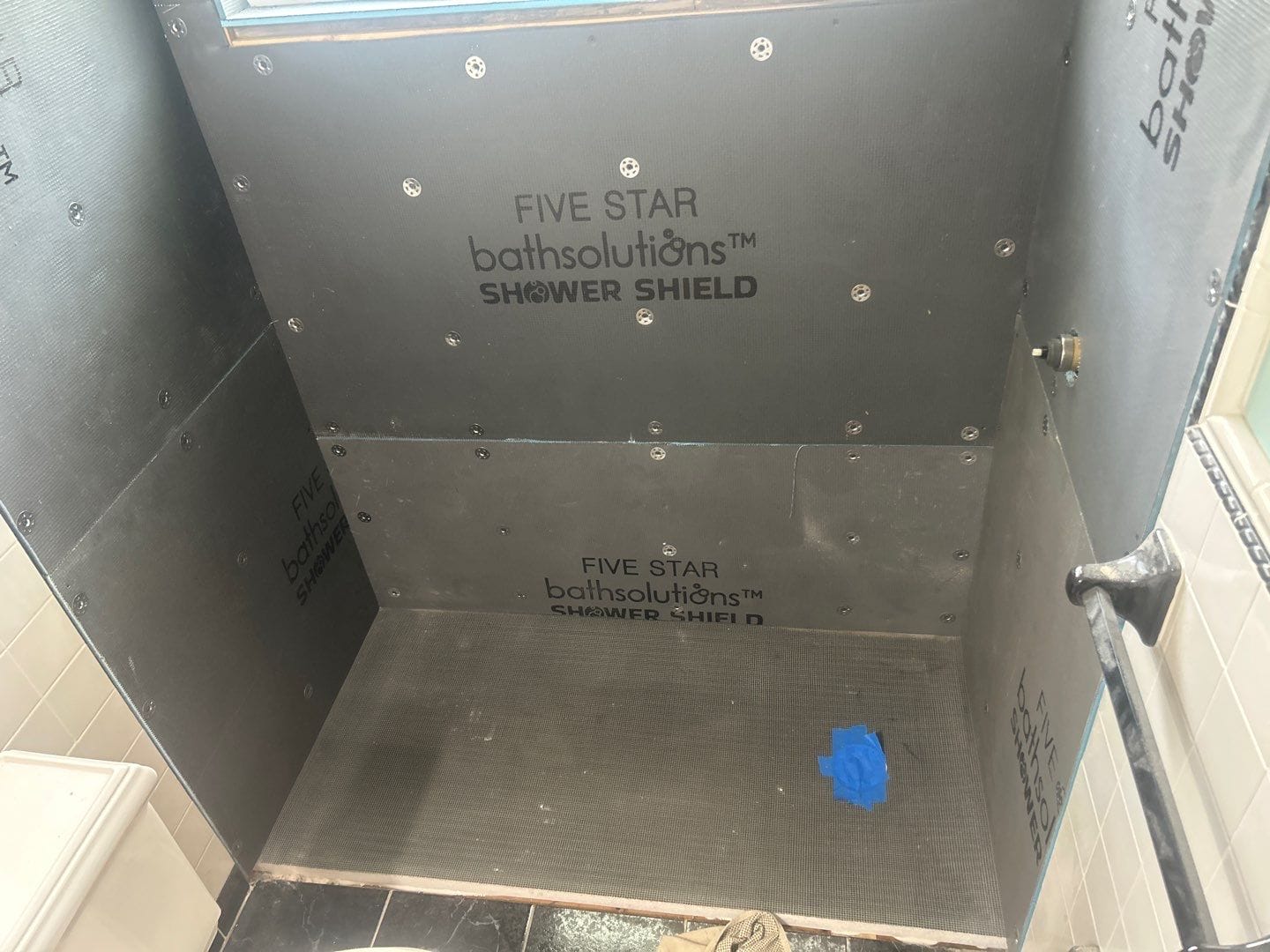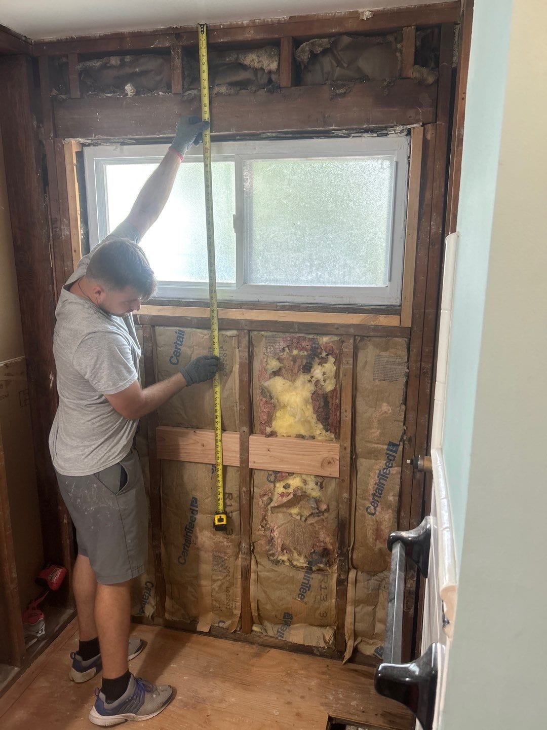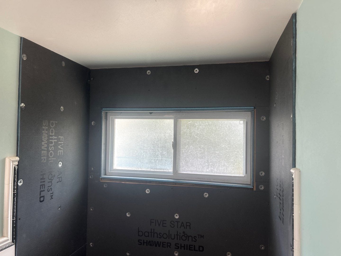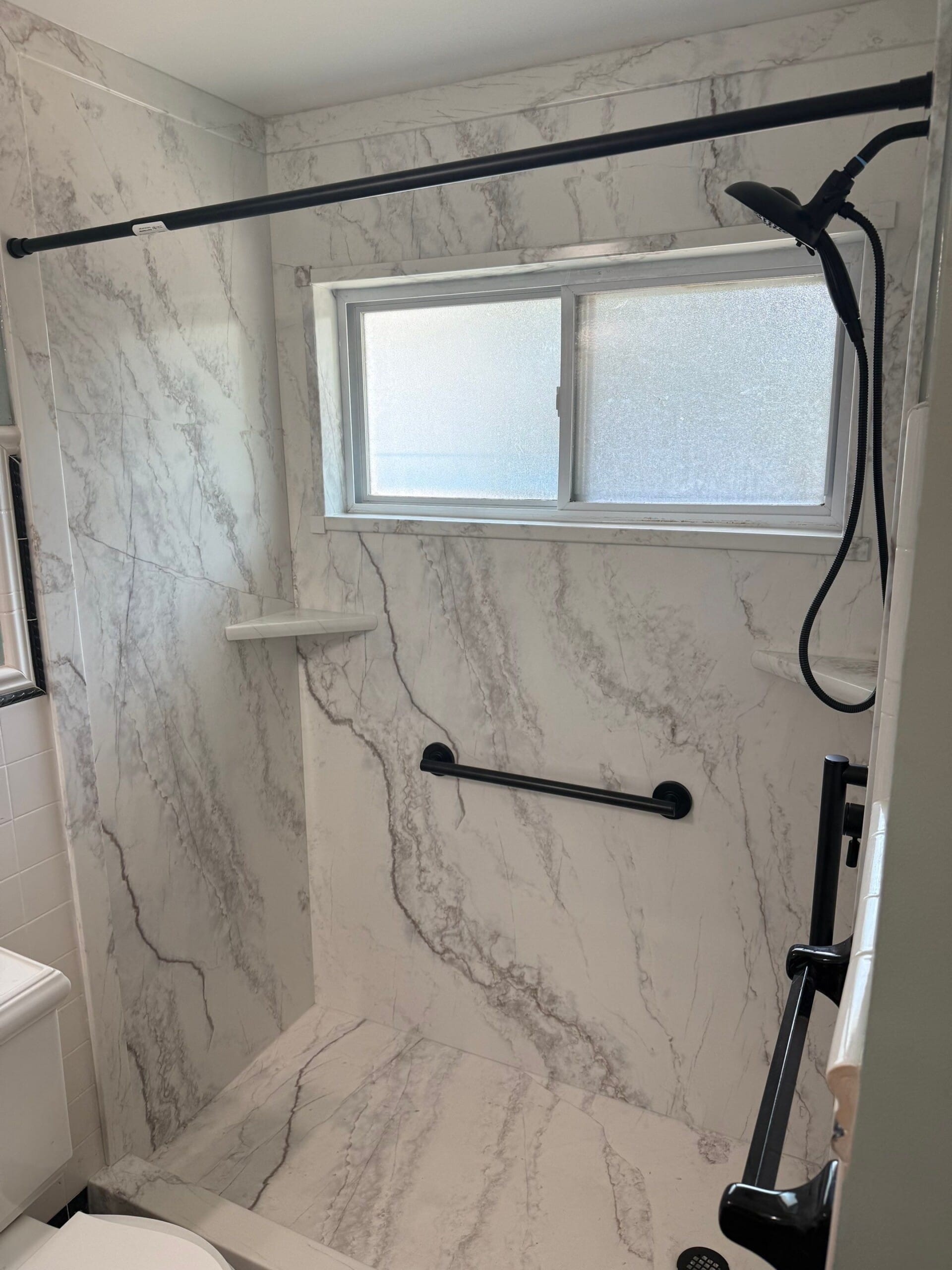 Installation began with protection of the surrounding bathroom areas followed by demolition of the existing bathtub, tile walls, and outdated plumbing components. The crew removed old drainage connections and installed updated plumbing lines and valves before setting a new low threshold shower base designed for improved accessibility and slip resistance. Waterproof wall backing was installed before mounting large composite wall panels that extend around the window opening to create a seamless enclosure. Shelving, safety supports, fixtures, and the glass shower door were then installed before final inspection and site cleanup.