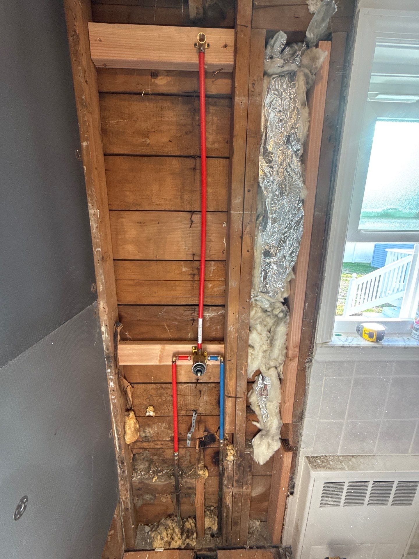 Installation followed a structured remodeling process beginning with site preparation and removal of the existing bathtub and surrounding wall materials. The crew protected the home before demolition and removed outdated plumbing components before installing updated lines and valves. A new shower base and waterproof backer system were installed to support the wall structure and protect the surrounding framing. Large composite wall panels were then mounted to create a seamless enclosure, followed by installation of shelving, fixtures, support bars, and a sliding glass shower door system. Final inspection and cleanup were completed before project completion.