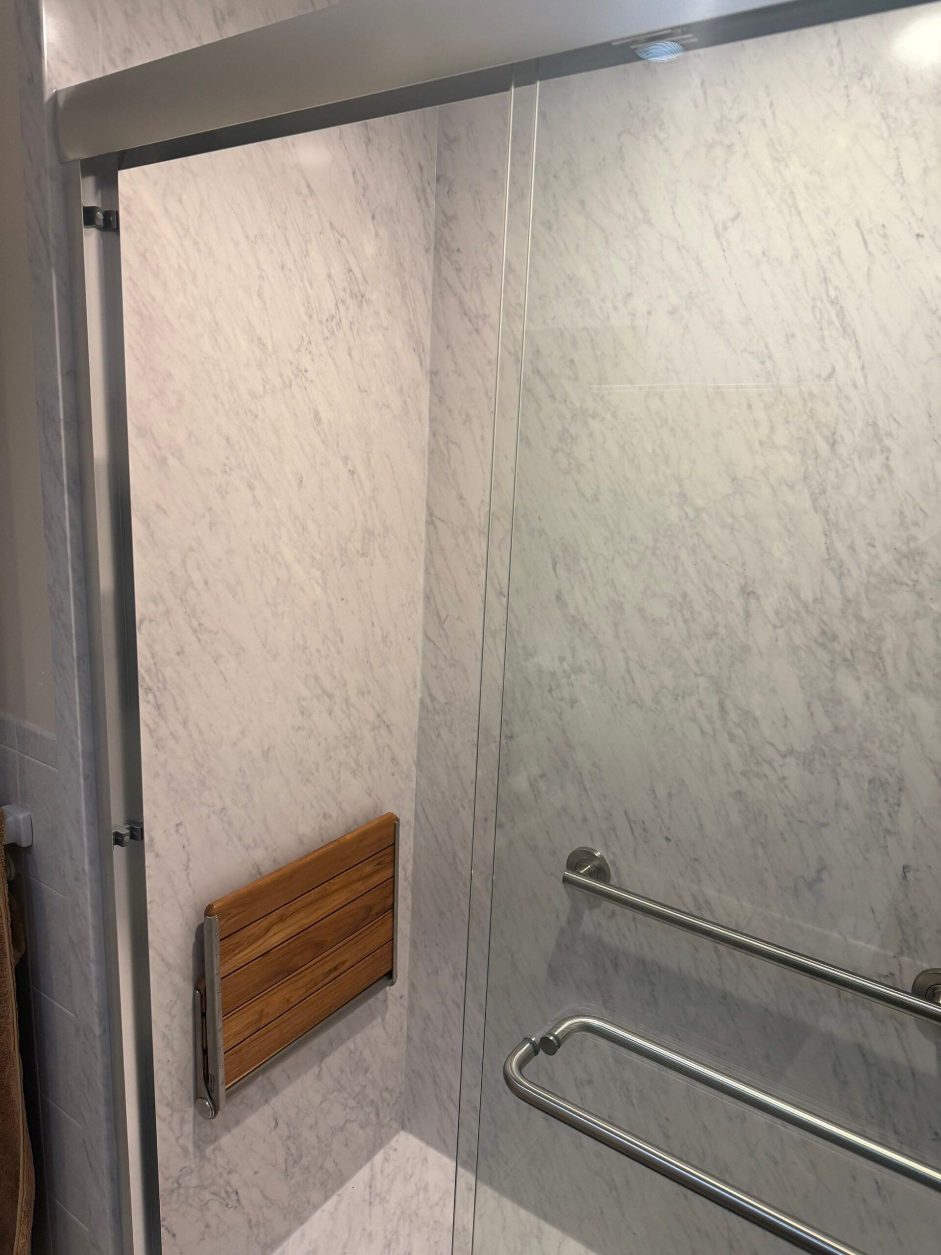 The Five Star Bath Solutions Representative presented a grout free composite wall system designed to eliminate the maintenance concerns associated with traditional tile installations. The wall panels feature a natural marble inspired finish that provides a modern, stone like appearance while remaining non porous and easy to maintain. Brushed nickel fixtures were selected to complement the wall design, including a handheld shower system for improved flexibility during use. Storage was incorporated through corner shelving, and safety features were integrated into the design to support stability and comfort within the shower space. The company emphasized a bathroom focused remodeling approach that prioritizes durability, moisture protection, and long term performance.