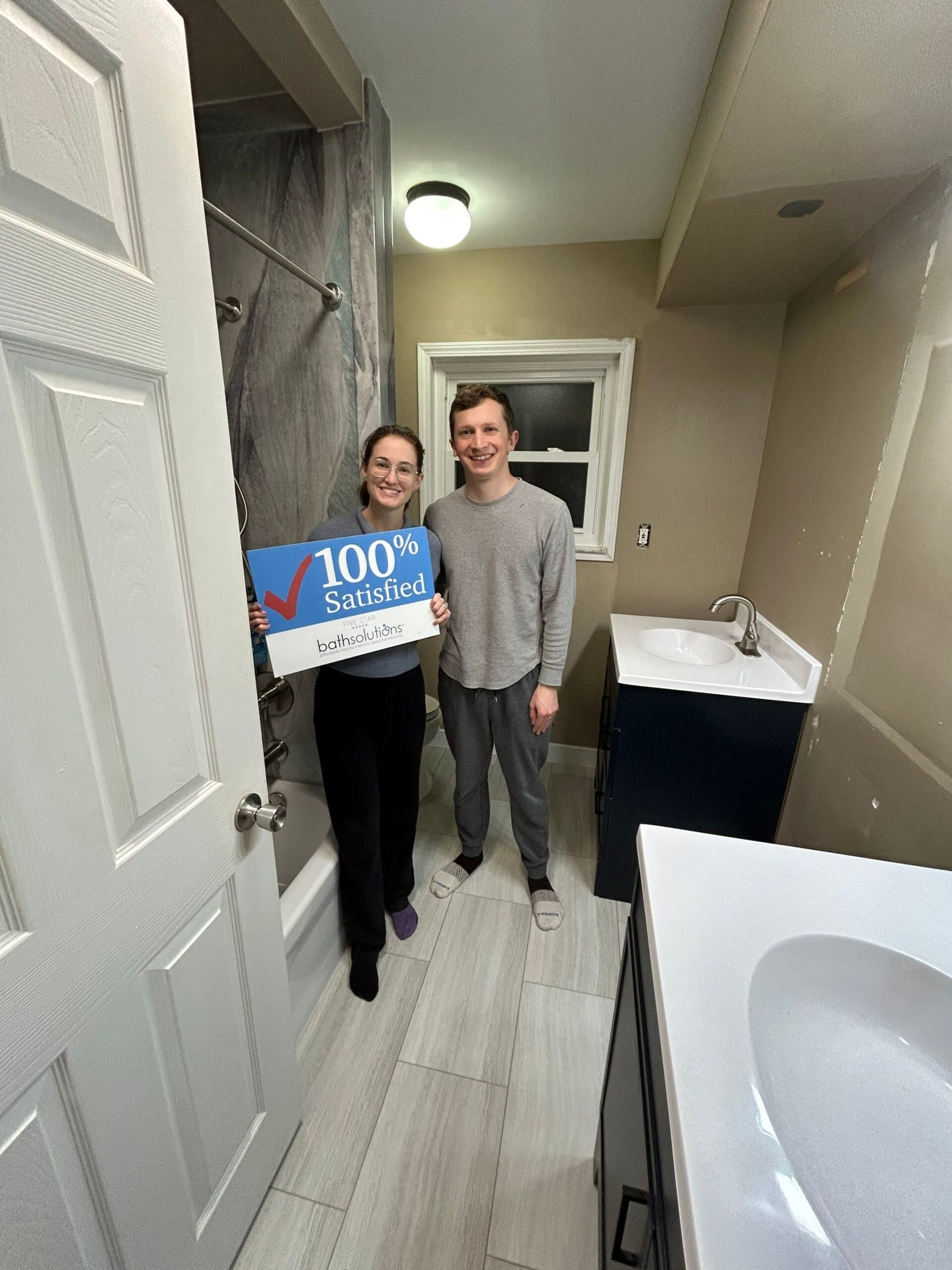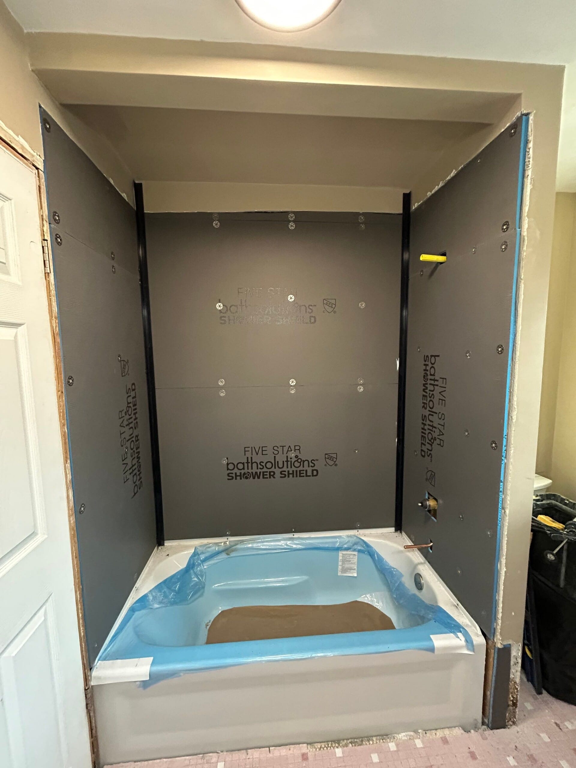 Installation was completed by the Five Star Bath Solutions team through a structured renovation process. The existing bathtub and wall materials were removed, the framing and plumbing areas were inspected, and waterproof backing materials were installed to create a stable foundation for the new system. A new white acrylic bathtub with a reinforced base was installed along with the composite wall panels, plumbing fixtures, shelving, and hardware. Plumbing components were updated during the process, and the shower head height was adjusted to improve functionality. The installation process included preparation, protection of surrounding areas, and final cleanup.