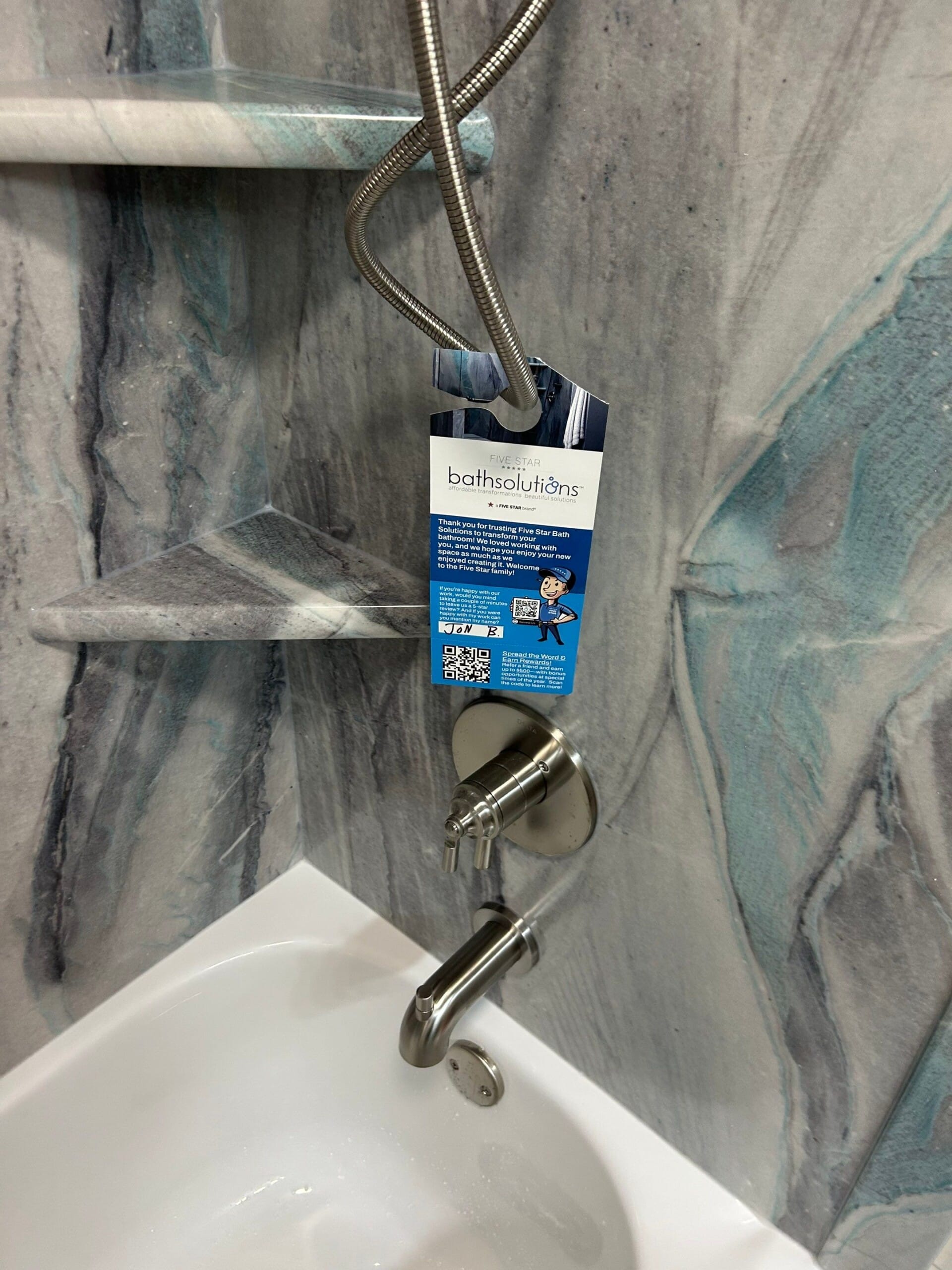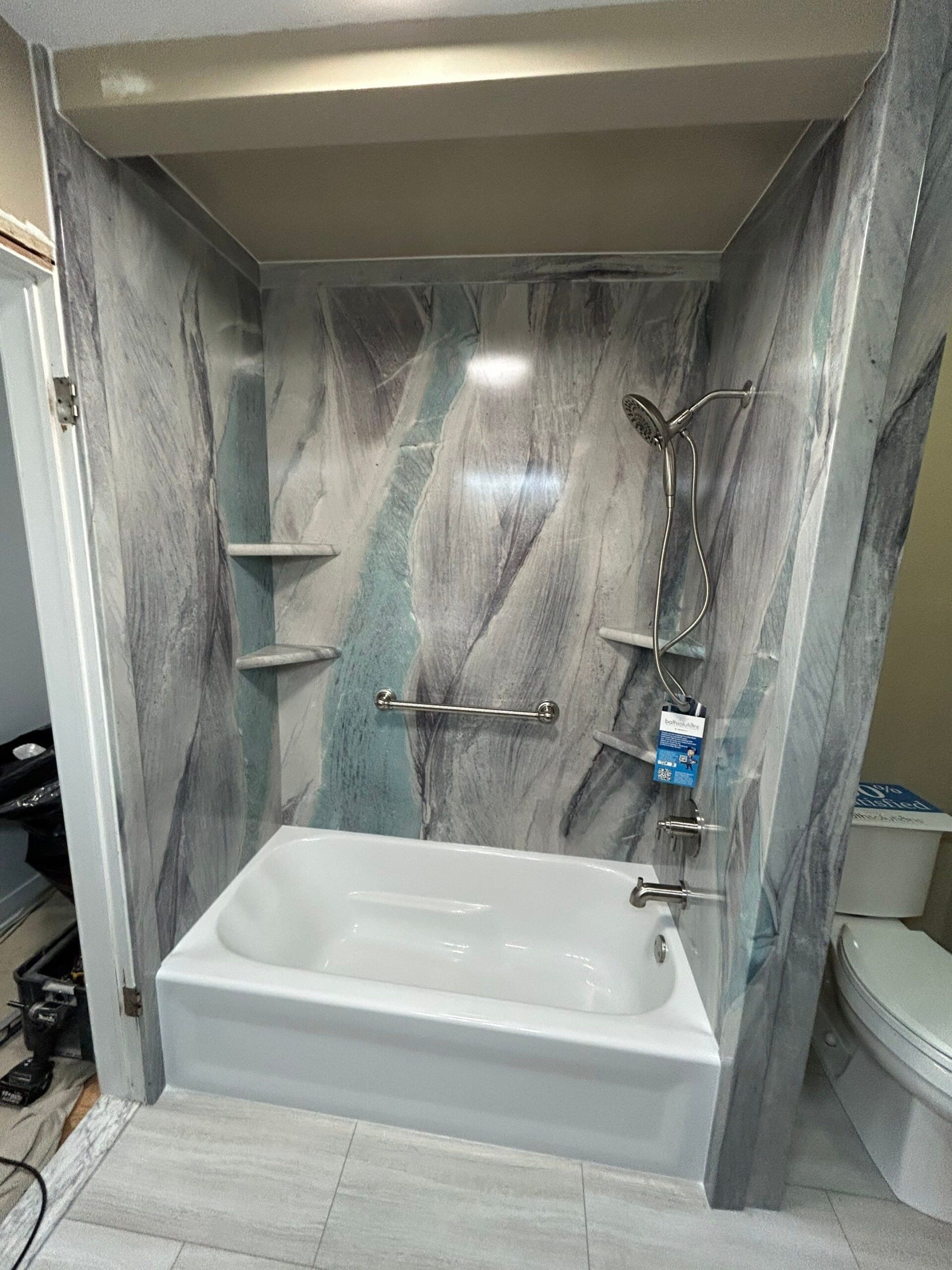 The Five Star Bath Solutions Representative presented a grout-free composite wall system designed for wet-area durability and low-maintenance care. The selected wall pattern features a marble-inspired design with subtle gray and blue tones that adds visual depth while maintaining a bright and clean appearance within the space. Brushed nickel fixtures were selected to complement the updated wall pattern and provide a cohesive finish throughout the bathing area. The new system includes integrated corner shelving for storage, a handheld shower system for flexibility during use, and a horizontal safety grab bar positioned along the back wall for additional stability.
