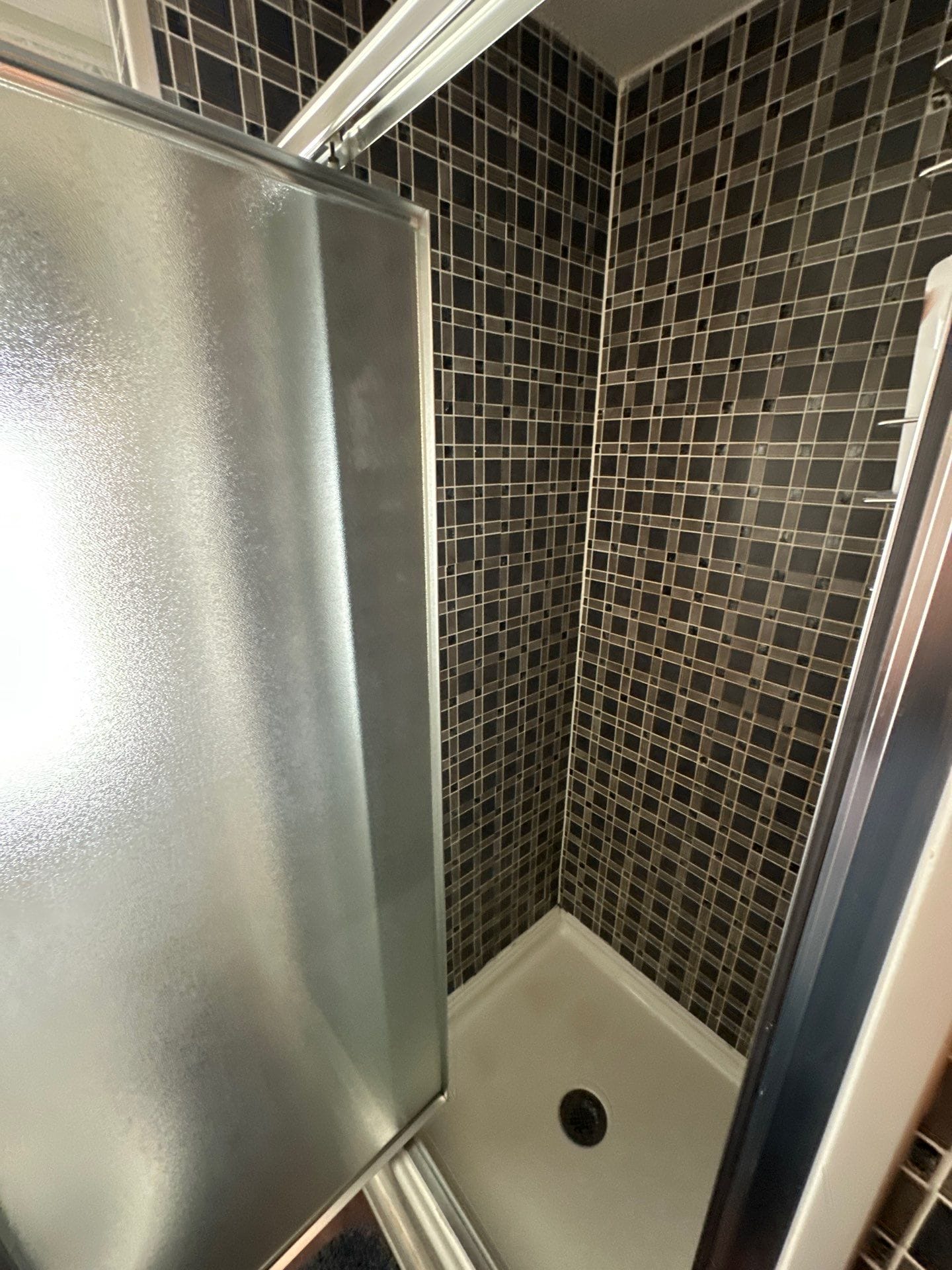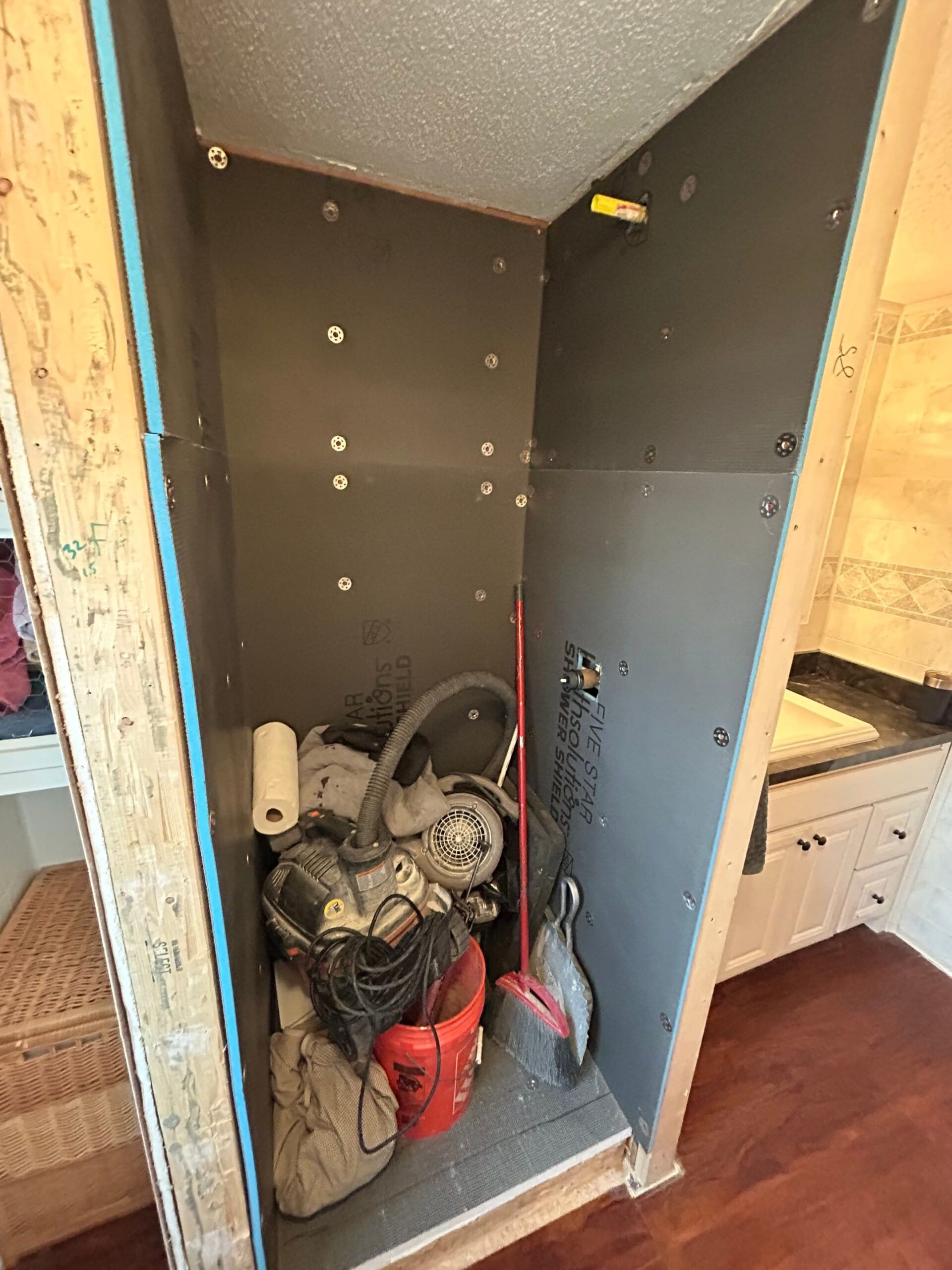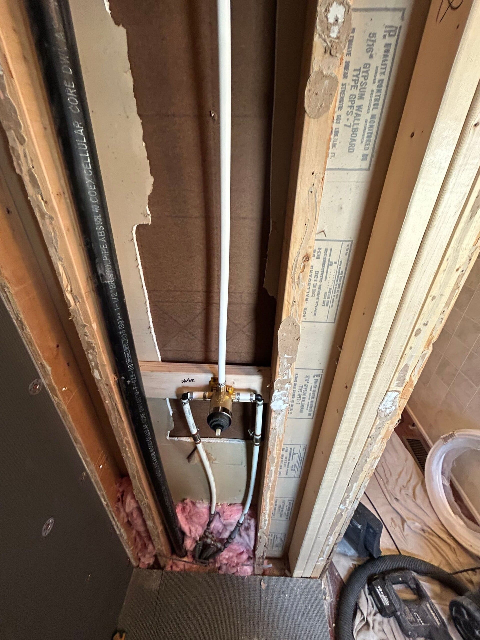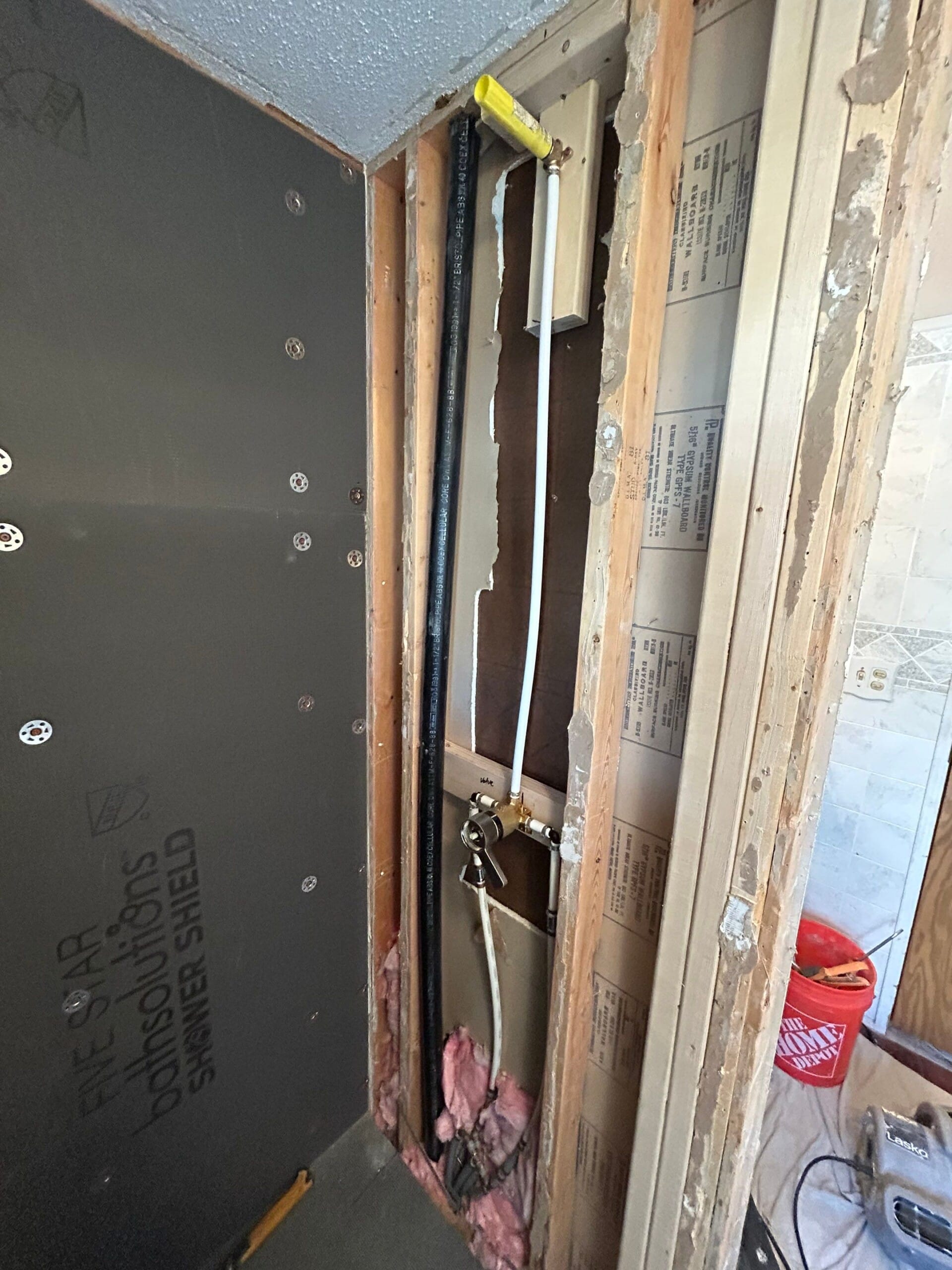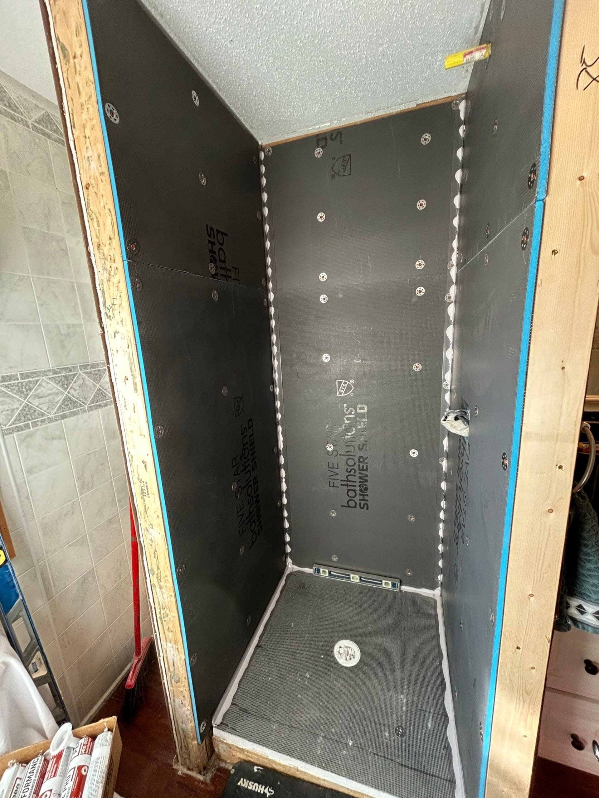 Scot outlined the full process, beginning with floor protection, complete demo to studs, and inspection of subfloor and framing. He detailed the installation of a thermal-insulated non-slip base and proprietary Shower Shield backing made from cement-coated closed-cell foam. Quad-lock corners and antimicrobial silicone sealant were used to prevent moisture intrusion and maintain long-term durability. PEX plumbing was upgraded and brought to code before final wall panel and fixture placement.